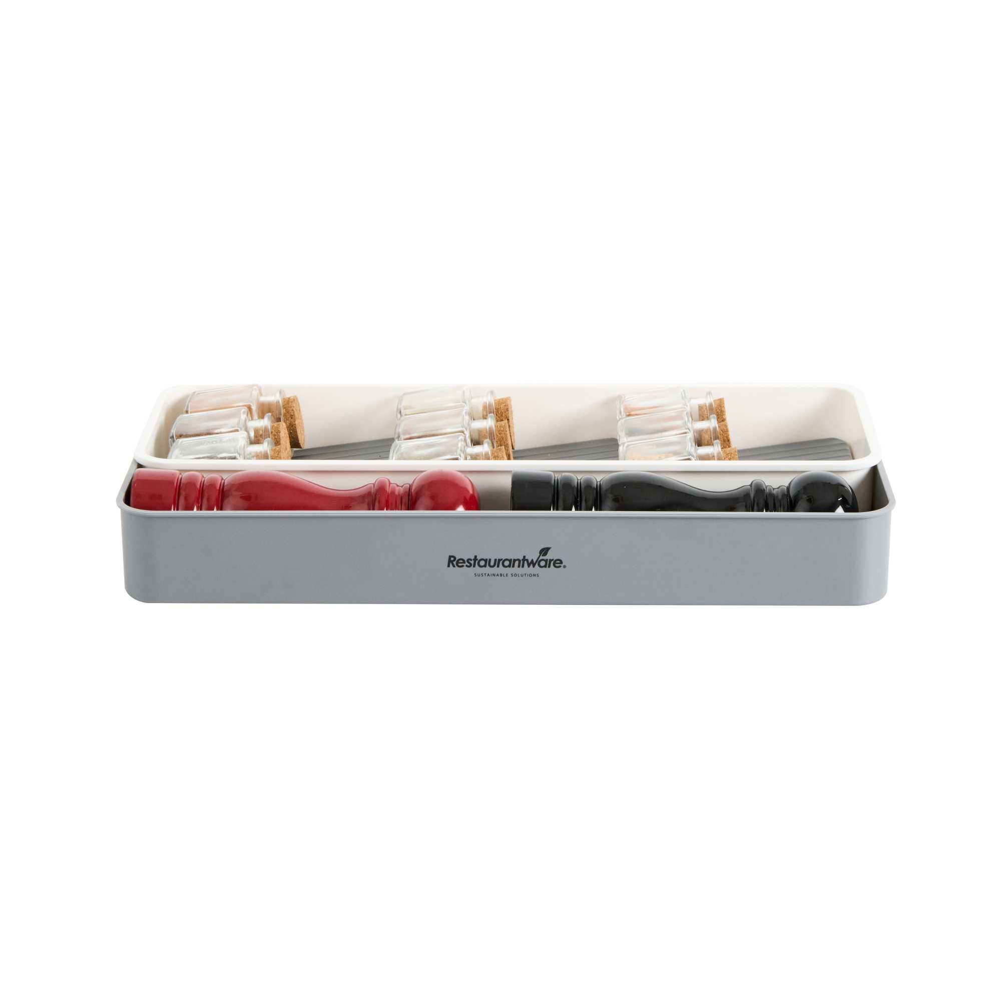 Optimize your kitchen storage with versatile spice organization. The Clean Tek Professional Gray and White Plastic Expandable 3-Tier Spice Drawer Organizer features an expandable design that adapts to accommodate various spice jar sizes. Its sleek gray color seamlessly complements modern kitchen aesthetics. This tiered spice organizer maximizes drawer storage space by utilizing its compact size, measuring 15.55 inches in length, 5.51 inches in width, and 2.17 inches in height, allowing you to efficiently manage your kitchen tools and spices. The tiered design prevents jars from rolling and ensures labels remain visible, enhancing your efficiency in busy foodservice settings. With non-slip feet, this spice jar holder stays securely in place. Suitable for drawers with a minimum height of 3.25 inches, this organizer fits various drawer dimensions, expanding up to 8.93 inches. Each order includes 1 organizer.