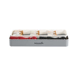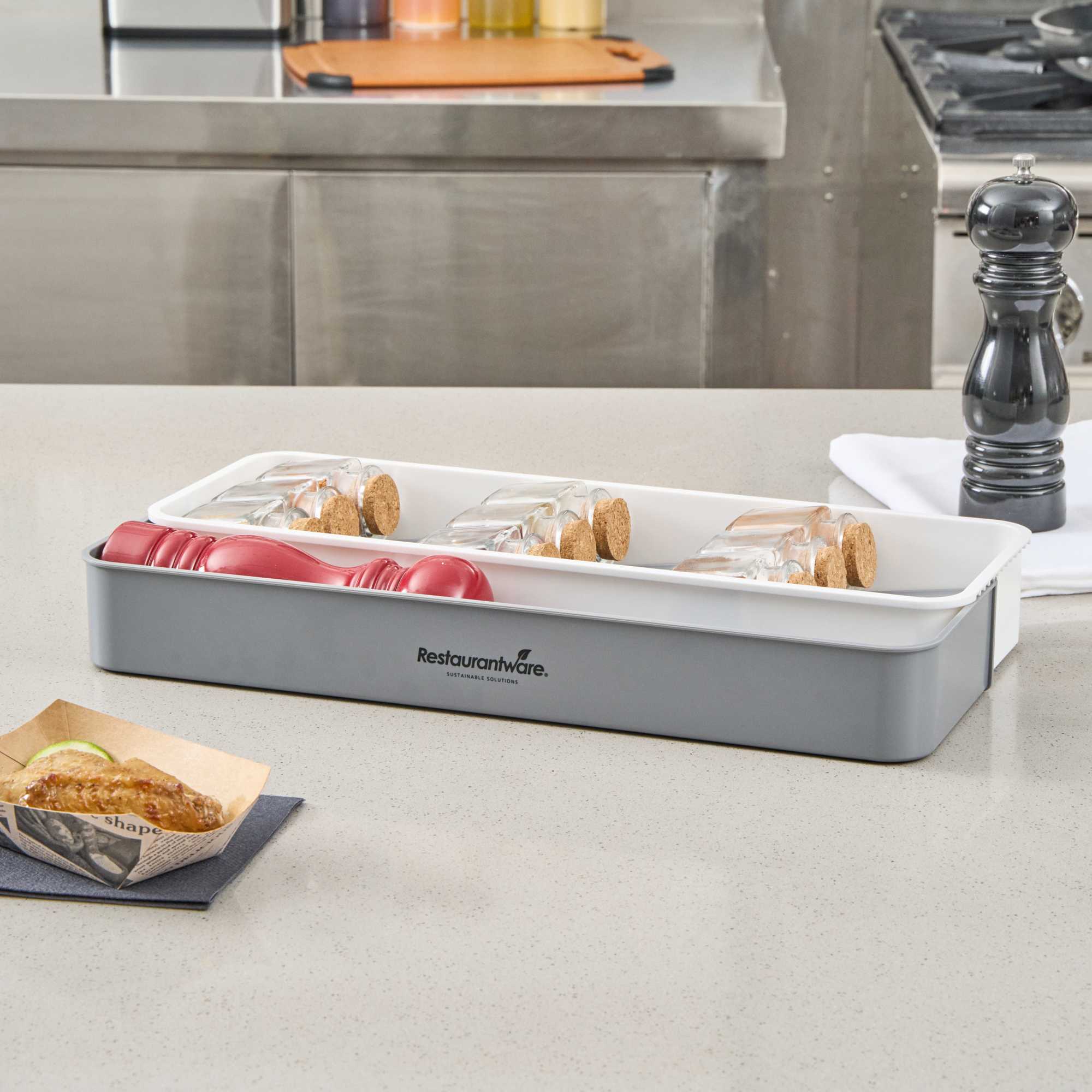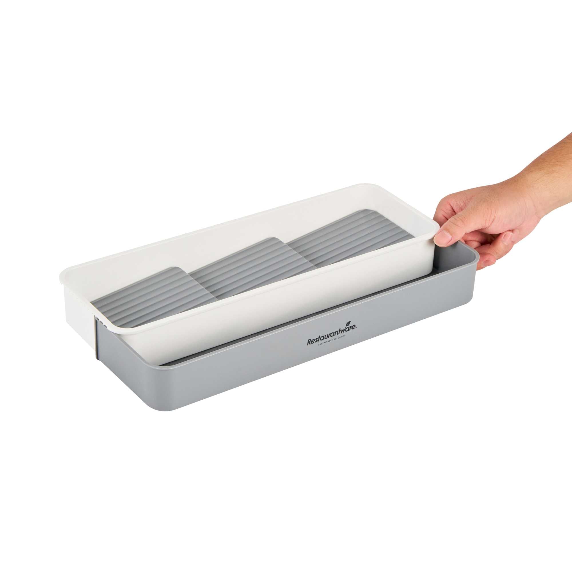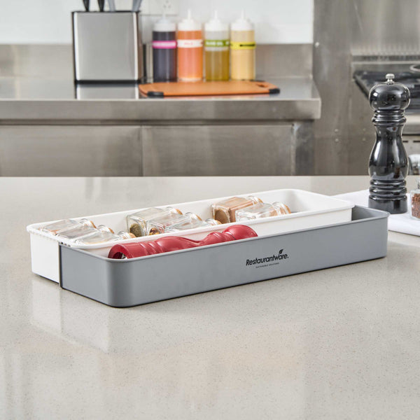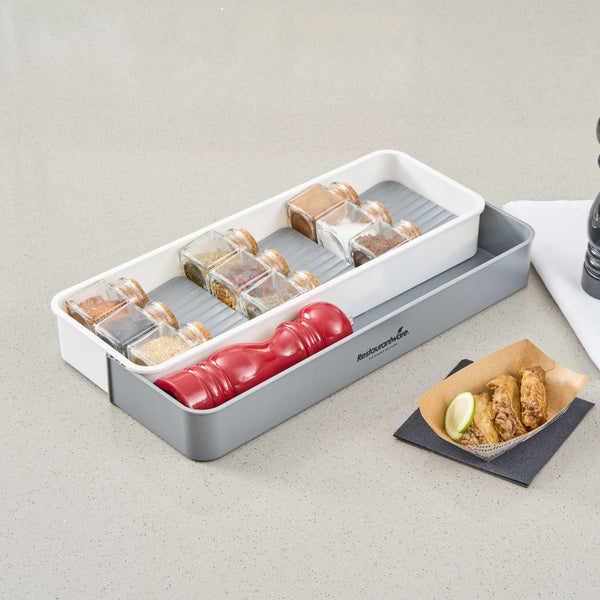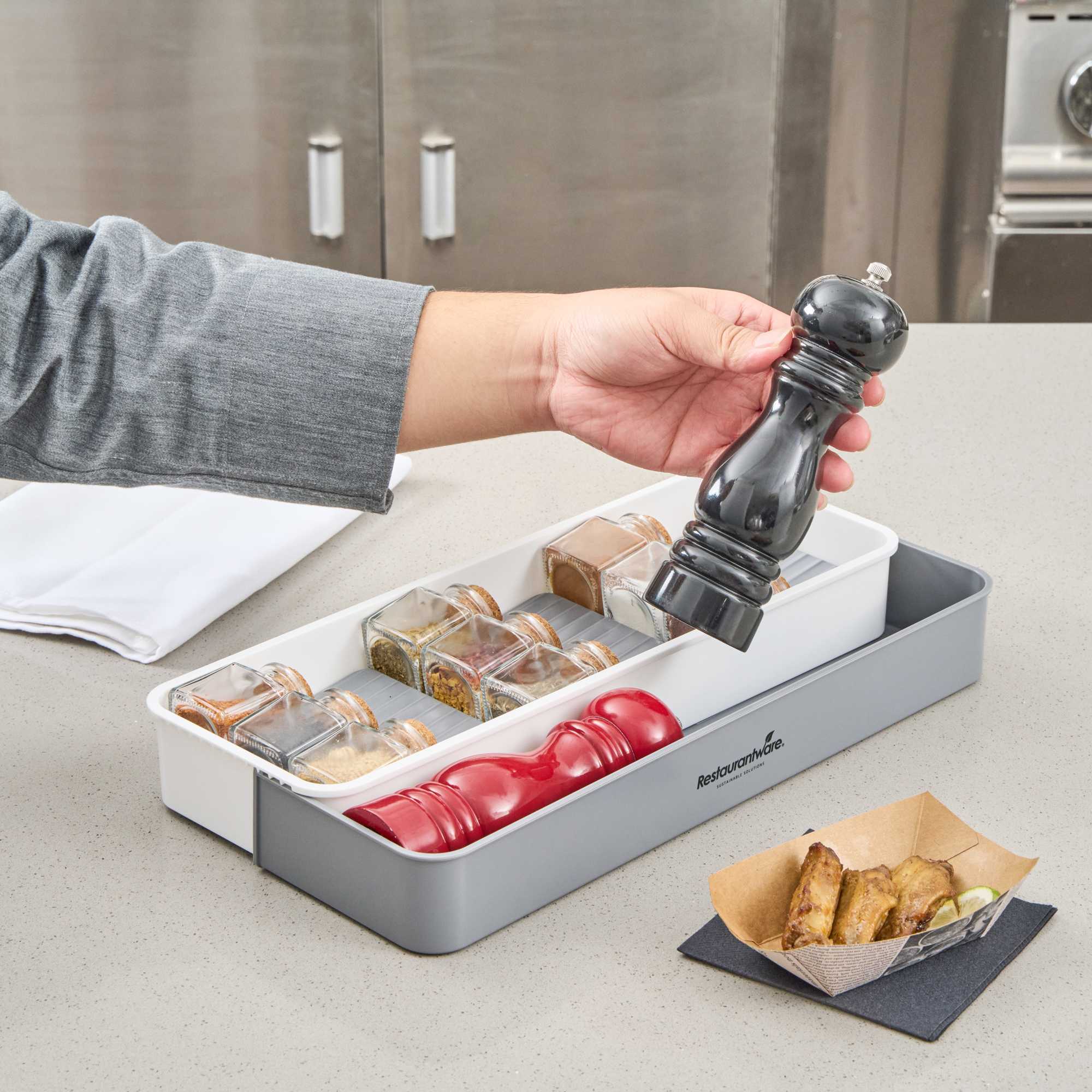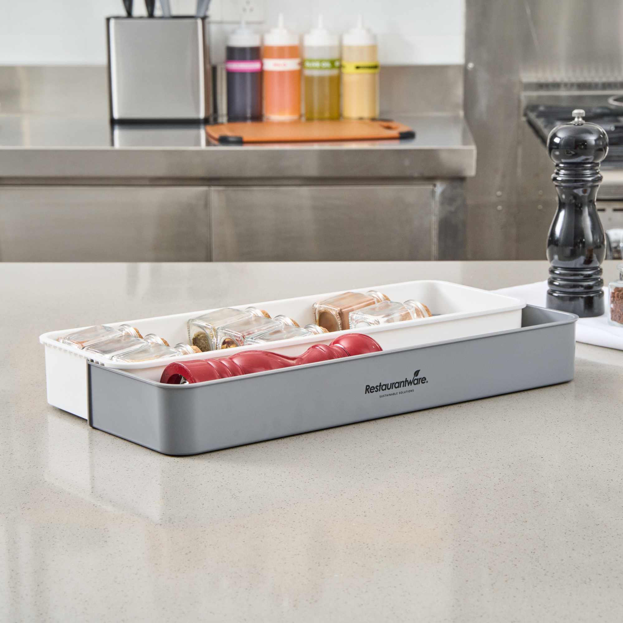 Optimize your kitchen storage with versatile spice organization. The Clean Tek Professional Gray and White Plastic Expandable 3-Tier Spice Drawer Organizer features an expandable design that adapts to accommodate various spice jar sizes. Its sleek gray color seamlessly complements modern kitchen aesthetics. This tiered spice organizer maximizes drawer storage space by utilizing its compact size, measuring 15.55 inches in length, 5.51 inches in width, and 2.17 inches in height, allowing you to efficiently manage your kitchen tools and spices. The tiered design prevents jars from rolling and ensures labels remain visible, enhancing your efficiency in busy foodservice settings. With non-slip feet, this spice jar holder stays securely in place. Suitable for drawers with a minimum height of 3.25 inches, this organizer fits various drawer dimensions, expanding up to 8.93 inches. Each order includes 12 organizers.