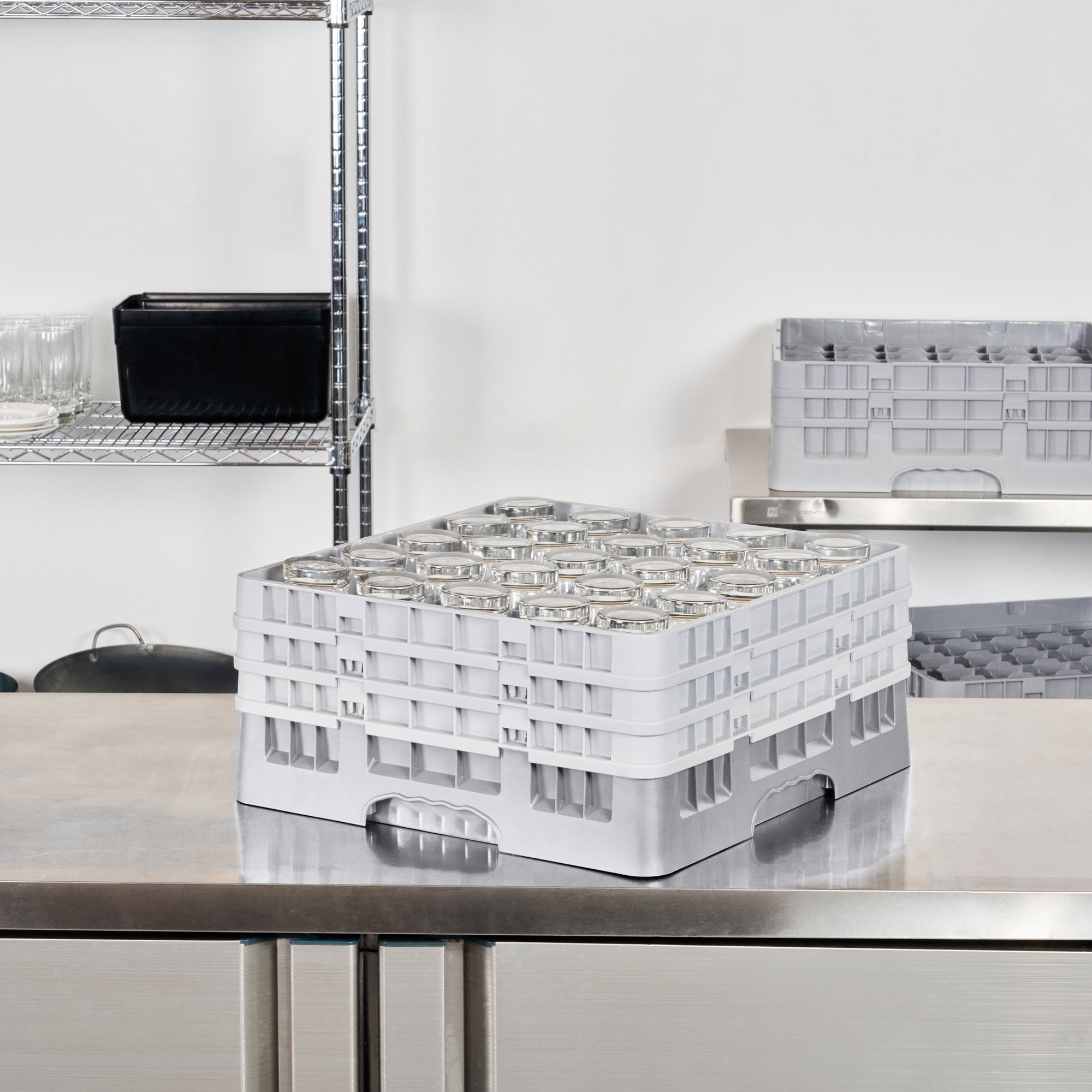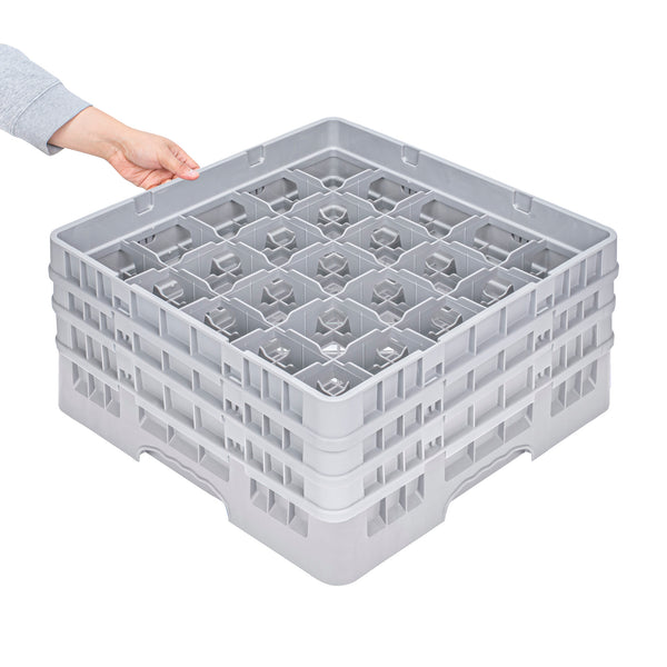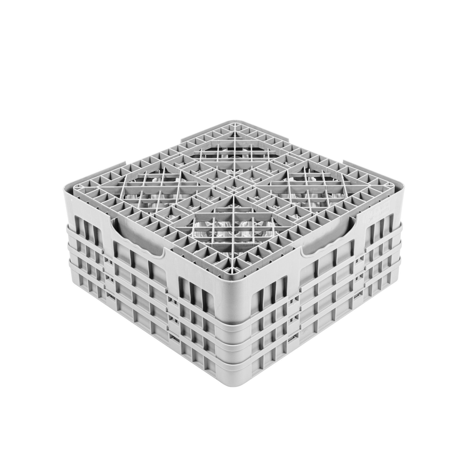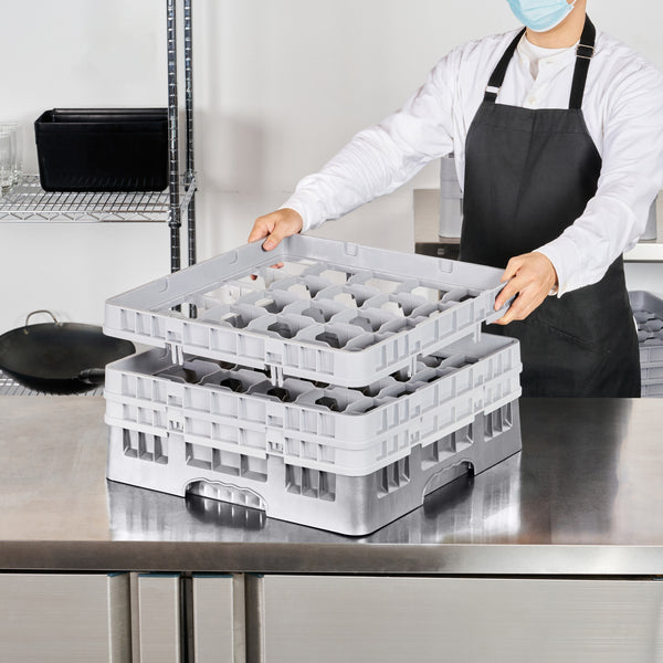 Elevate your glassware storage solutions with our Clean Tek Professional Gray Glass Rack. Designed with 25 compartments, this dishwasher rack ensures each glass is securely stored and cleaned efficiently. Featuring 1 full drop extender and 2 half drop extenders, this compartment rack adapts to hold varying glass heights, making it the ideal barware organizer. Crafted from durable PP, this commercial glass rack withstands the rigors of daily use in any busy kitchen. The easy-to-handle design of this rack simplifies the process of organizing and transporting glassware. With open interior compartments, this rack promotes optimal water and air circulation for superior cleaning results. Solid external walls provide robust protection, keeping glassware safe from accidental knocks and spills. Measuring 19.69 inches in length by 19.69 inches in width by 8.86 inches in height, this rack fits seamlessly into standard commercial dishwashers. Sold in a 1 count box.
