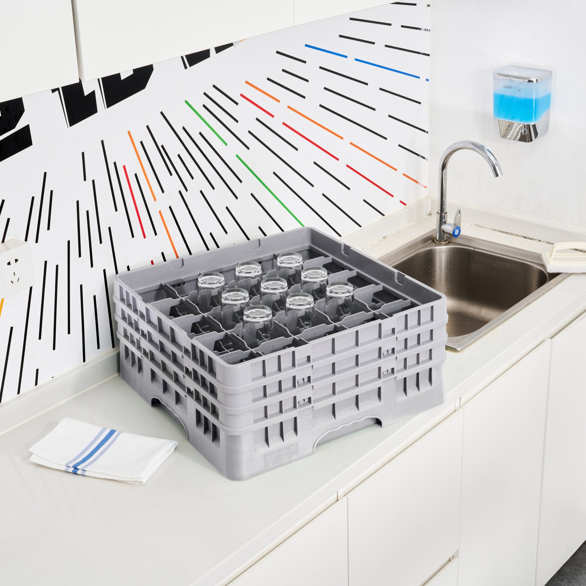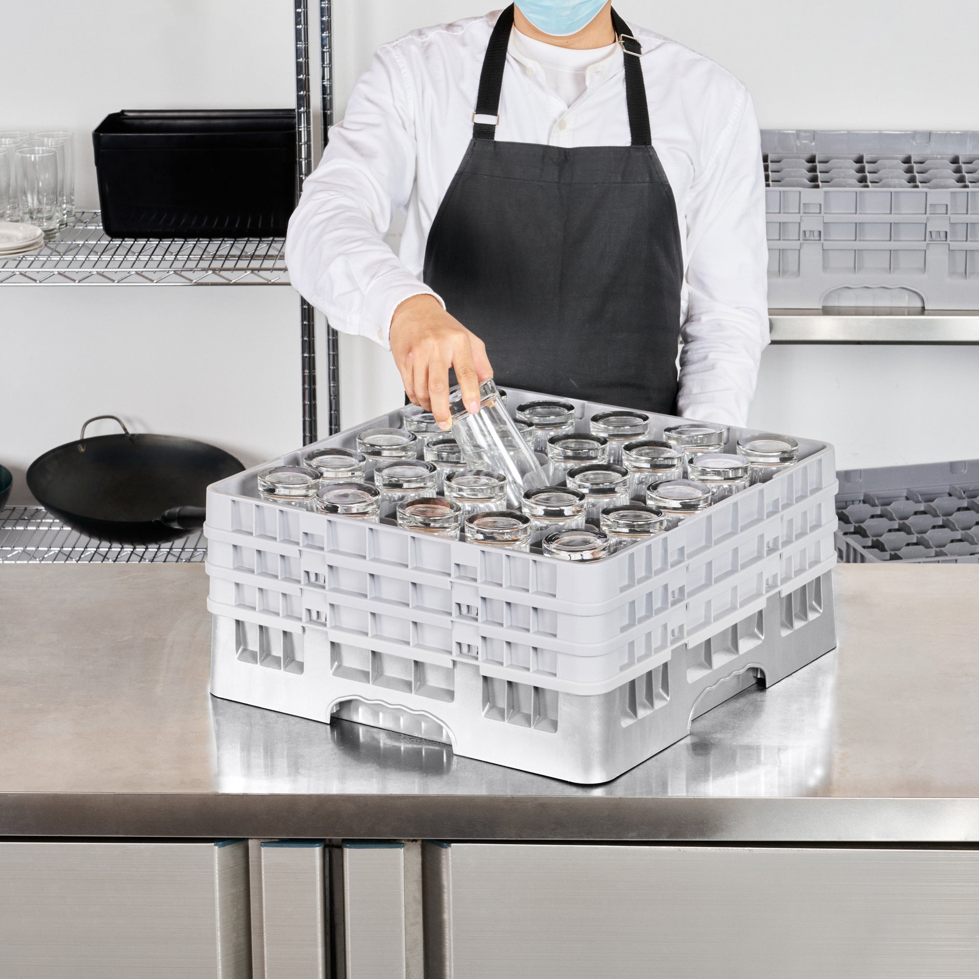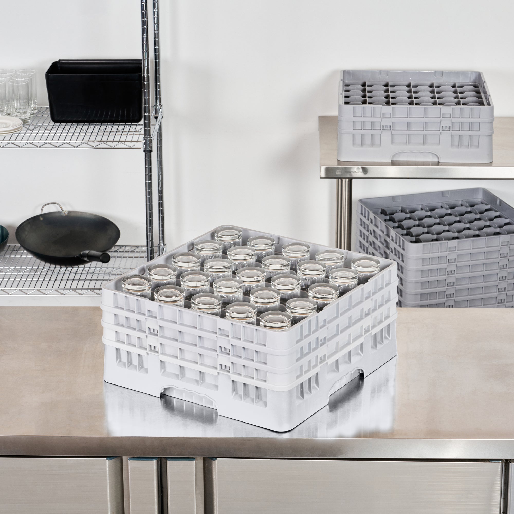 Elevate your glassware storage solutions with our Clean Tek Professional Gray Glass Rack. Designed with 25 compartments, this dishwasher rack ensures each glass is securely stored and cleaned efficiently. Featuring 1 full drop extender and 2 half drop extenders, this compartment rack adapts to hold varying glass heights, making it the ideal barware organizer. Crafted from durable PP, this commercial glass rack withstands the rigors of daily use in any busy kitchen. The easy-to-handle design of this rack simplifies the process of organizing and transporting glassware. With open interior compartments, this rack promotes optimal water and air circulation for superior cleaning results. Solid external walls provide robust protection, keeping glassware safe from accidental knocks and spills. Measuring 19.69 inches in length by 19.69 inches in width by 8.86 inches in height, this rack fits seamlessly into standard commercial dishwashers. Sold in a 1 count box.