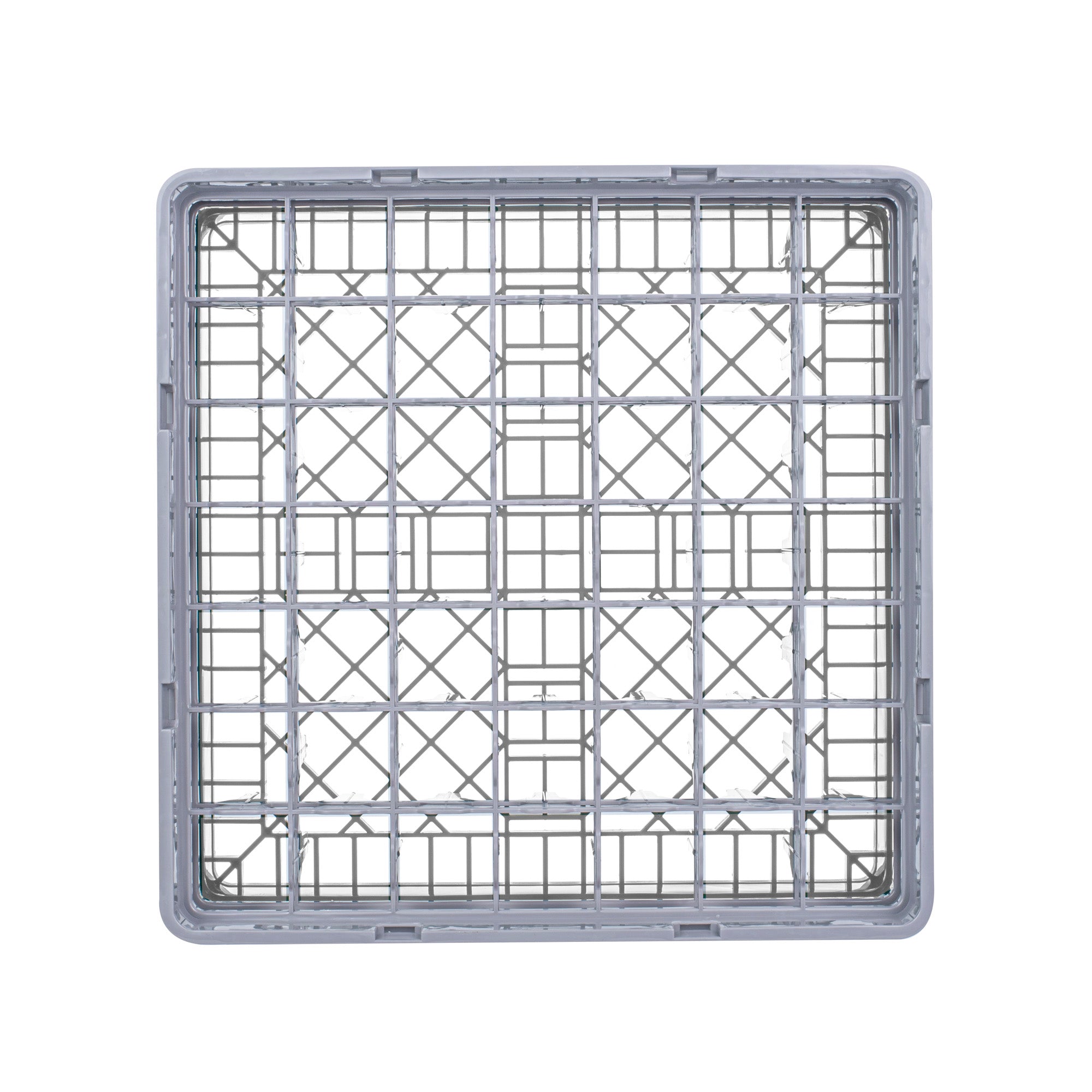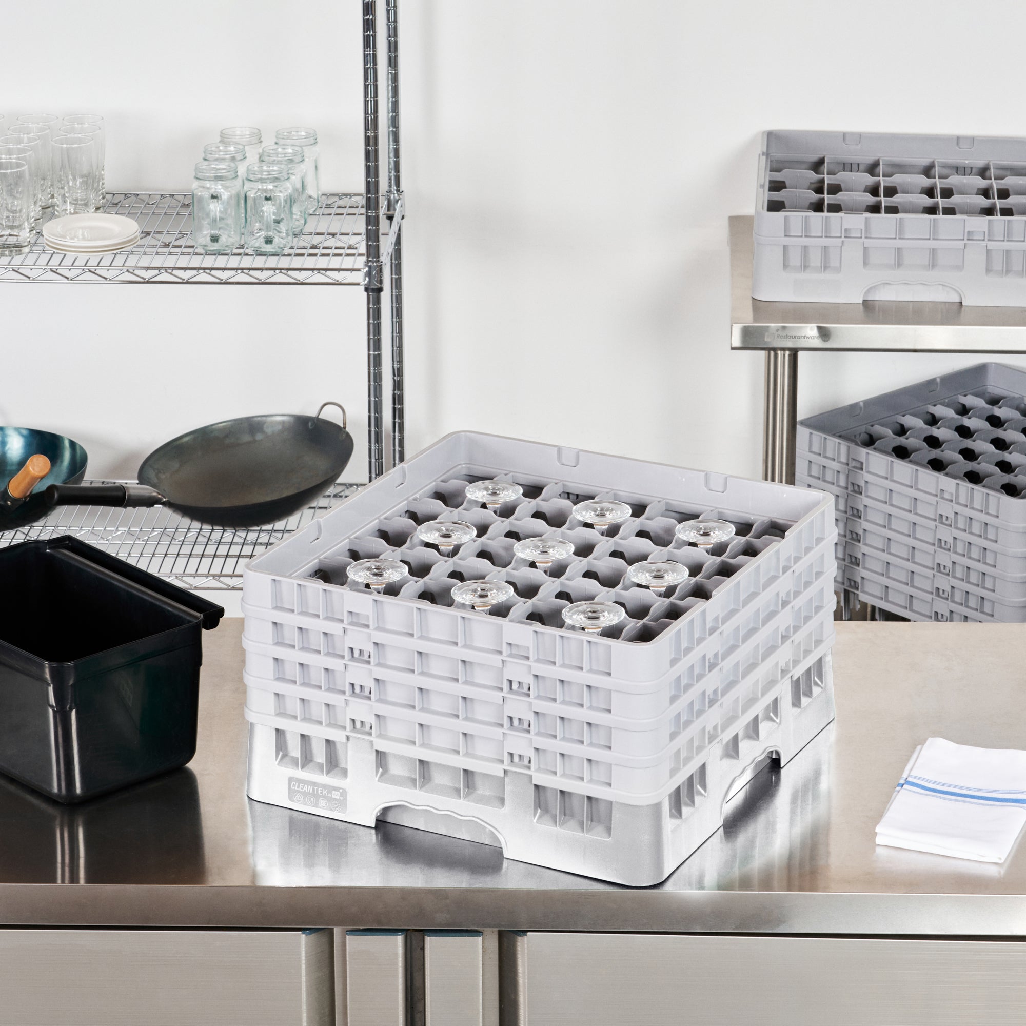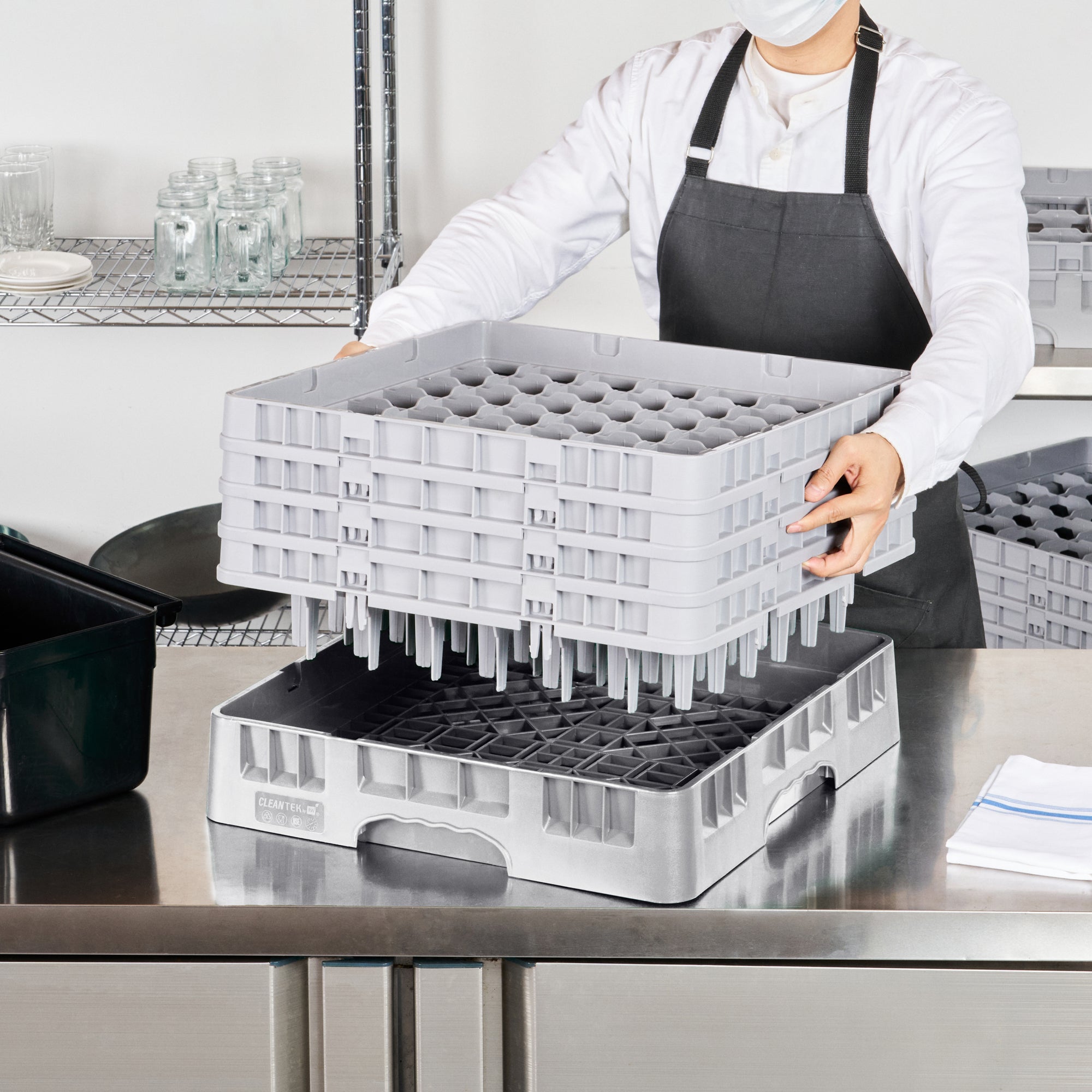 Effortlessly organize and protect your glassware with our Clean Tek Professional Gray Glass Rack. This commercial glass rack features 49 compartments, ensuring each piece of glassware has its own secure spot. Designed with an easy-to-handle structure, this dishwasher rack simplifies the transport of your glassware from the bar to the kitchen. Featuring a full drop extender and three half drop extenders, this compartment rack offers versatile storage solutions for various glass sizes. Constructed from durable PP, this barware organizer ensures long-lasting use and reliability. The open interior compartments make loading and unloading glassware a breeze, while the solid external walls provide added protection during handling. Measuring 19.69 inches in length by 19.69 inches in width by 10.51 inches in height, this glass rack is perfectly sized for commercial use. Sold in a 1 count box.
