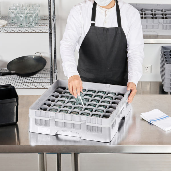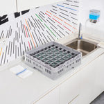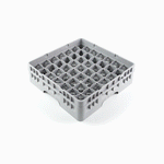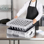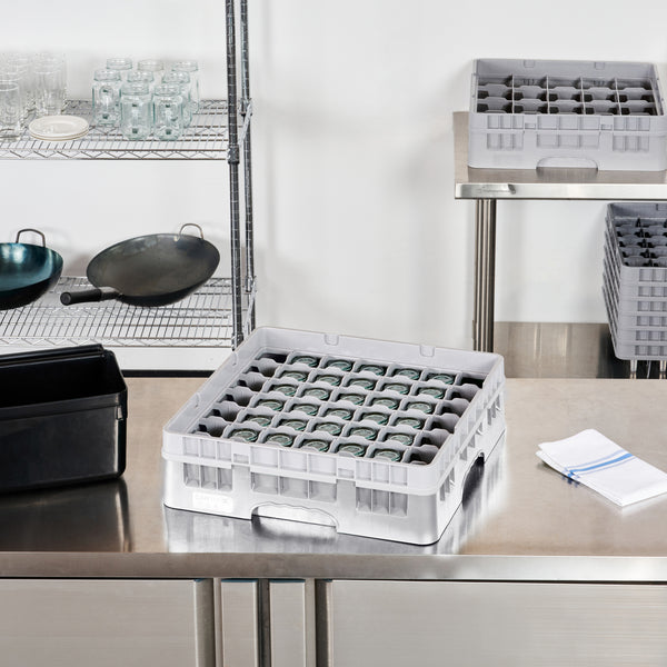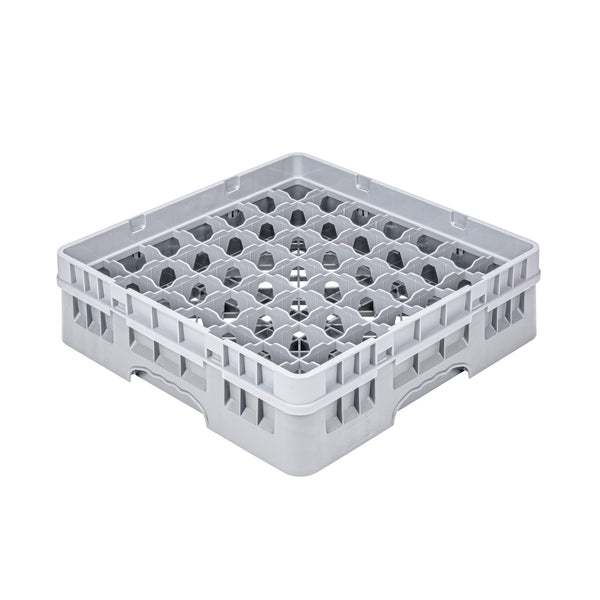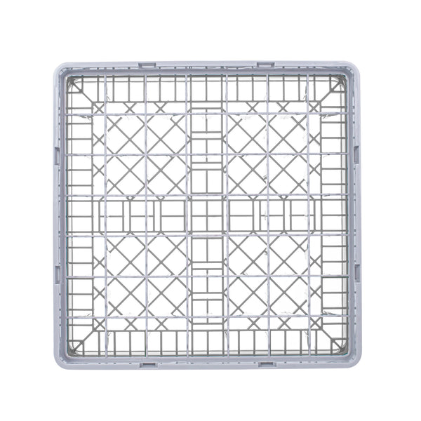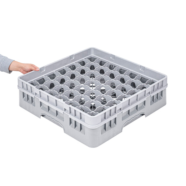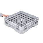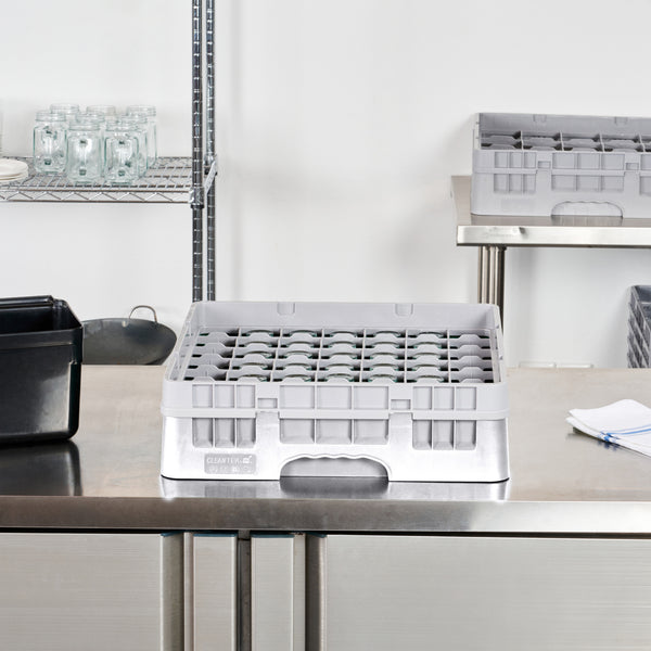 Organize and protect your glassware with our Clean Tek Professional Gray Glass Rack. Featuring 49 compartments, this commercial glass rack offers ample space for efficient glassware storage. The included full drop extender ensures that even taller glasses are securely accommodated in this barware organizer. Made from durable PP, this dishwasher rack is built to withstand the rigors of daily use in a busy foodservice environment. An easy-to-handle design makes transporting and managing your glassware simple and stress-free. This compartment rack comes equipped with open interior compartments for better air circulation and faster drying times. Solid external walls provide added protection, ensuring your glassware remains intact during storage and transport. Measuring 19.69 inches in length by 19.69 inches in width by 5.63 inches in height, this rack is perfectly sized for commercial use and fits seamlessly into most dishwashing systems. Sold in a 1 count box.