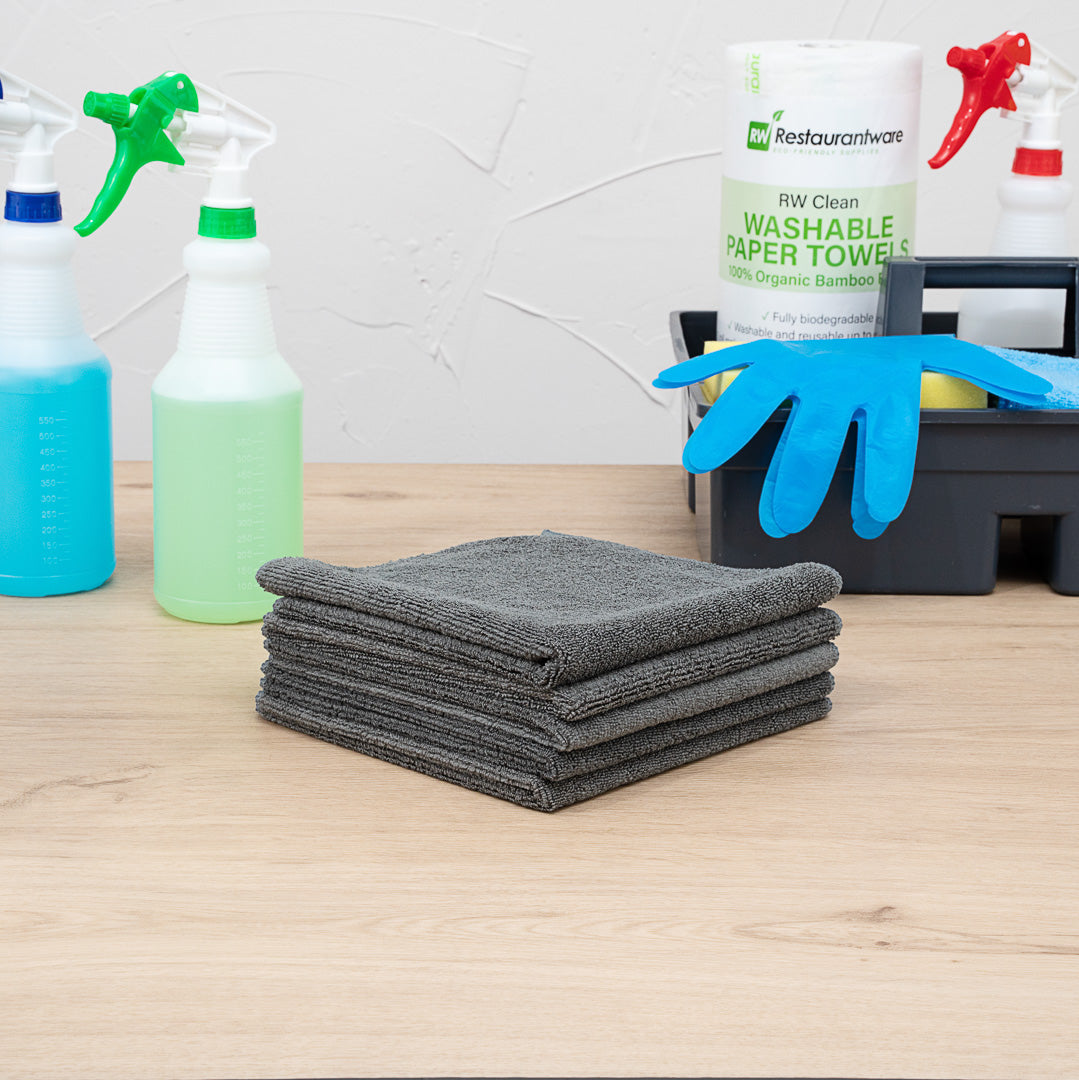 Keep the front and back of the house clean with our Clean Tek Professional Gray Microfiber Cleaning Cloths. Constructed from a blend of polyester microfibers, these cleaning cloths without lint can be used to dust, scrub, clean, polish, or dry surfaces without leaving streaks behind. These gray wiping cloths can be incorporated into a color-coded cleaning system to provide employees with a quick way to identify the use of the cloth. With a soft and absorbent design, these microfiber cloths help you remove fingerprints from windows or stains from tabletops without scratching surfaces. These wiping cloths can hold up to 4 times more moisture than conventional cotton cloths and can be conveniently laundered in a washing machine after use. Each gray cleaning cloth allows you to polish kitchen surfaces or glassware. These wiping cloths measure 16 inches long by 16 inches wide. Sold in a 10 count box.