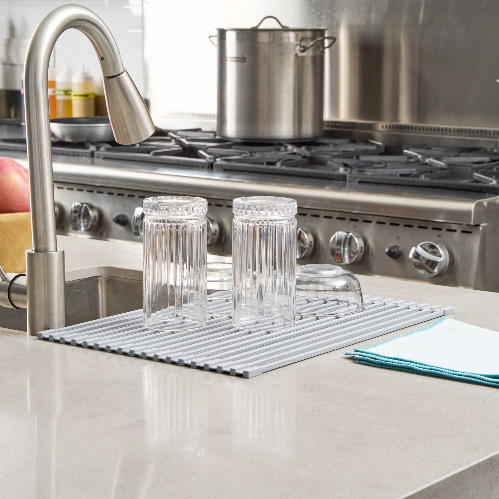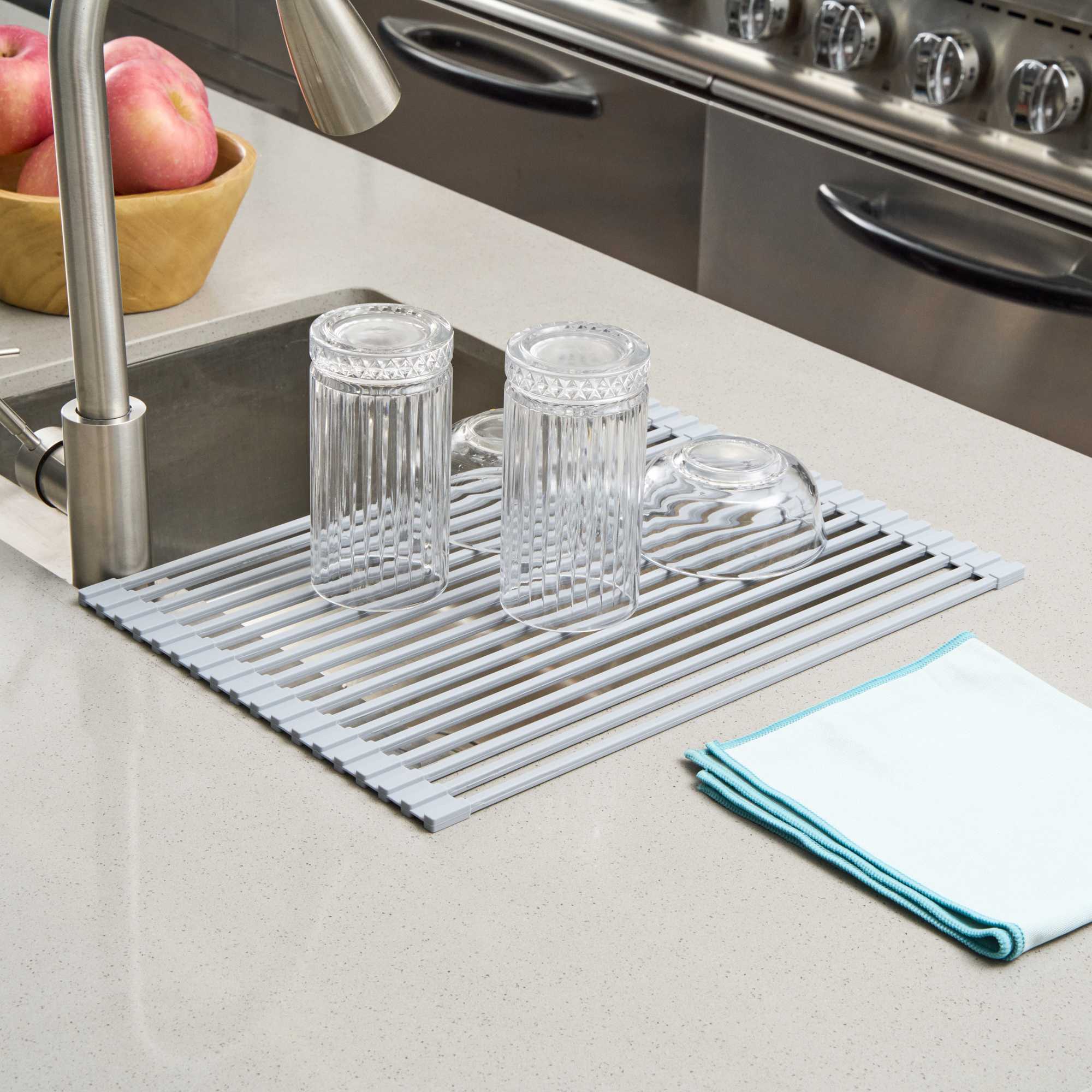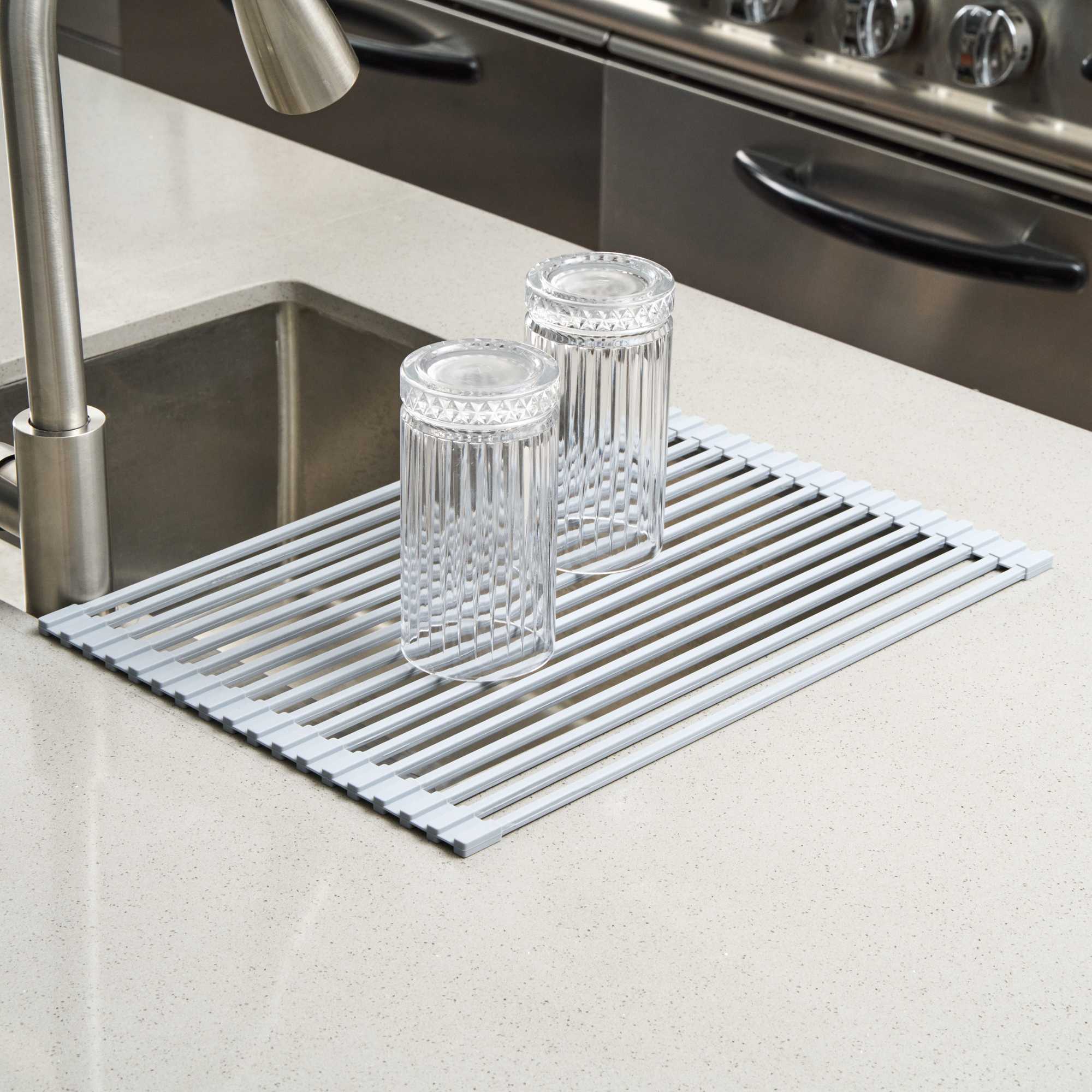 PROFESSIONAL GRAY STEEL OVER-SINK ROLL-UP DRYING RACK - NON-SLIP