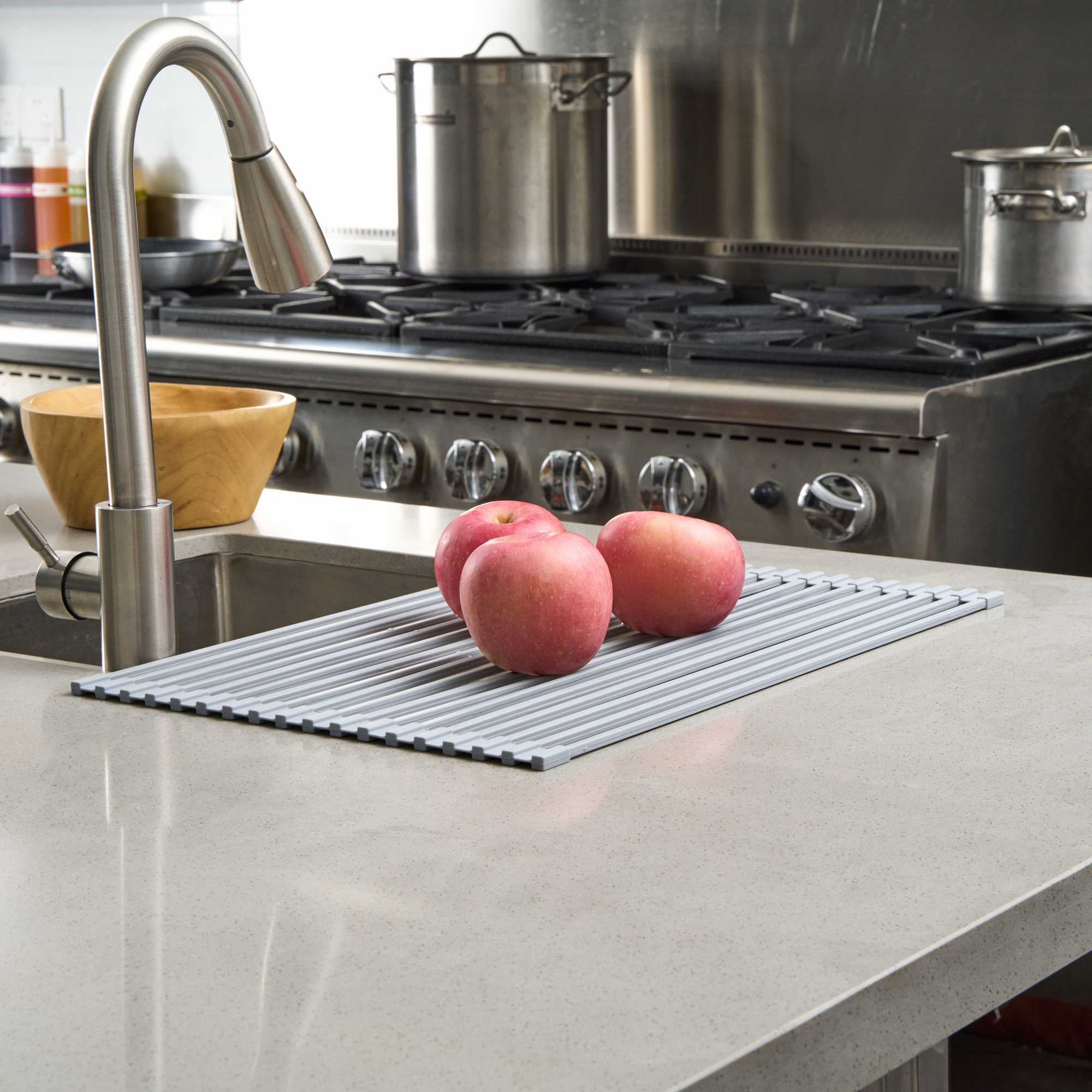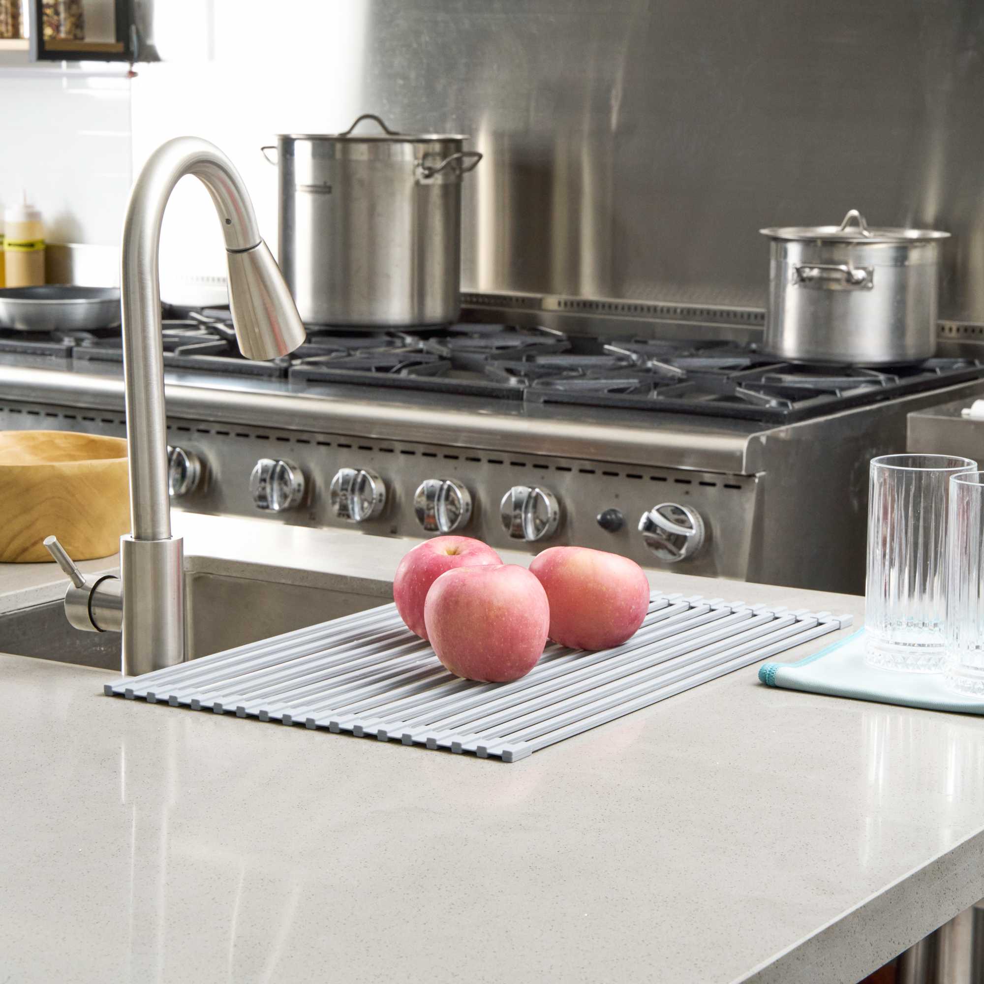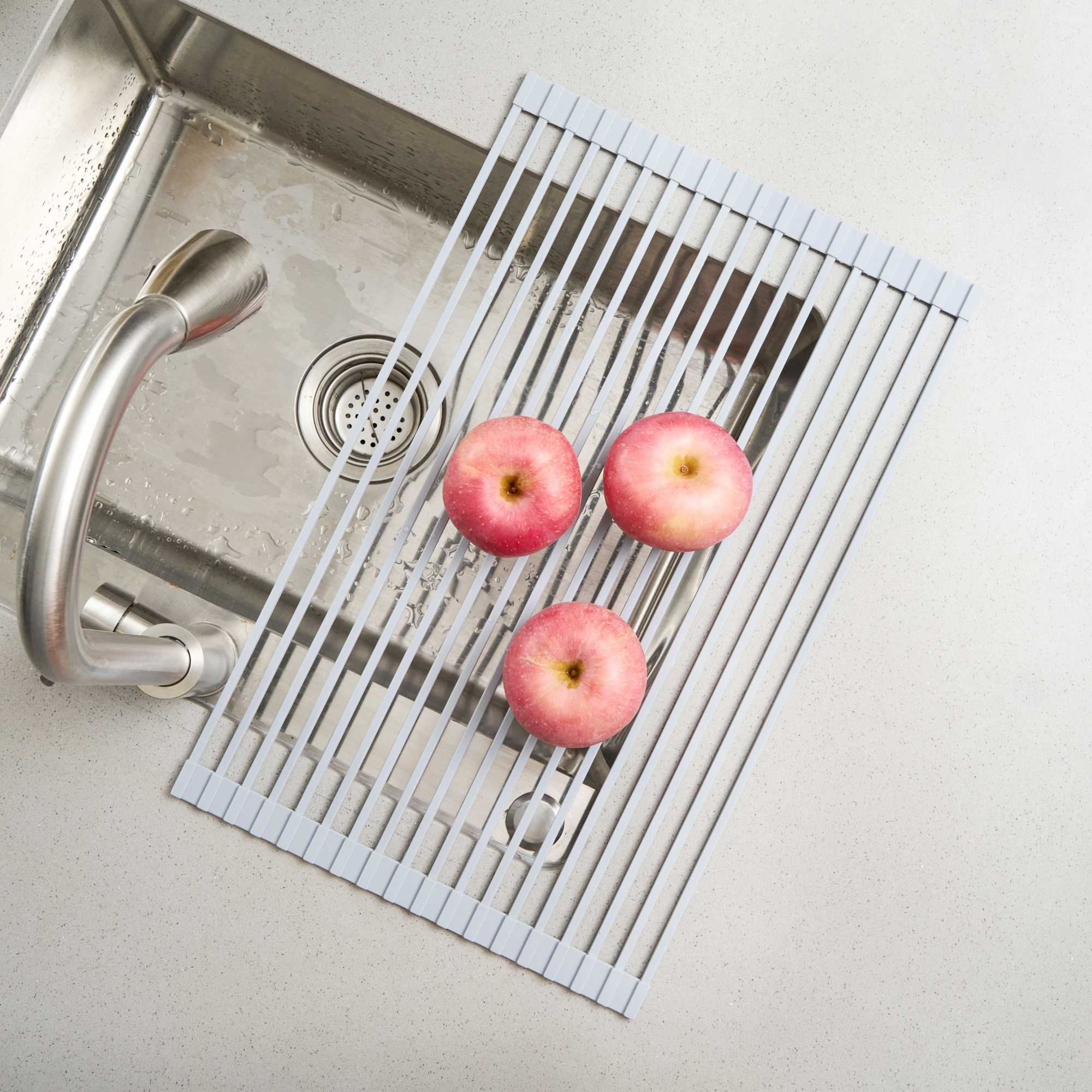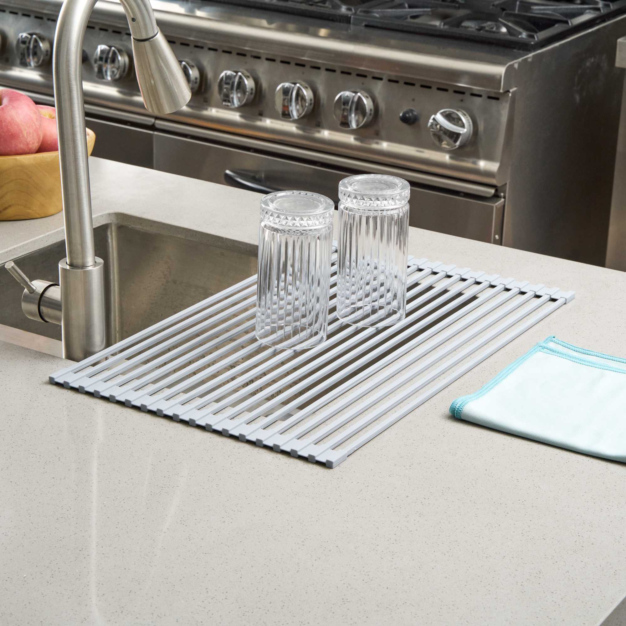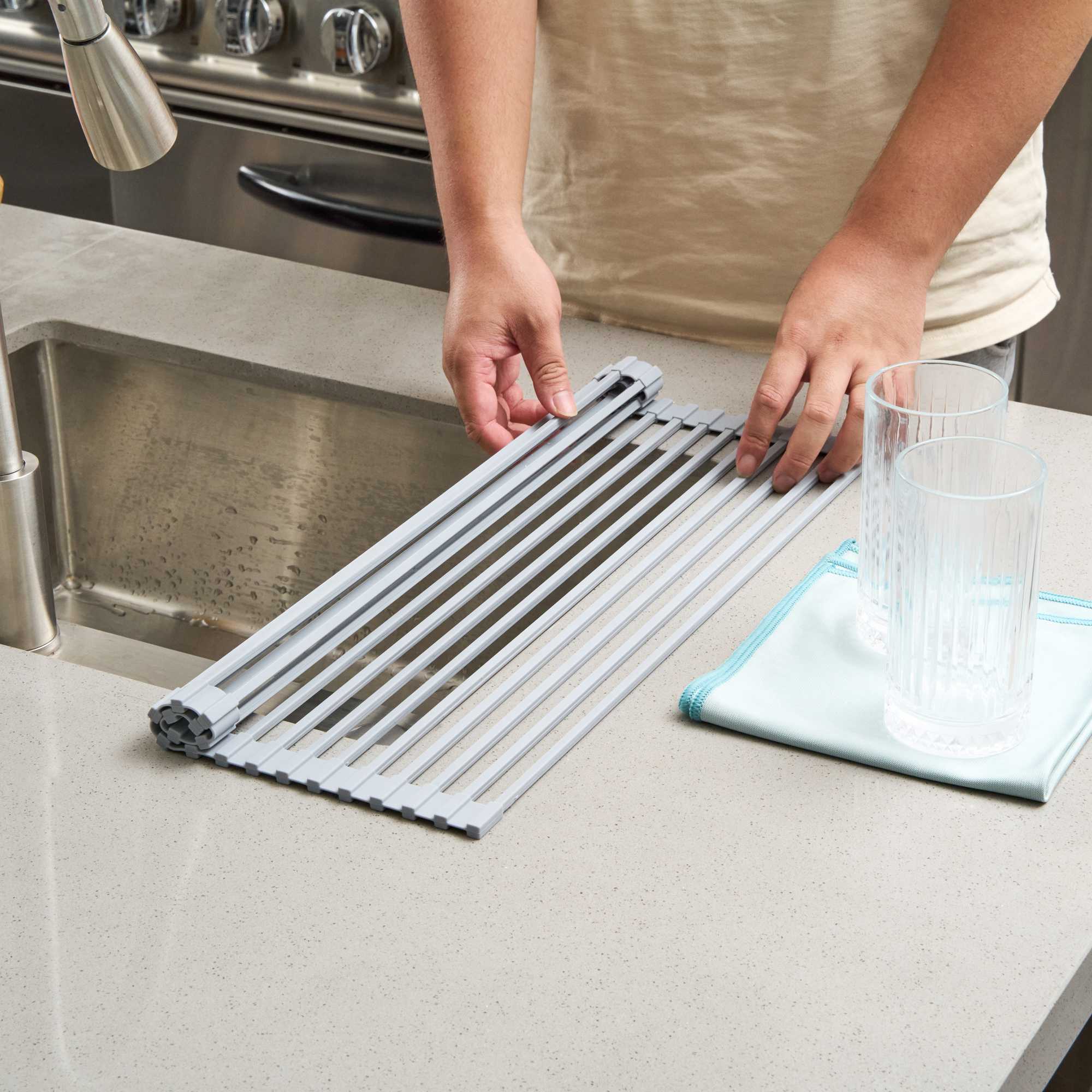 PROFESSIONAL GRAY STEEL OVER-SINK ROLL-UP DRYING RACK - NON-SLIP