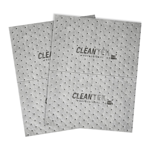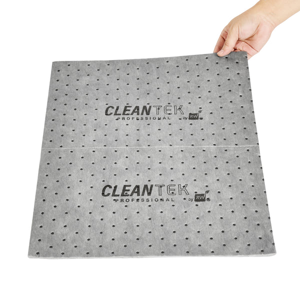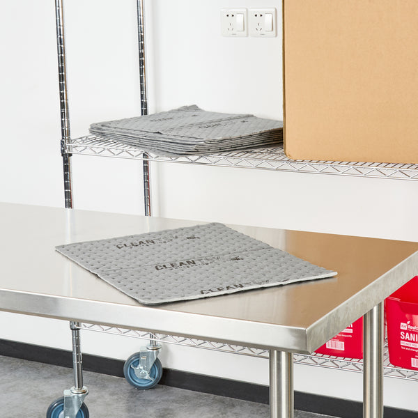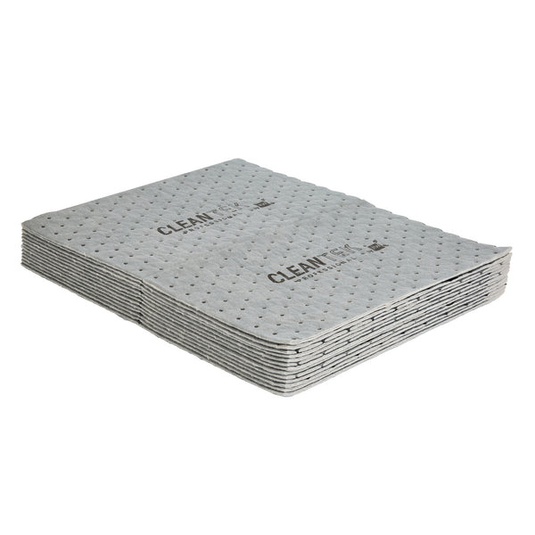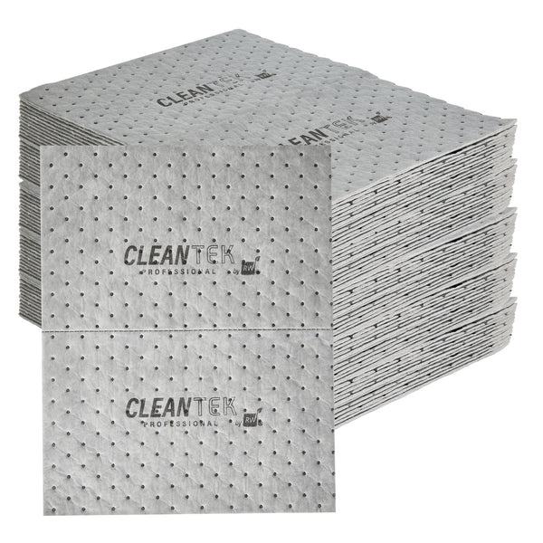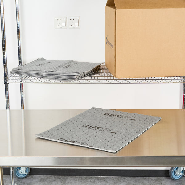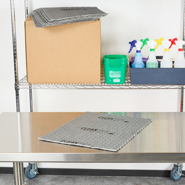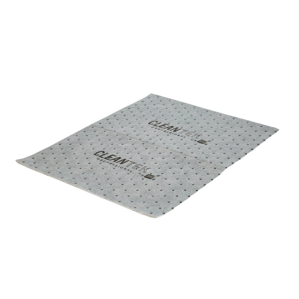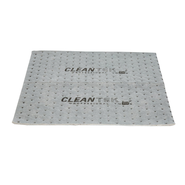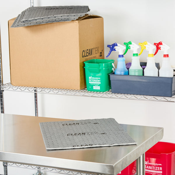 Prevent workplace spills with these versatile spill pads. Clean Tek Professional Non-Flammable Spill Pads absorb all oil-based, water-based, and chemical-based fluids, ensuring your work area remains safe and clean. With a universal sorbent material, these oil-absorbent pads are compatible with a variety of liquids, including oils, coolants, solvents, and water, making them essential for kitchens, food processing facilities, and catering events. The non-flammable design enhances safety in high-temperature settings like commercial kitchens. Featuring a durable extra-duty construction, these universal absorbent pads withstand heavy use in high-traffic areas, while the perforated design allows for easy tearing, reducing waste and improving operational efficiency. Made from nonwoven polypropylene, each pad measures 14.9 inches by 18.8 inches, covering a larger surface area for quicker response times. Ensure your establishment is always ready for unexpected spills with these spill pads. Each order includes 100 Clean Tek Professional Non-Flammable Spill Pads.