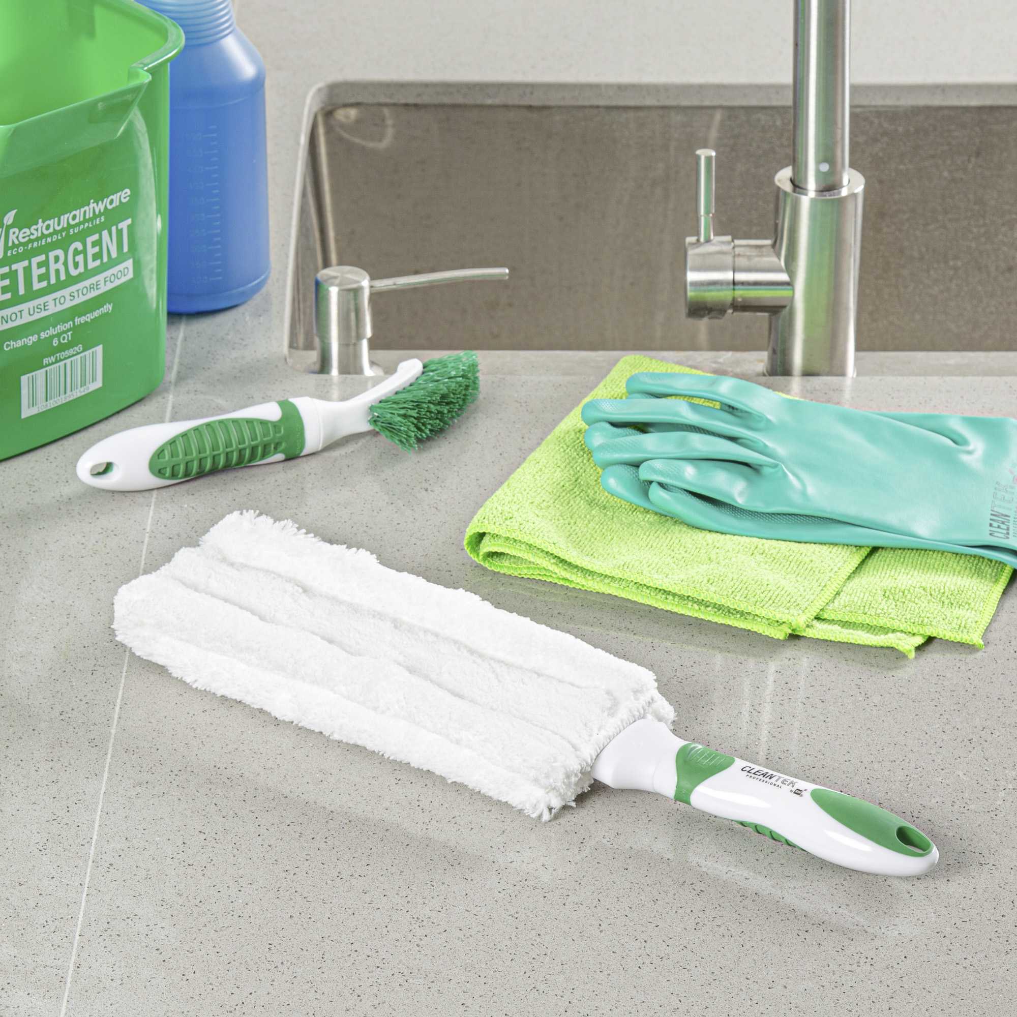 Maximize cleaning efficiency with a versatile dusting tool. The Clean Tek Professional Non-Slip Handle 14.76-Inch Dusting Brush in Green+White, with its 14.76-inch length, features a large head size that swiftly covers expansive surfaces, making it an ideal dusting brush for any commercial setting. The distinctive green and white handle ensures easy identification, minimizing downtime in bustling settings. Equipped with a comfortable, non-slip grip, this furniture duster is perfect for tackling window blinds, furniture, bookshelves, and more. The washable cotton head is washable, allowing for reuse and reducing waste. Enhance your cleaning routine with this ceiling fan duster, designed to meet the rigorous demands of professional cleaning. Each order includes 10 Clean Tek Professional Non-Slip Handle Dusting Brushes – Green+White, Washable Head.