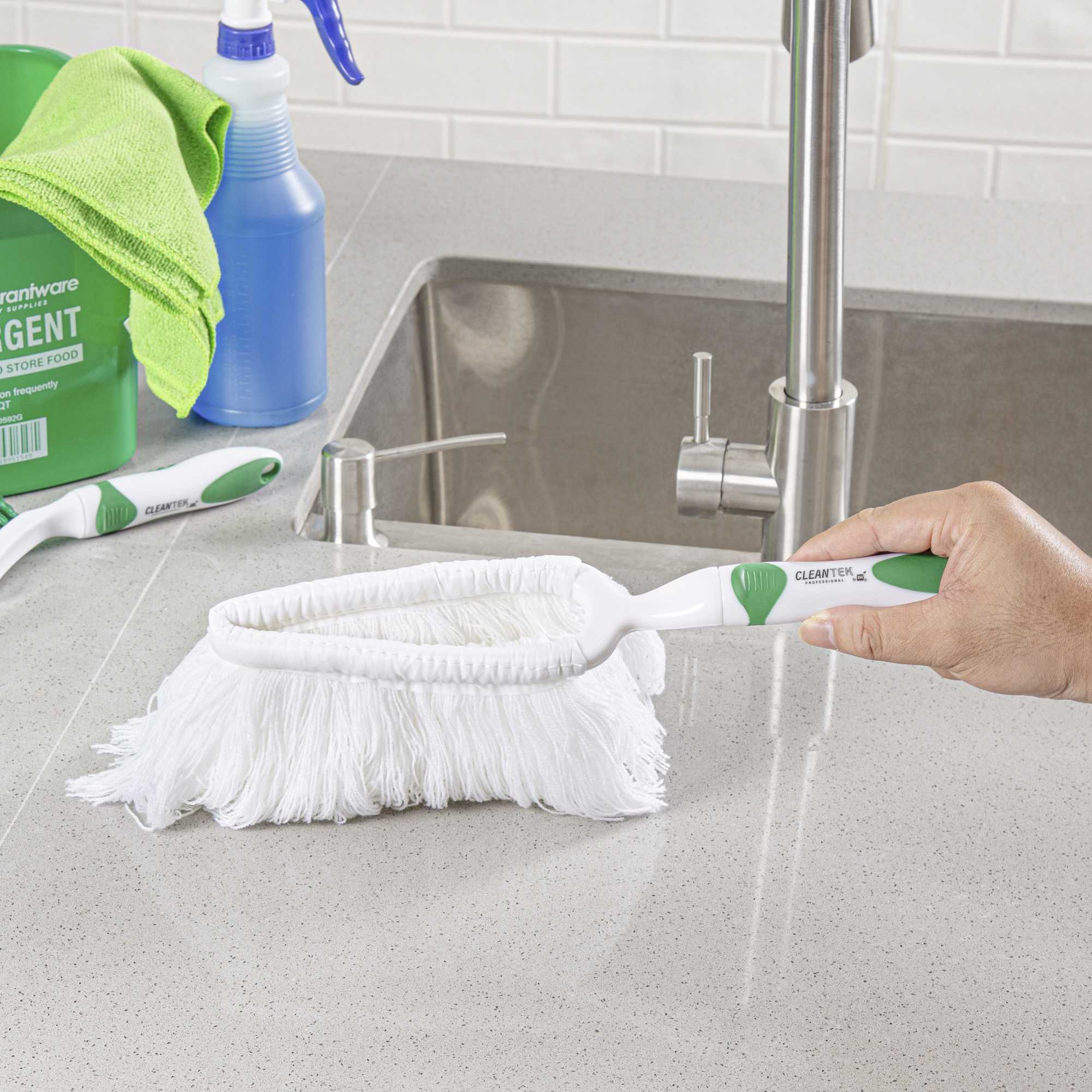 Streamline your cleaning process with reliable dust removal. The Clean Tek Professional Non-Slip Handle 13.78 inches car duster – Green+White, Plastic, Washable Head, Compact Storage – 2.1 inch by 2.5 inch features a cotton fiber head that efficiently captures dust, making it an essential tool for maintaining cleanliness in kitchens. Its extendable head easily reaches tight spaces, perfect for accessing challenging areas in storage rooms, and ensuring comprehensive cleaning. Designed with a green and white handle, this duster provides an ergonomic grip for staff, reducing fatigue during prolonged use. Constructed from durable plastic, this interior cleaning duster is lightweight. Optimize your cleaning tasks with this practical and versatile car duster that suits various surfaces, including window blinds and ceiling fan blades. Each order includes 1 Clean Tek Professional Non-Slip Duster.