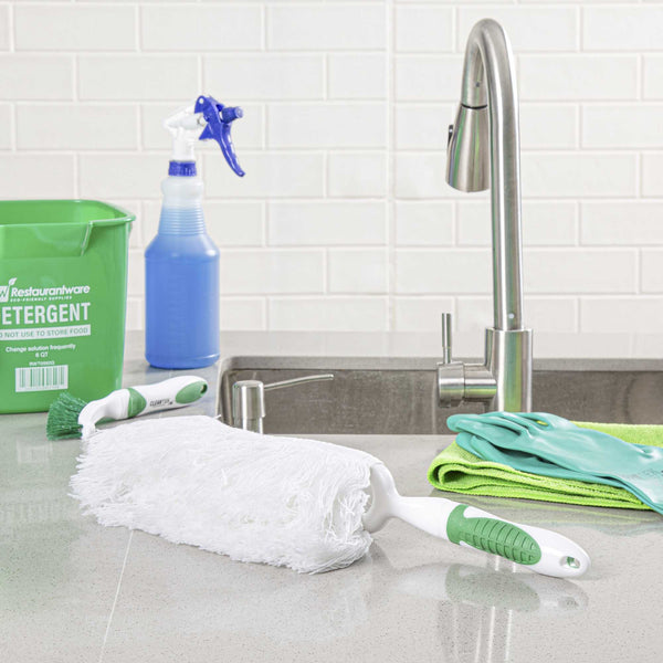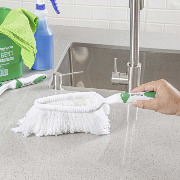 Streamline your cleaning process with reliable dust removal. The Clean Tek Professional Non-Slip Handle 13.78 inches car duster – Green+White, Plastic, Washable Head, Compact Storage – 2.1 inch by 2.5 inch features a cotton fiber head that efficiently captures dust, making it an essential tool for maintaining cleanliness in kitchens. Its extendable head easily reaches tight spaces, perfect for accessing challenging areas in storage rooms, and ensuring comprehensive cleaning. Designed with a green and white handle, this duster provides an ergonomic grip for staff, reducing fatigue during prolonged use. Constructed from durable plastic, this interior cleaning duster is lightweight. Optimize your cleaning tasks with this practical and versatile car duster that suits various surfaces, including window blinds and ceiling fan blades. Each order includes 10 Clean Tek Professional Non-Slip Dusters.