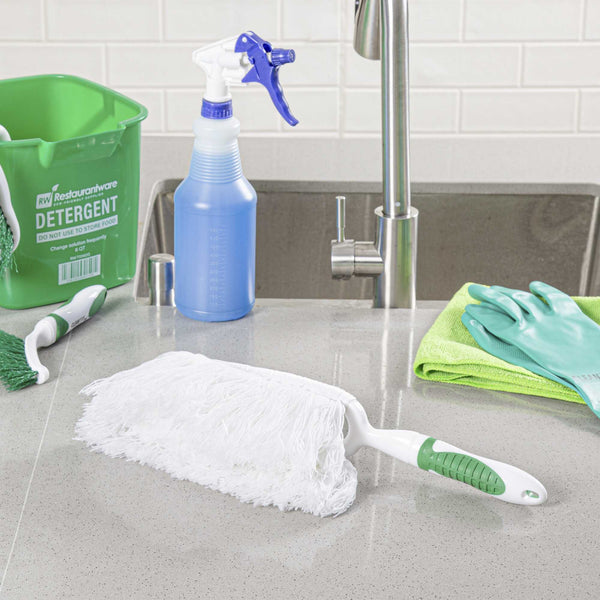 Streamline your cleaning process with reliable dust removal. The Clean Tek Professional Non-Slip Handle 13.78 inches car duster – Green+White, Plastic, Washable Head, Compact Storage – 2.1 inch by 2.5 inch features a cotton fiber head that efficiently captures dust, making it an essential tool for maintaining cleanliness in kitchens. Its extendable head easily reaches tight spaces, perfect for accessing challenging areas in storage rooms, and ensuring comprehensive cleaning. Designed with a green and white handle, this duster provides an ergonomic grip for staff, reducing fatigue during prolonged use. Constructed from durable plastic, this interior cleaning duster is lightweight. Optimize your cleaning tasks with this practical and versatile car duster that suits various surfaces, including window blinds and ceiling fan blades. Each order includes 50 Clean Tek Professional Non-Slip Dusters.