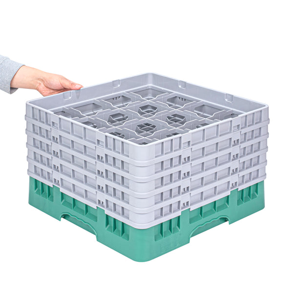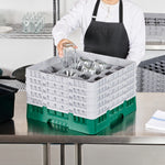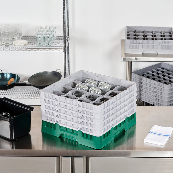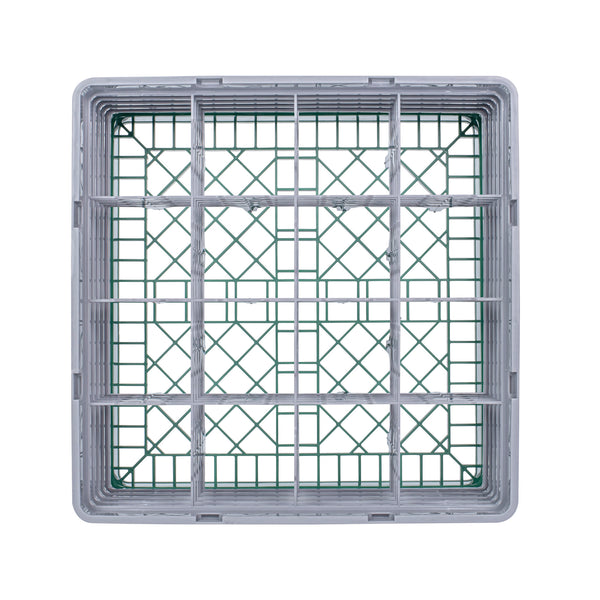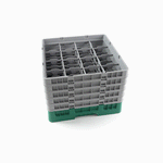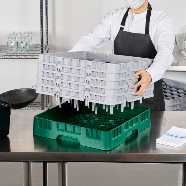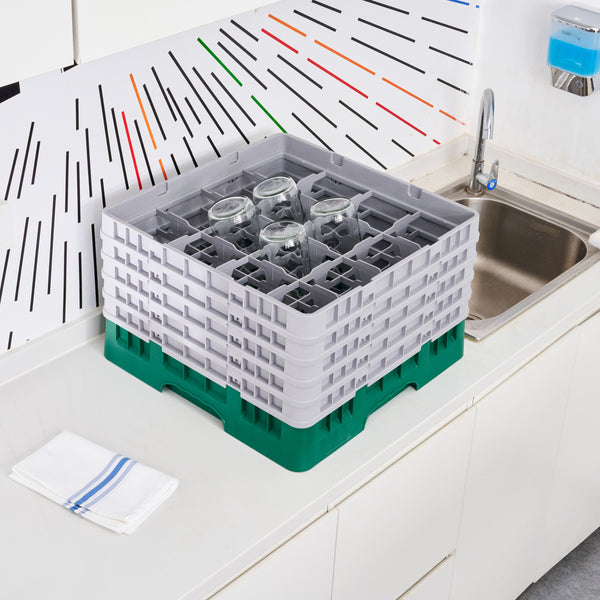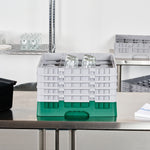 Streamline your glassware storage with our Clean Tek Professional Green Glass Rack. This commercial glass rack features 16 compartments to securely hold barware during wash cycles. Designed with a full drop extender, this dishwasher rack easily accommodates taller glassware. Including 4 half drop extenders, this compartment rack provide versatile storage options for various glass sizes. Constructed from durable PP, this barware organizer ensures long-lasting use in busy kitchens. With an easy-to-handle design, this glass rack simplifies the transportation of clean glasses. The open interior compartments of this commercial glass rack offer excellent water and airflow for thorough cleaning. Solid external walls provide added protection against breakage during handling. Measuring 19.69 inches in length by 19.69 inches in width by 12.13 inches in height, this glassware storage solution fits most commercial dishwashers. Sold in a 1 count box.