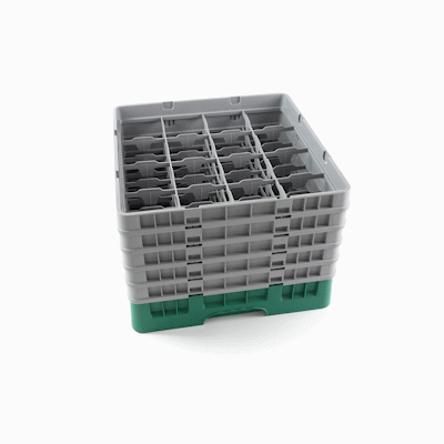 GREEN GLASS RACK - 16 COMPARTMENTS, 1 FULL AND 4 HALF DROP EXTENDERS