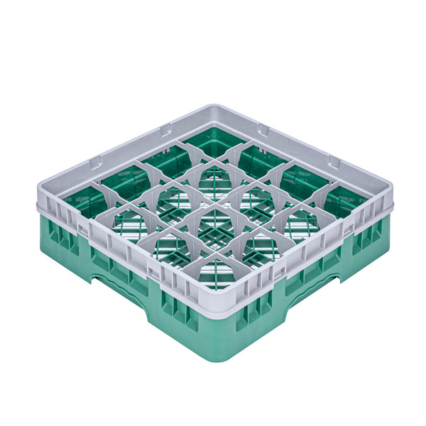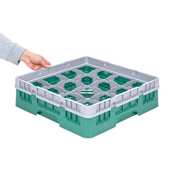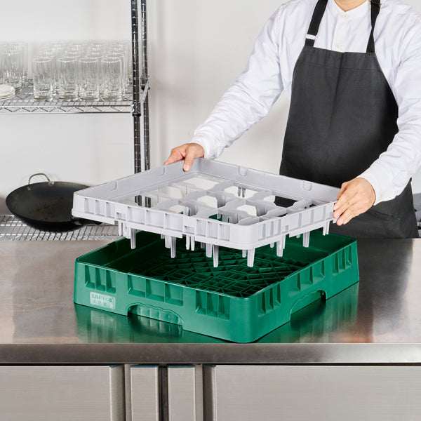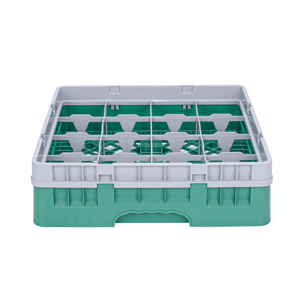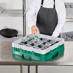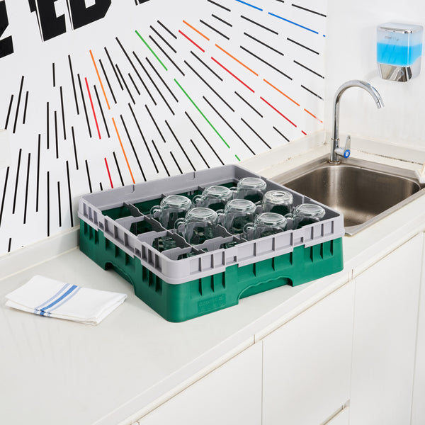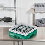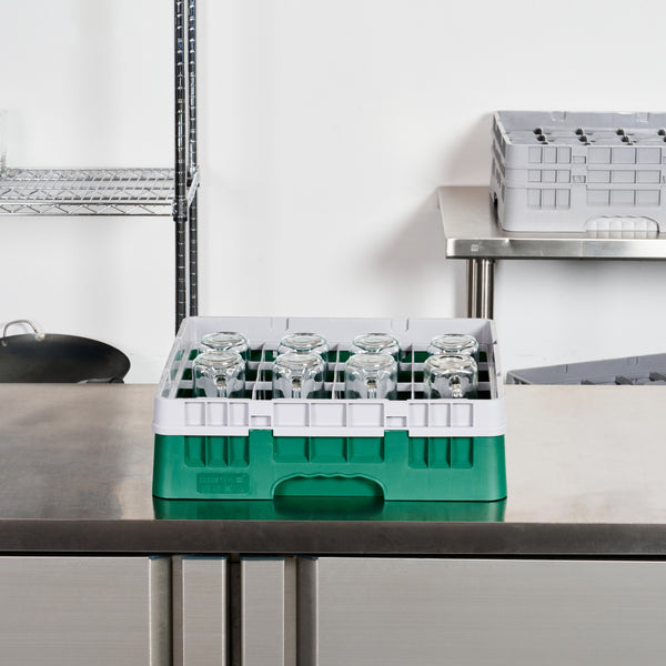 Optimize your glassware storage with our Clean Tek Professional Green Glass Rack. This commercial glass rack features 16 compartments, ensuring ample space for efficient dishwasher rack organization. Designed with durability in mind, this rack is constructed from strong PP materials for long-lasting use. The 1 full drop extender offers versatile storage options, making this barware organizer perfect for any busy establishment. Featuring an easy-to-handle design, this compartment rack simplifies the task of transporting and storing glassware. The open interior compartments of this rack maximize air circulation, reducing drying time and averting water spots on your glassware. The solid external walls of this rack provide additional protection, keeping your glassware secure during handling and washing. Measuring 19.69 inches in length by 19.69 inches in width by 5.63 inches in height, this dishwasher rack fits seamlessly into most commercial dishwashers. Sold in a 1 count box.