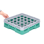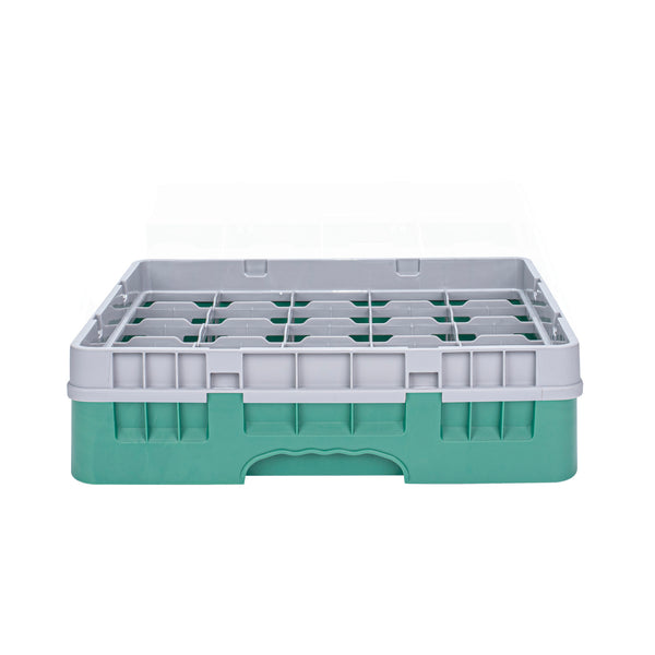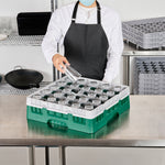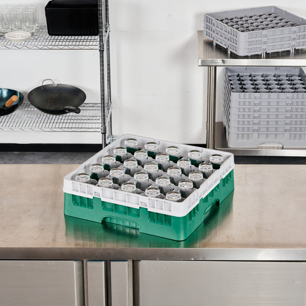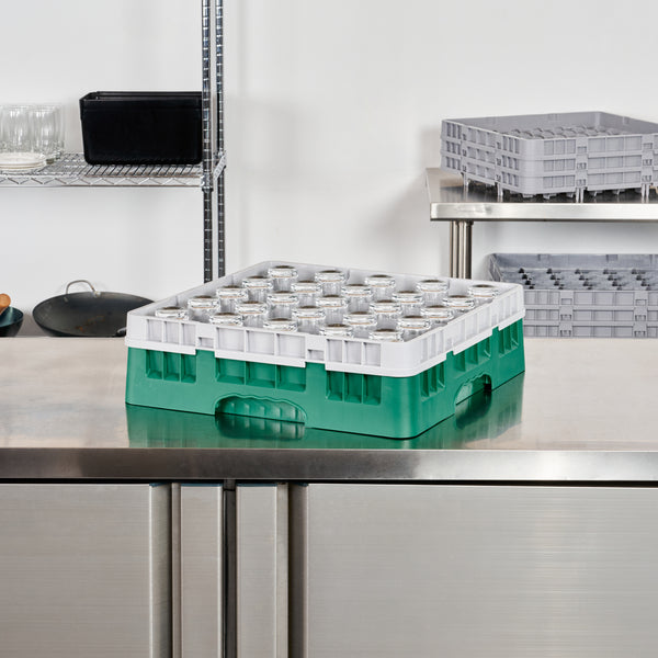 Our Clean Tek Professional Green Glass Rack offers unparalleled glassware storage solutions for your foodservice establishment. This durable commercial glass rack features 25 compartments, ensuring your glassware remains organized and secure. The dishwasher rack design includes a full drop extender, making it easy to accommodate various glass sizes. With an easy-to-handle design, this rack simplifies the process of transporting and storing glassware. Their compartment rack layout boasts open interior compartments, allowing for optimal water and air circulation during the cleaning process. Solid external walls provide added protection, ensuring your barware organizer withstands the rigors of daily use. This glass rack, crafted from durable PP, guarantees long-lasting performance and resilience. Measuring 19.69 inches in length by 19.69 inches in width by 5.63 inches in height, this rack is perfectly sized to fit your commercial needs. Sold in a 1 count box.