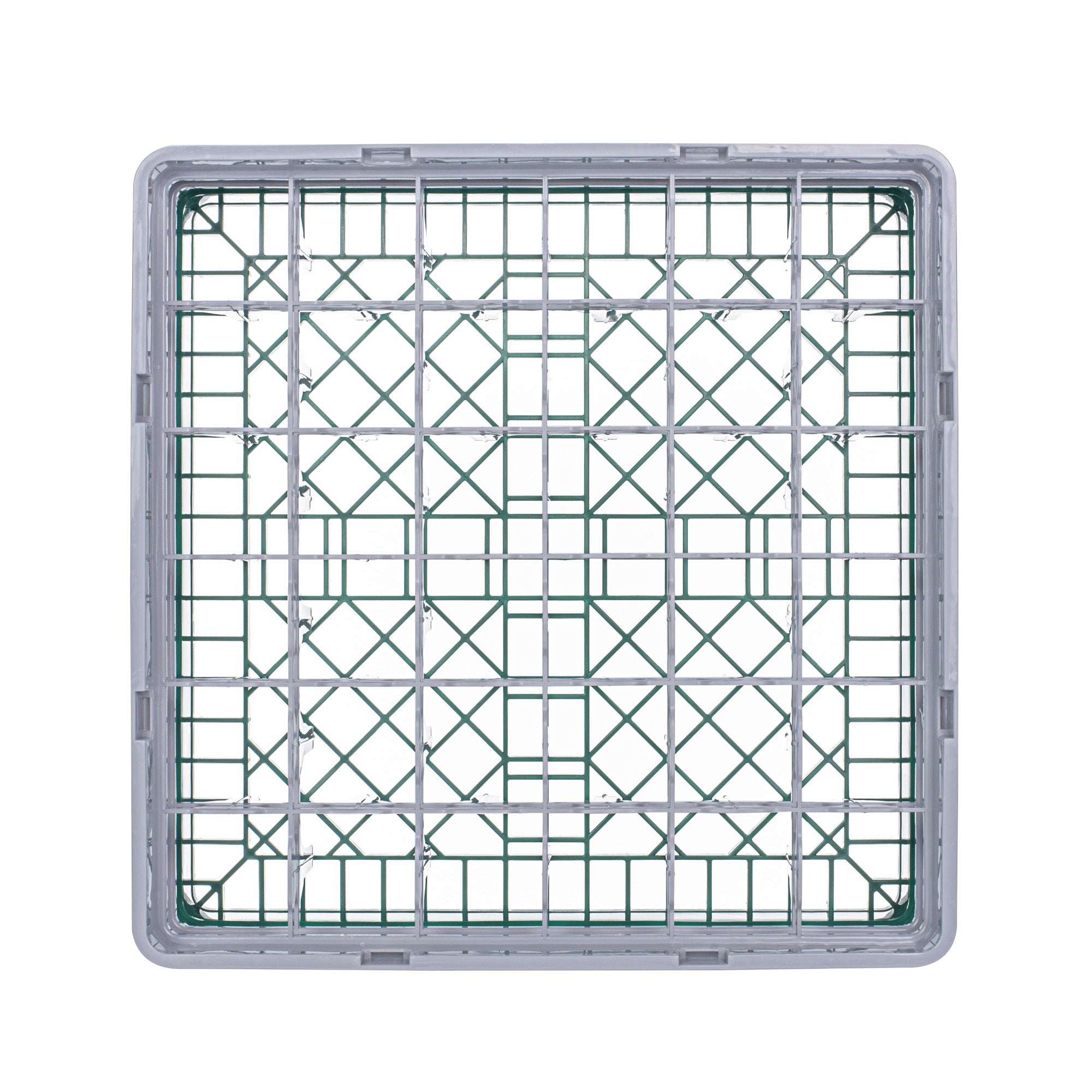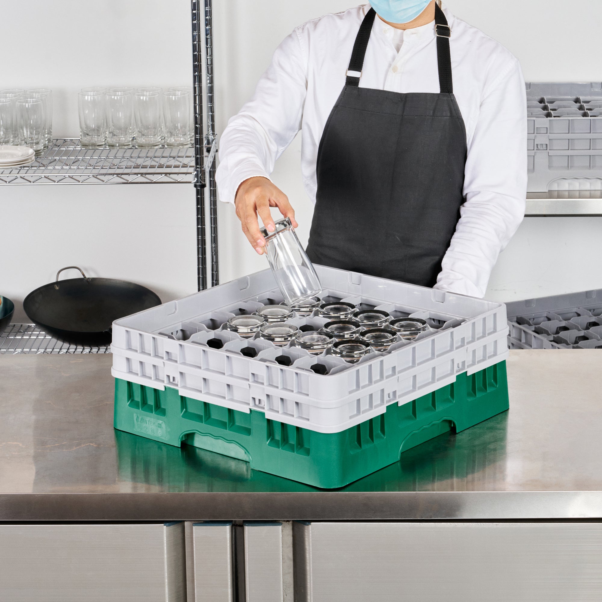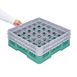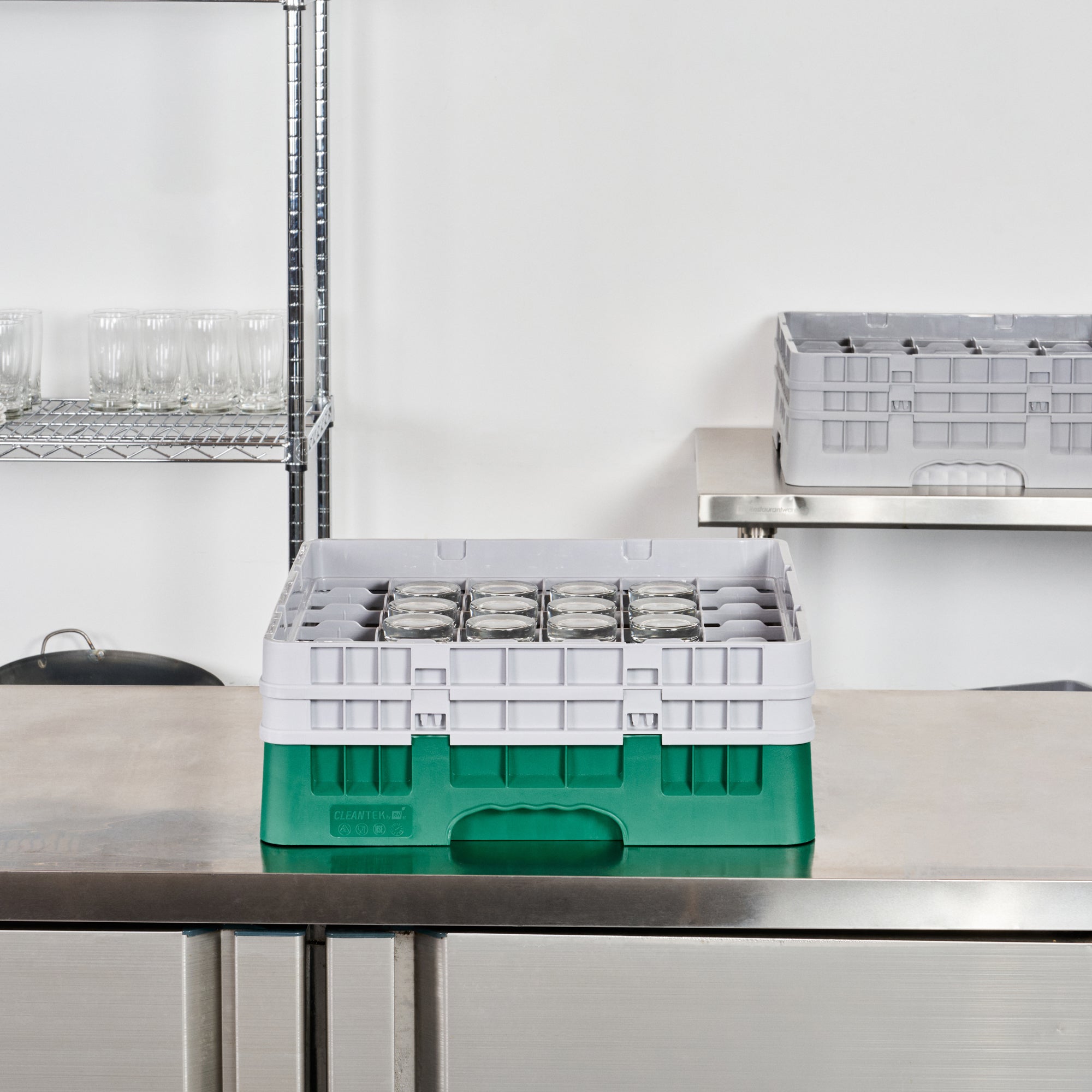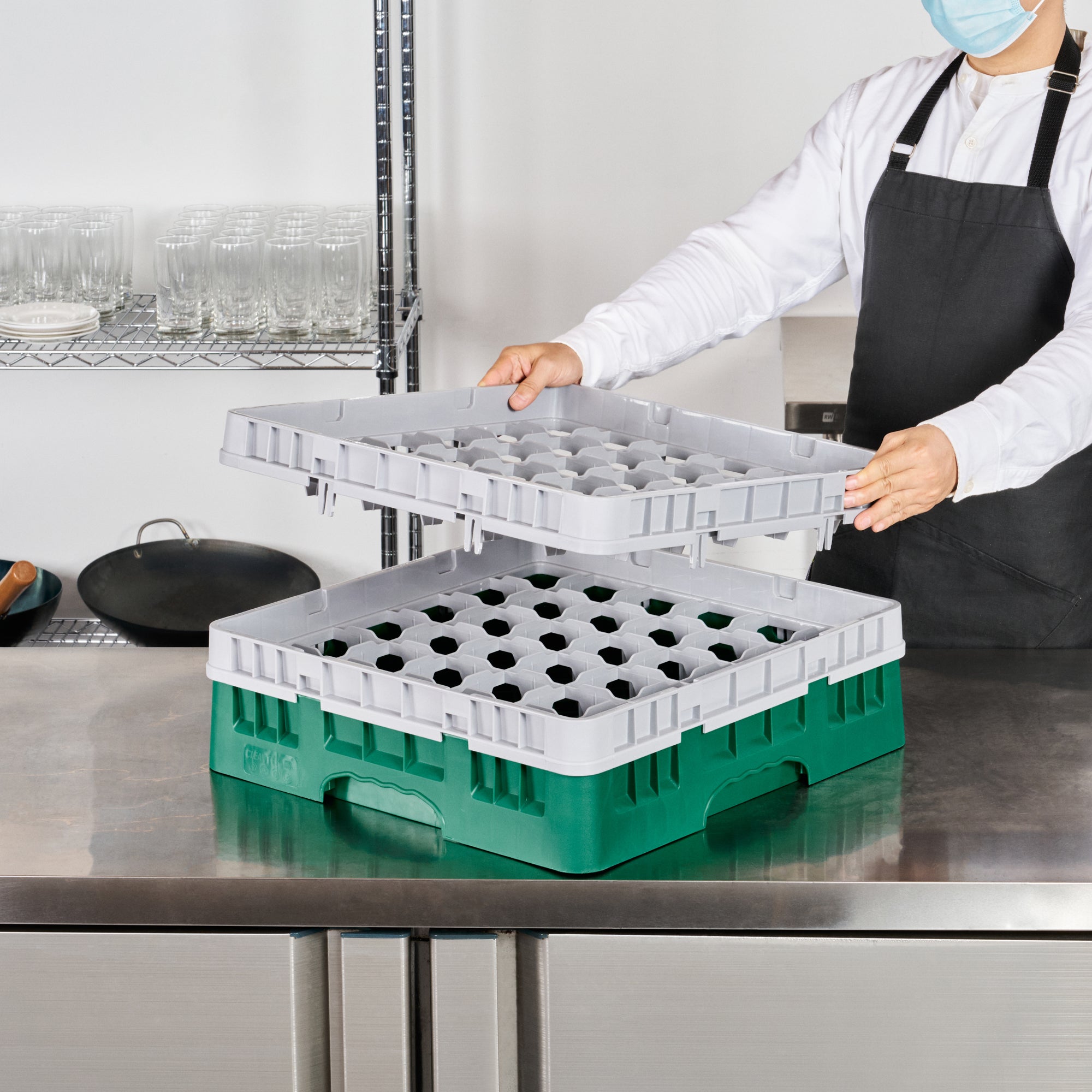 Our Clean Tek Professional Green Glass Rack offer a sophisticated solution for glassware storage in busy commercial kitchens. Designed with 36 open interior compartments, this glass rack provides optimal dishwasher rack efficiency, ensuring each piece of glassware is securely held and thoroughly cleaned. Equipped with one full drop extender and one half drop extender, this compartment rack easily adapts to different glass heights, making it a versatile barware organizer. Constructed from durable PP material, this rack withstands rigorous use in any commercial setting. Featuring solid external walls, this commercial glass rack offers unparalleled protection and stability during transport and washing. The easy-to-handle design simplifies loading and unloading, enhancing operational efficiency in your establishment. With dimensions measuring 19.69 inches in length by 19.69 inches in width by 7.24 inches in height, this rack accommodates a substantial amount of glassware without compromising space. Sold in a 1 count box.