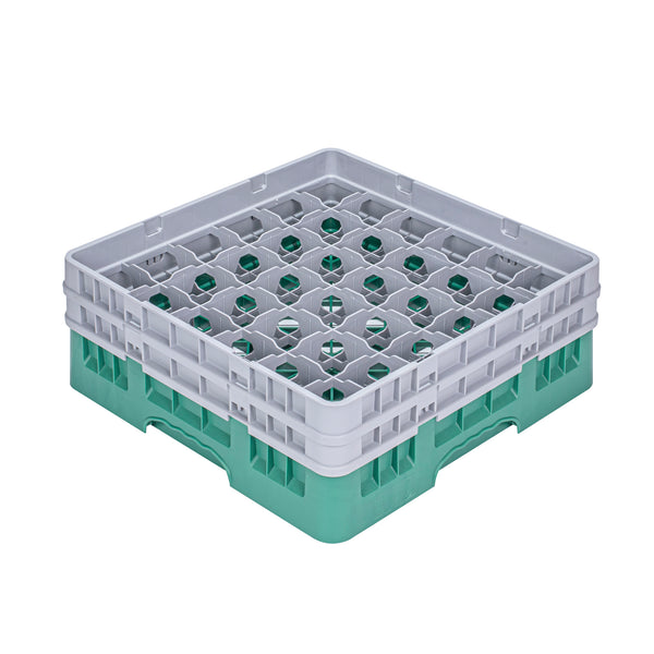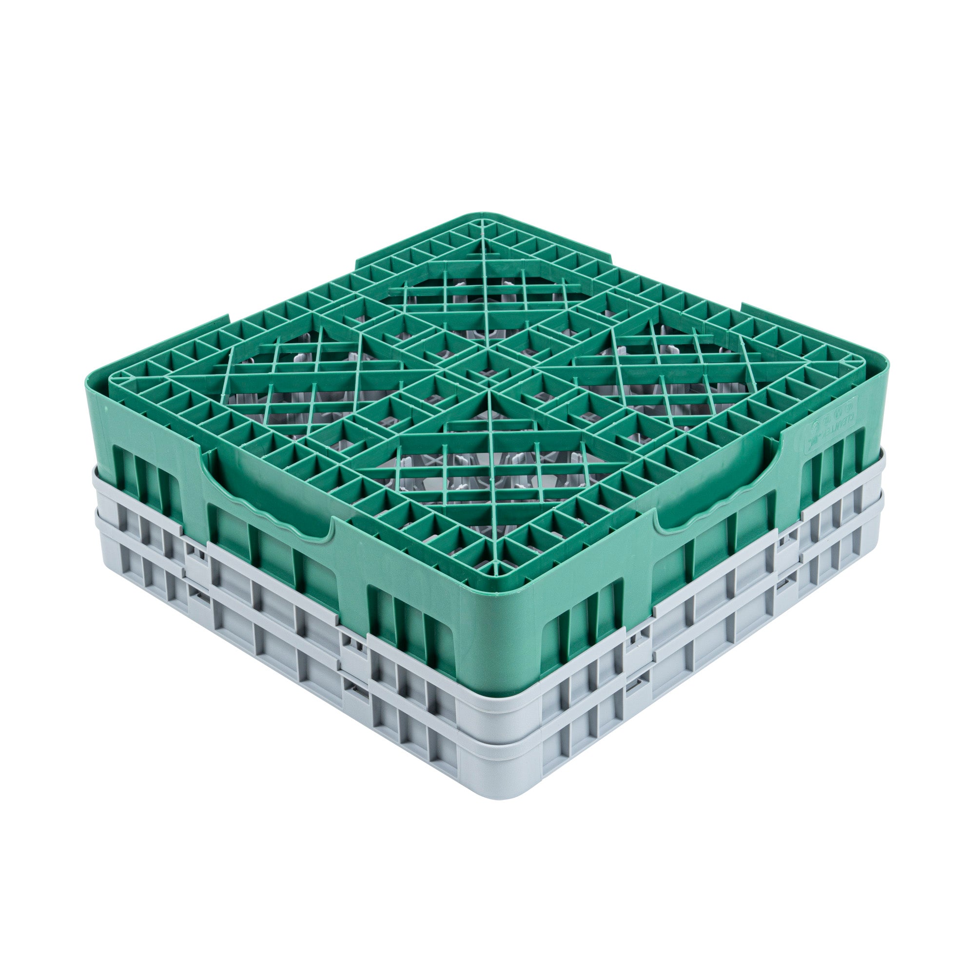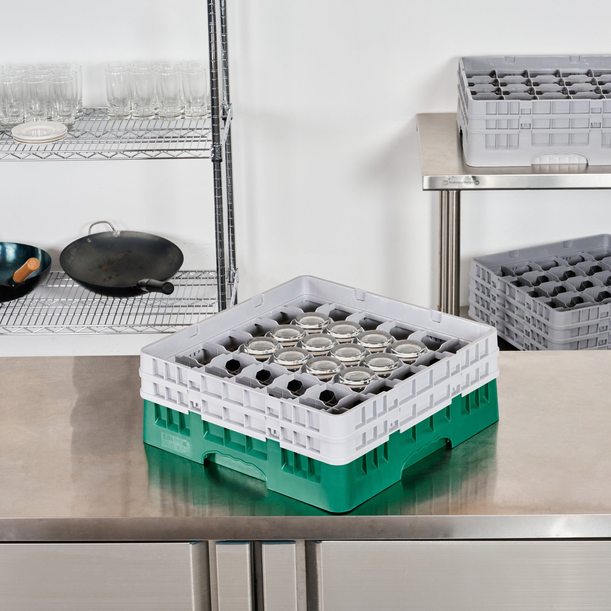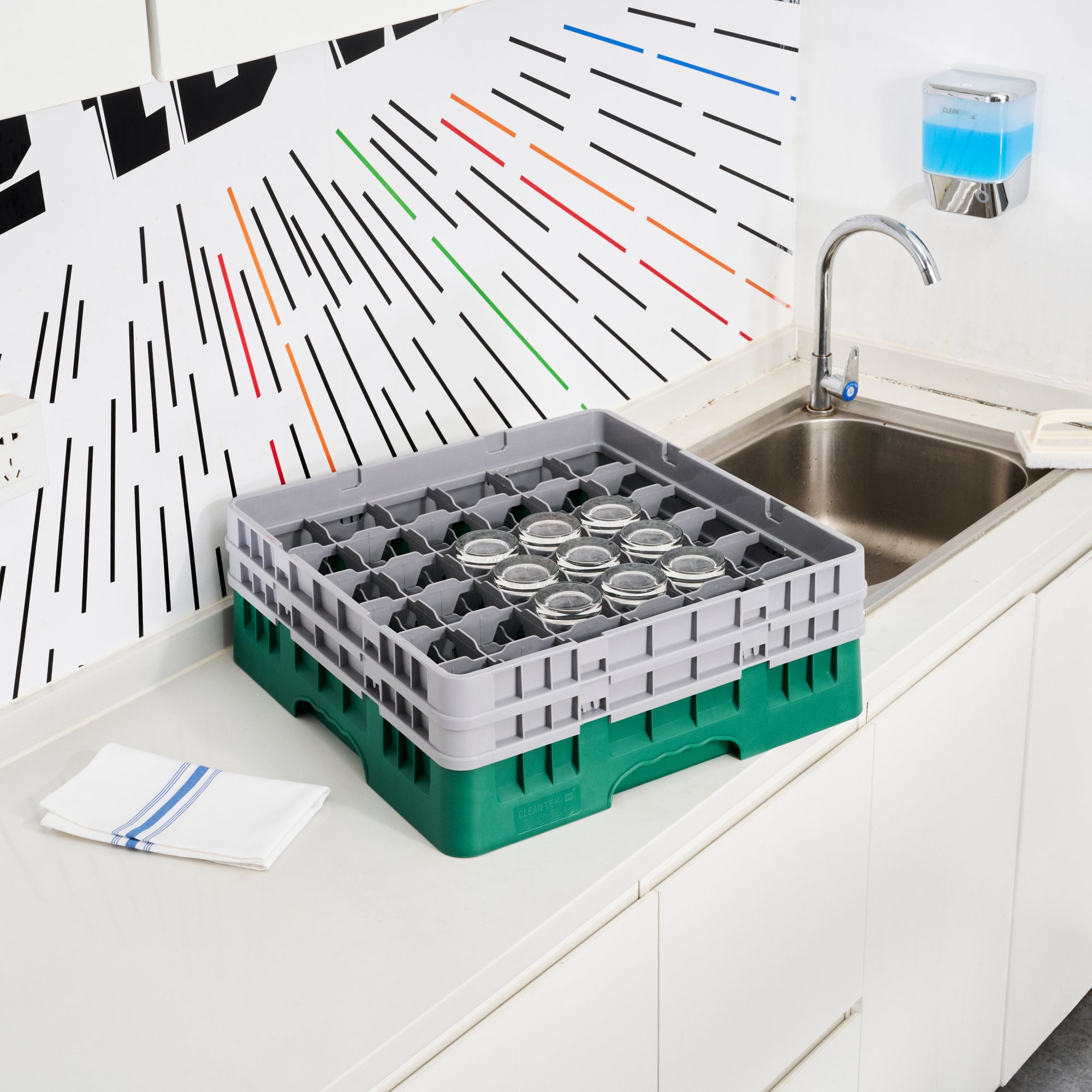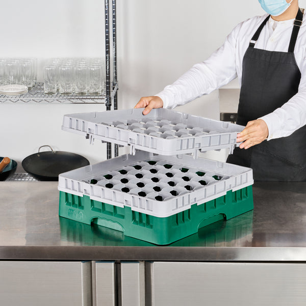Our Clean Tek Professional Green Glass Rack offer a sophisticated solution for glassware storage in busy commercial kitchens. Designed with 36 open interior compartments, this glass rack provides optimal dishwasher rack efficiency, ensuring each piece of glassware is securely held and thoroughly cleaned. Equipped with one full drop extender and one half drop extender, this compartment rack easily adapts to different glass heights, making it a versatile barware organizer. Constructed from durable PP material, this rack withstands rigorous use in any commercial setting. Featuring solid external walls, this commercial glass rack offers unparalleled protection and stability during transport and washing. The easy-to-handle design simplifies loading and unloading, enhancing operational efficiency in your establishment. With dimensions measuring 19.69 inches in length by 19.69 inches in width by 7.24 inches in height, this rack accommodates a substantial amount of glassware without compromising space. Sold in a 1 count box.