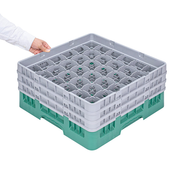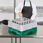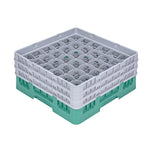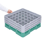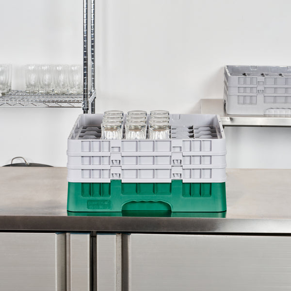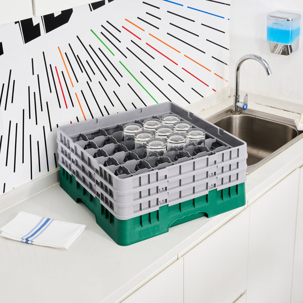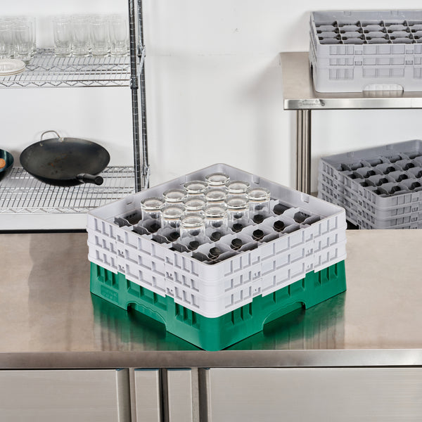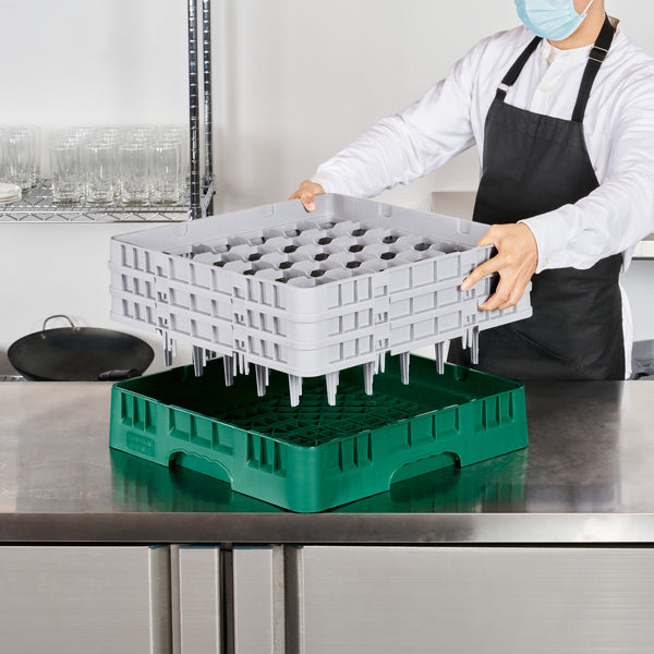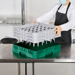 Our Clean Tek Professional Green Glass Rack are the ultimate solution for efficiently organizing glassware storage in any foodservice establishment. With 36 compartments, this dishwasher rack offers ample space to securely hold your glassware during washing cycles. Featuring 1 full drop extender, this compartment rack provides additional height for taller glasses while maintaining stability. Designed with 2 half drop extenders, this barware organizer is customized to fit various glass sizes, ensuring a snug fit. Constructed from durable PP, this commercial glass rack withstands the rigors of daily use in busy settings. The easy-to-handle design allows for effortless transport and stacking, making it ideal for fast-paced kitchens and bars. With open interior compartments, this rack facilitates thorough cleaning and drainage of your glassware. Solid external walls contribute to the sturdy structure, safeguarding your glassware from accidental breakage. Measuring 19.69 inches in length by 19.69 inches in width by 8.86 inches in height, this glassware storage solution accommodates a wide variety of glass sizes. Sold in a 1 count box.