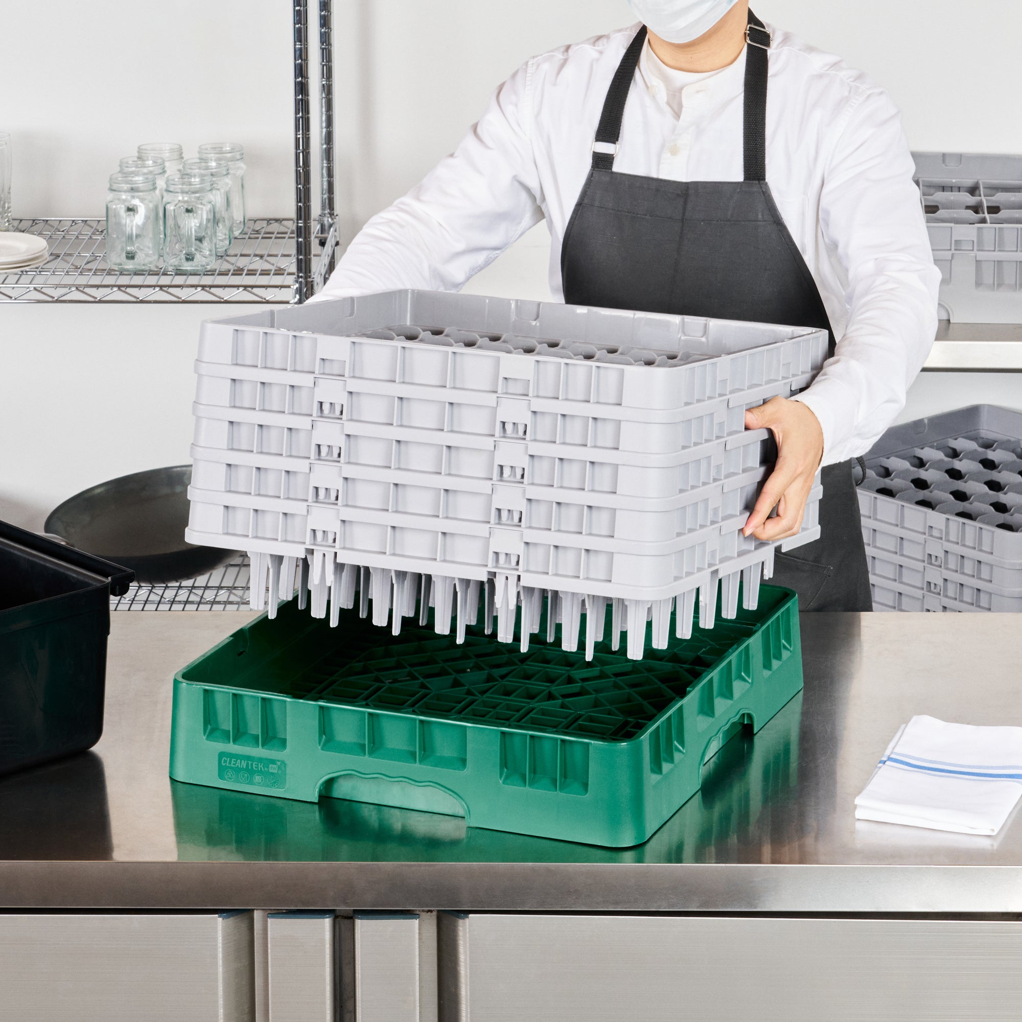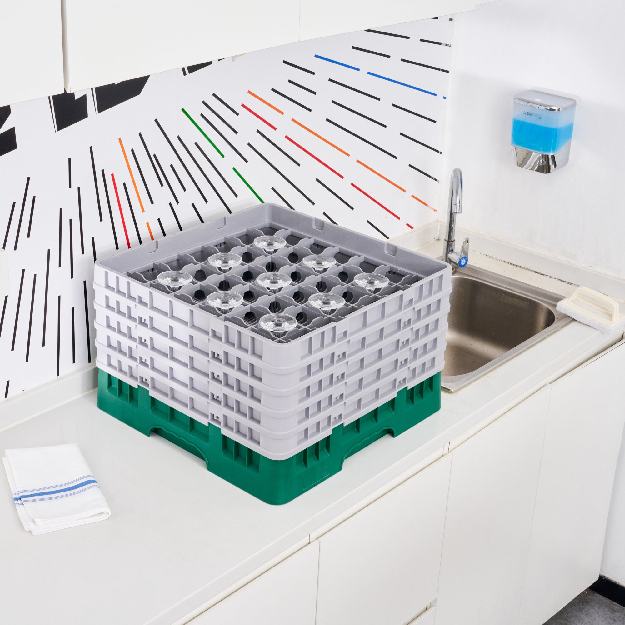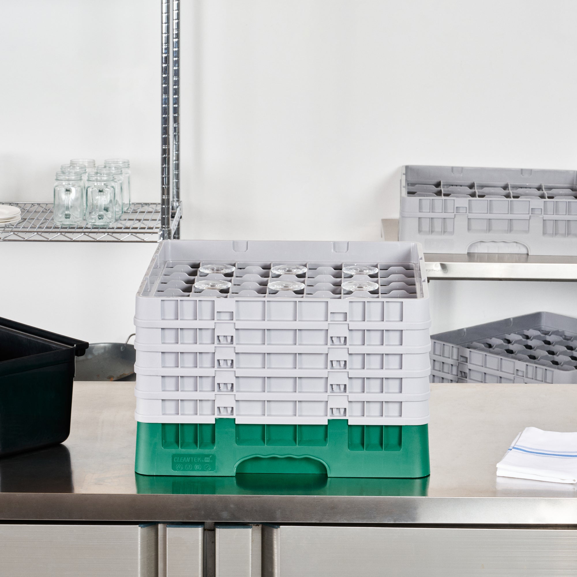 Optimize your glassware storage with our Clean Tek Professional Green Glass Rack. This dishwasher rack is designed with 49 compartments to neatly organize and protect your glassware. Featuring one full drop extender and four half drop extenders, this compartment rack provides flexible height options for different glass sizes. Constructed from durable PP, this commercial glass rack withstands the rigors of a busy kitchen environment. Their easy-to-handle design ensures effortless transportation and handling. With open interior compartments, this barware organizer allows for quick drying and efficient water drainage. Solid external walls of this glassware storage solution offer added protection during handling and washing. Measuring 19.69 inches in length by 19.69 inches in width by 12.13 inches in height, this glass rack fits most commercial dishwashers. Sold in a 1 count box.