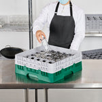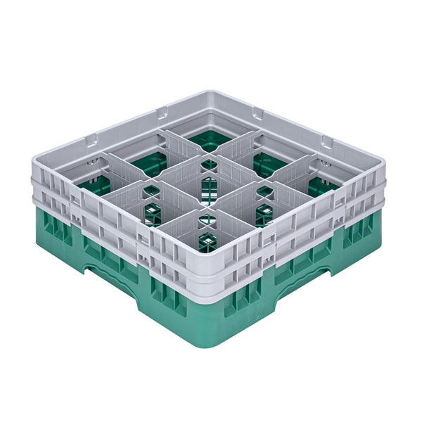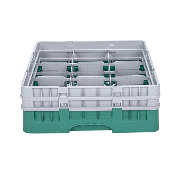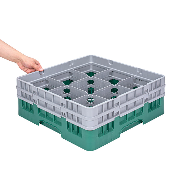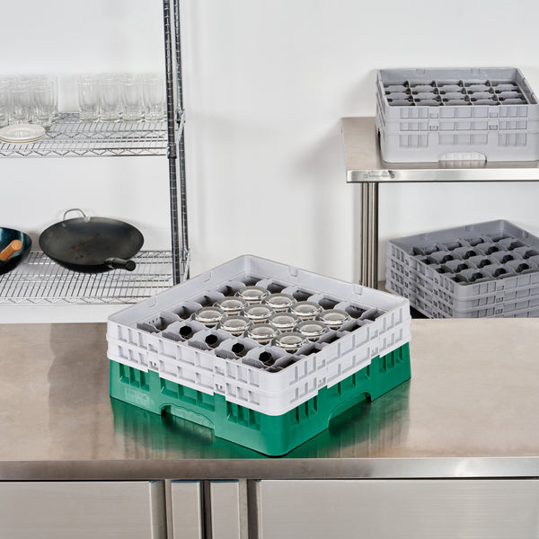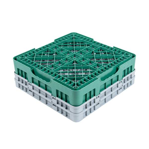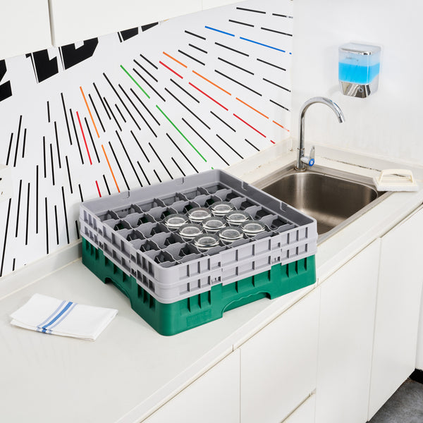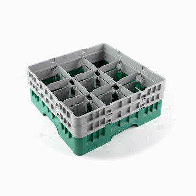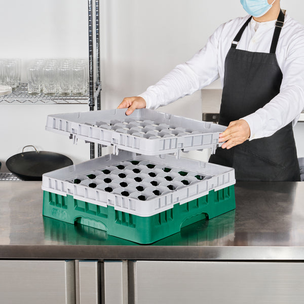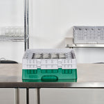 Optimize your glassware storage with our Clean Tek Professional Green Glass Rack. This rack features 9 compartments, providing a spacious and organized solution for your glassware storage needs. Equipped with 1 full drop extender, this commercial glass rack accommodates taller glassware effortlessly. Plus, the 1 half drop extender offers flexibility for a variety of barware organizer configurations. Constructed from durable PP, this dishwasher rack ensures long-lasting performance in demanding settings. For ease of use, this rack boasts an easy-to-handle design, making it perfect for busy kitchens. The open interior compartments promote quick drying and sanitation, while the solid external walls ensure the safety of your glassware. Measuring 19.69 inches in length by 19.69 inches in width by 7.24 inches in height, this compartment rack fits seamlessly in most commercial dishwashers. Sold in a 1 count box.
