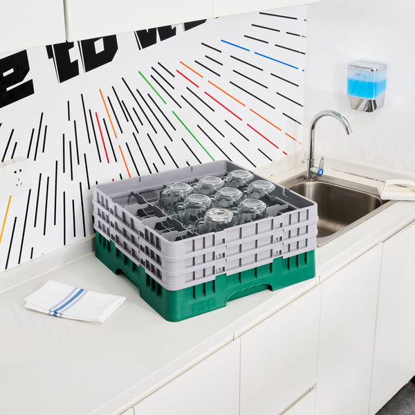 Our Clean Tek Professional Green Glass Rack revolutionizes glassware storage for the foodservice industry. This dishwasher rack features open interior compartments for enhanced cleaning, ensuring each glass sparkles. With the ability to hold up to 9 glasses, this compartment rack maximizes efficiency for busy bars and restaurants. Designed with solid external walls, this commercial glass rack provides superior protection for your valuable glassware. A full drop extender is included with this glass rack, allowing for versatility and ease of use in any cleaning scenario. Made of durable polypropylene, this barware organizer is built to withstand the demands of a commercial kitchen. The easy-to-handle design ensures effortless transport and stacking, optimizing your glassware storage solutions. Measuring 19.69 inches in length by 19.69 inches in width by 5.63 inches in height, this rack fits seamlessly into standard kitchen spaces. Sold in a 1 count box.