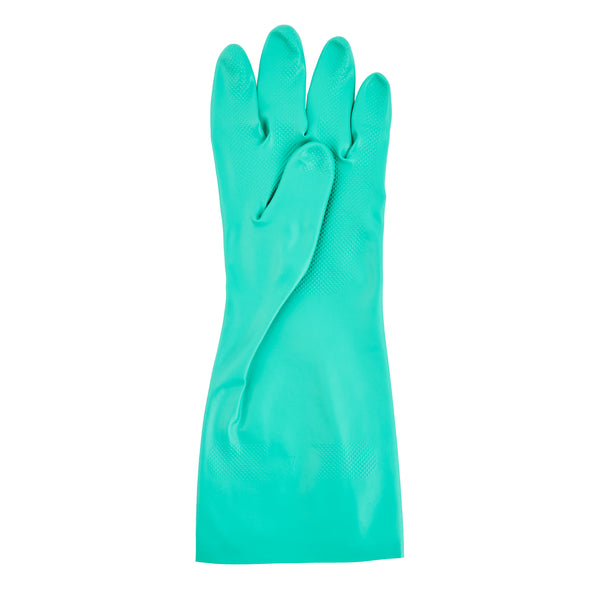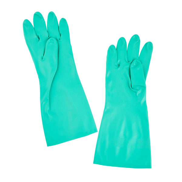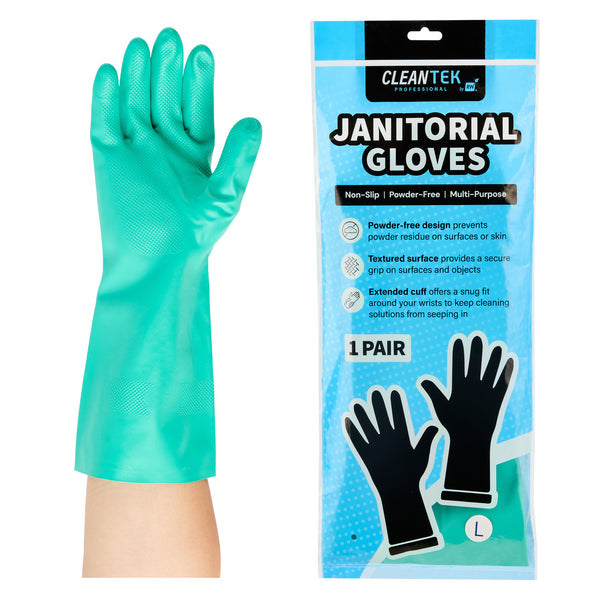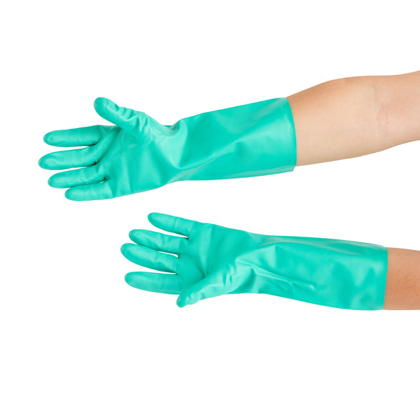 Safeguard your hands with superior protection against chemicals. Clean Tek Professional Green Rubber Chemical Resistant Gloves offer chemical resistance to ensure safety when working with cleaning chemicals, making them essential for maintaining hygiene in foodservice environments. These latex-free gloves eliminate the risk of allergic reactions, providing peace of mind for users with latex sensitivities. With a flocked grip, these gloves enhance handling in wet conditions, improving efficiency during food prep or cleaning tasks. The longer cuff design, measuring 12.99 inches, effectively shields wrists from splashes and spills, providing additional protection in fast-paced kitchens. Made from durable rubber, these gloves deliver high durability, ensuring they withstand the rigors of daily use. Equip your staff with these heavy-duty nitrile gloves to enhance workplace safety and performance. Each order includes 1 Pair of Clean Tek Professional Heavy-Duty Nitrile Gloves.