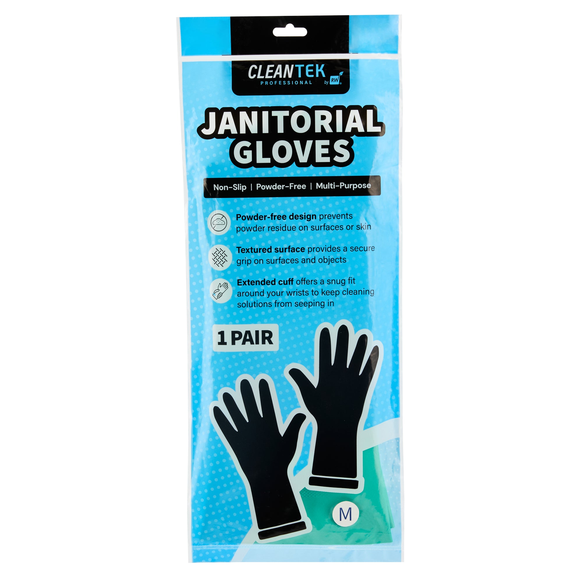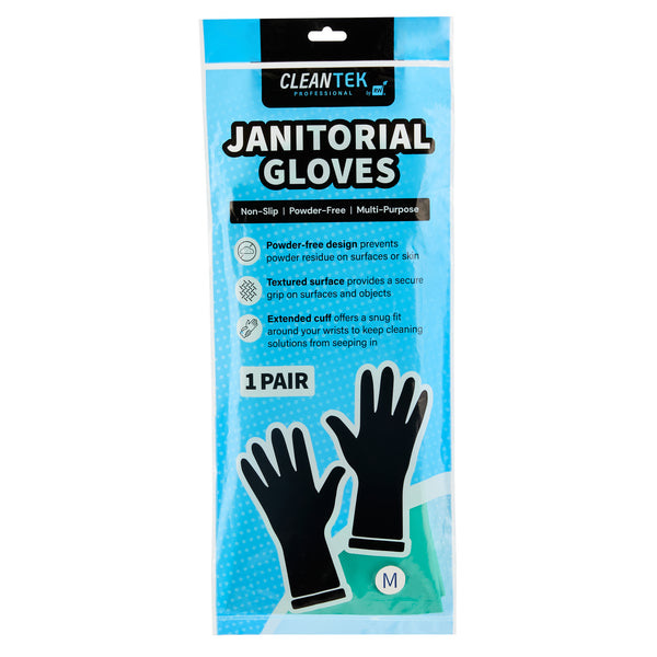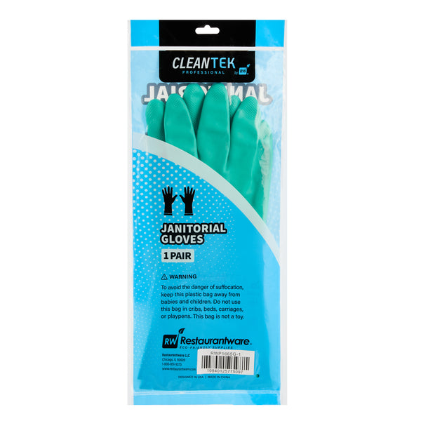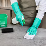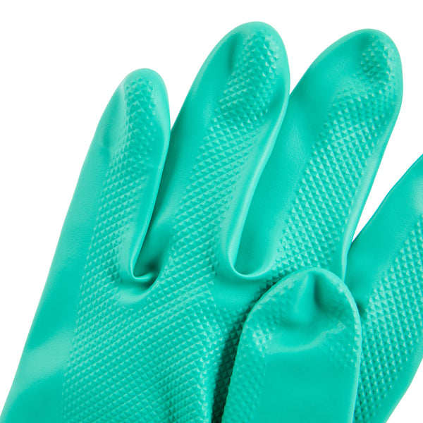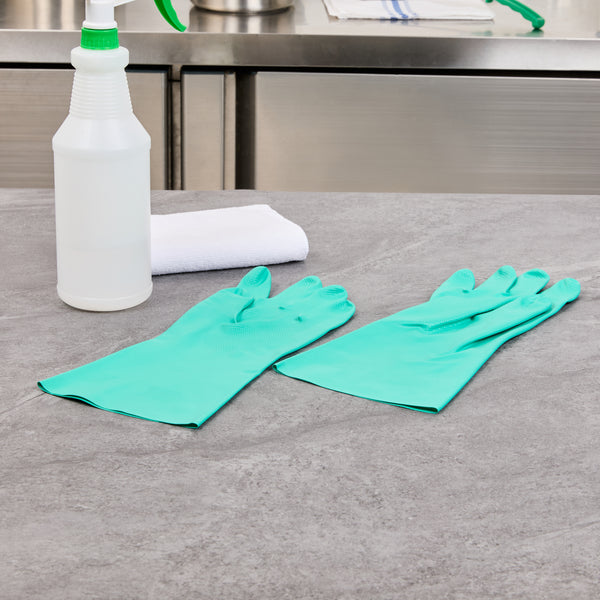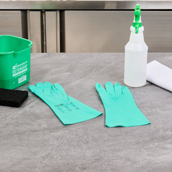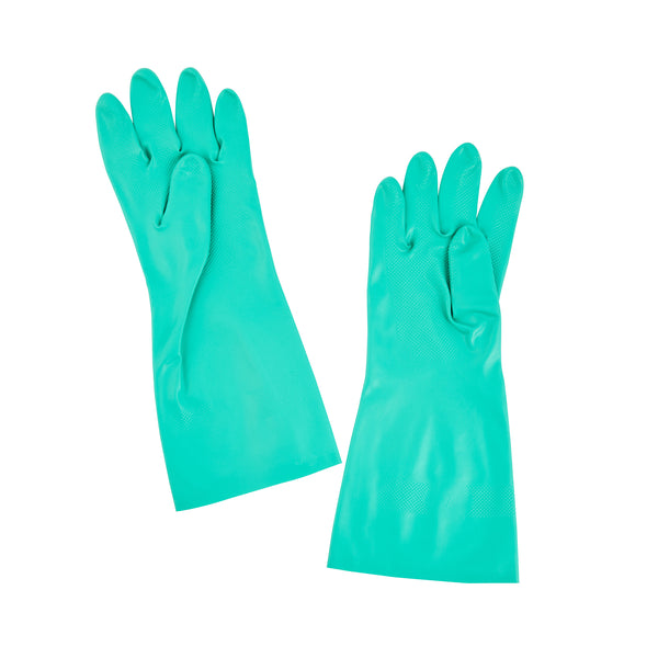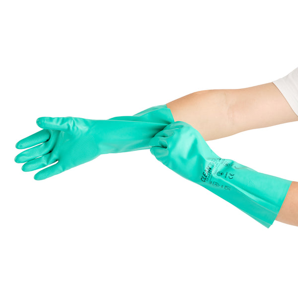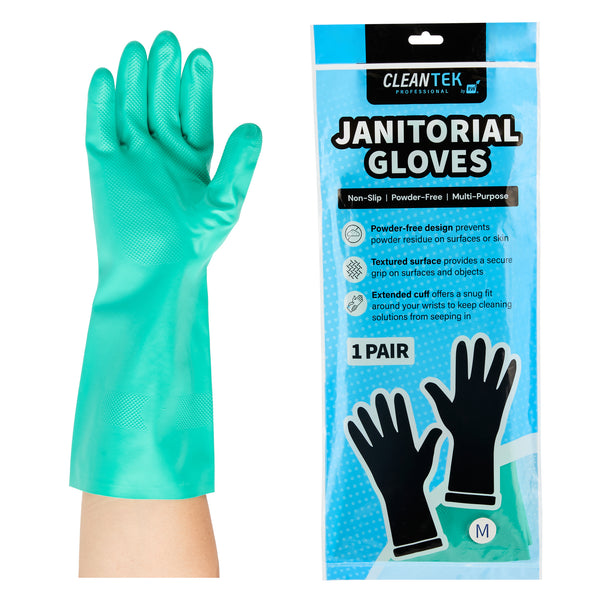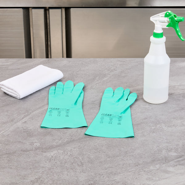 Ensure safety and comfort during cleaning tasks with reliable protection. Clean Tek Professional Chemical-Resistant Nitrile Gloves offer a durable 15-mil thickness that ensures hand protection during tough tasks, making them the ideal nitrile gloves for demanding environments. The chemical-resistant gloves are flock-lined to add comfort and keep hands dry for long wear, reducing hand fatigue for professionals who need to wear dishwashing gloves for extended periods. Designed with a long cuff, these gloves protect wrists and forearms from spills and debris, providing an added layer of security in commercial kitchens. Measuring 13 inches in length and 4 1/4 inches in width, these medium-sized gloves provide a snug fit, enhancing dexterity and grip. Made from high-quality nitrile material, these gloves are perfect for handling a variety of chemicals safely. Each order includes 1 Pair of Clean Tek Professional Chemical-Resistant Nitrile Gloves.