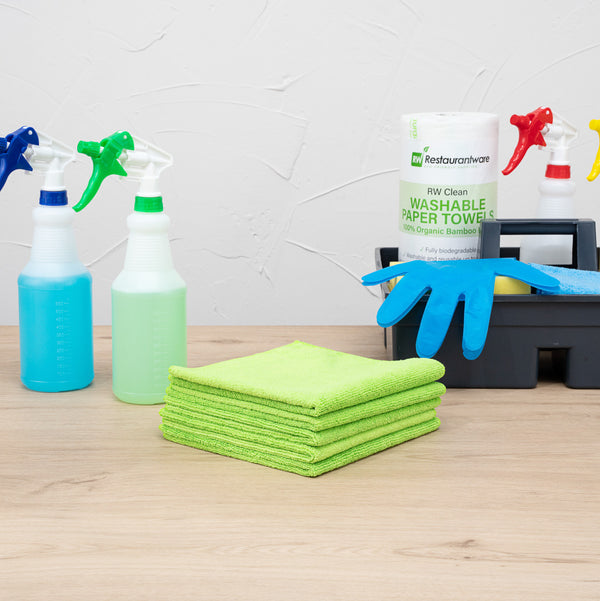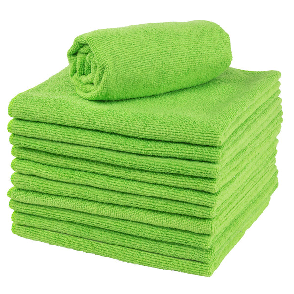 Provide customers with a sanitary dining experience by effectively wiping down surfaces with our Clean Tek Professional Green Microfiber Cleaning Cloths. Constructed from a blend of polyester microfibers, these non-abrasive cloths are perfect for cleaning kitchen equipment, windows, or tabletops without leaving lint or streaks behind. These microfiber cloths are great for polishing glassware at a bar or wiping down countertops at a restaurant. Featuring a green finish, these cleaning cloths can be easily implemented into a color-coded cleaning system to prevent cross-contamination at your foodservice establishment. These soft cleaning cloths provide you with an effortless way to clean delicate surfaces without causing damages. Conveniently machine-washable, these green cleaning cloths offer you a simple way to wash cloths after use. These microfiber cleaning rags can hold up to 4 times more moisture than traditional cotton cloths to effectively soak up messes. Each microfiber cloth measures 16 inches long by 16 inches wide. Each microfiber cloth measures 16 inches long by 16 inches wide. Shipped in a 10 count box.