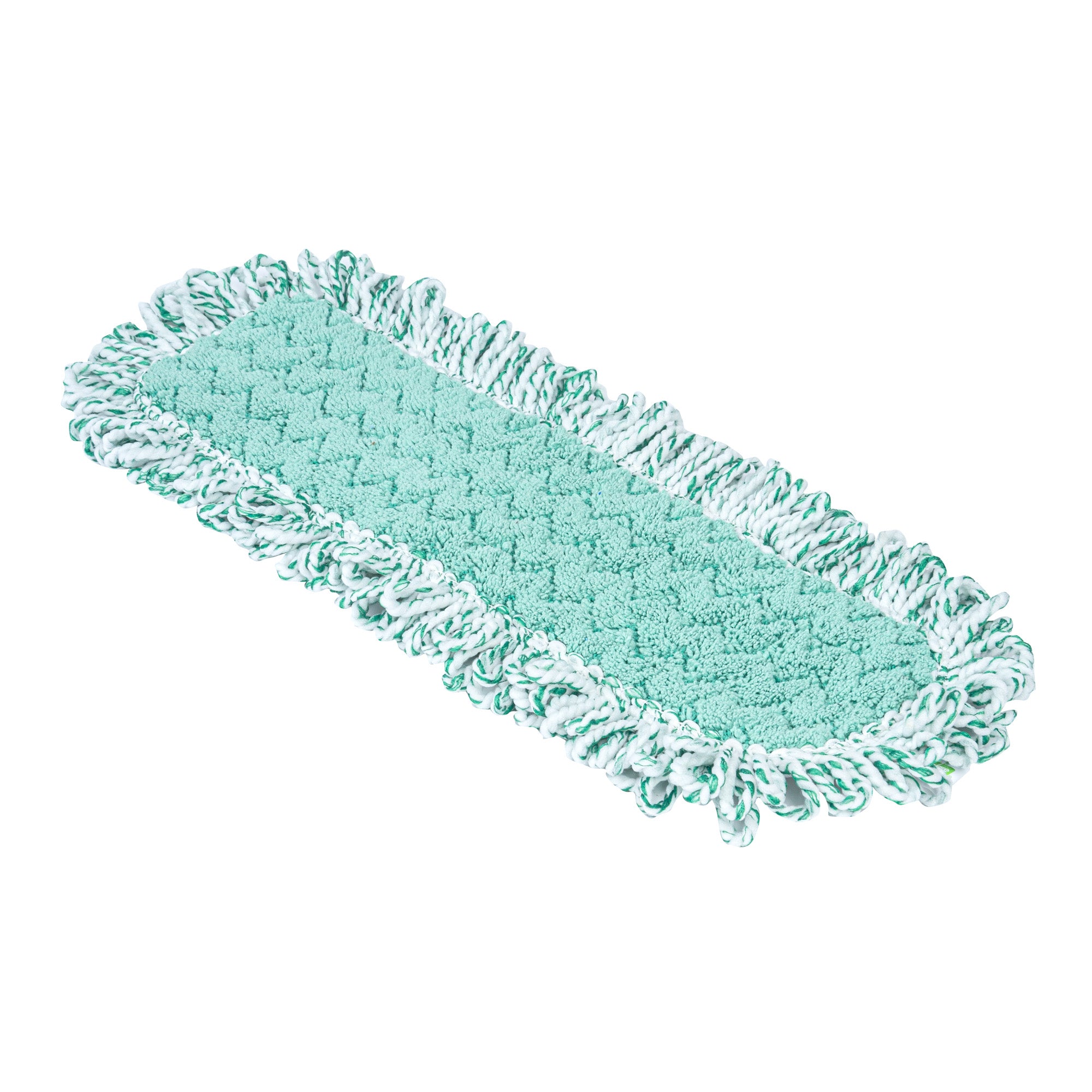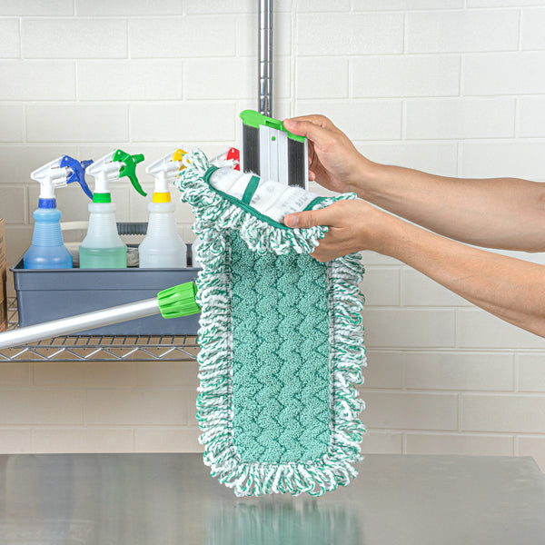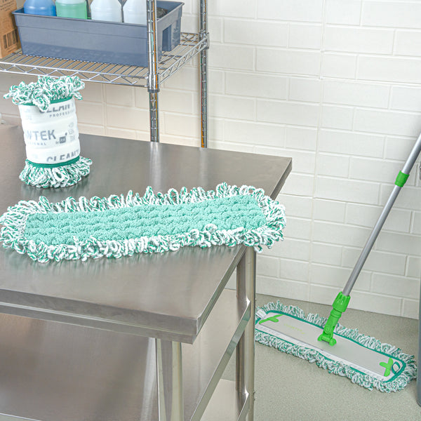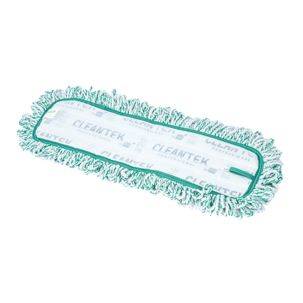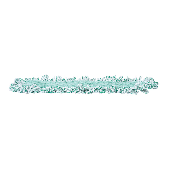 Elevate your cleaning game with our Clean Tek Professional Green Microfiber Fringed Dust Mop Pad. Featuring a zig zag pattern, this microfiber mop pad enhances cleaning performance by increasing contact area, allowing it to capture and hold more dirt, dust, and debris. Pair this reusable mop pad with their matching mop frame (SKU: RWT1751G) and handle (SKU: RWT1753G) for an all-in-one cleaning solution that delivers excellent results. The fringes on this mop pad extend their reach, making it easy to clean around obstacles and into hard-to-reach areas. With a hook-and-loop backing, this microfiber mop pad ensures secure placement and prevents slippage during use. Featuring a green color, this dry mop pad can be used for color-coordinating cleaning tasks to maintain hygiene standards. Measuring 22 inches in length by 9 inches in width, this dust mop pad is perfect for covering large surface areas efficiently. Sold in a 1 count box. Mop frame and handle are available and sold separately.