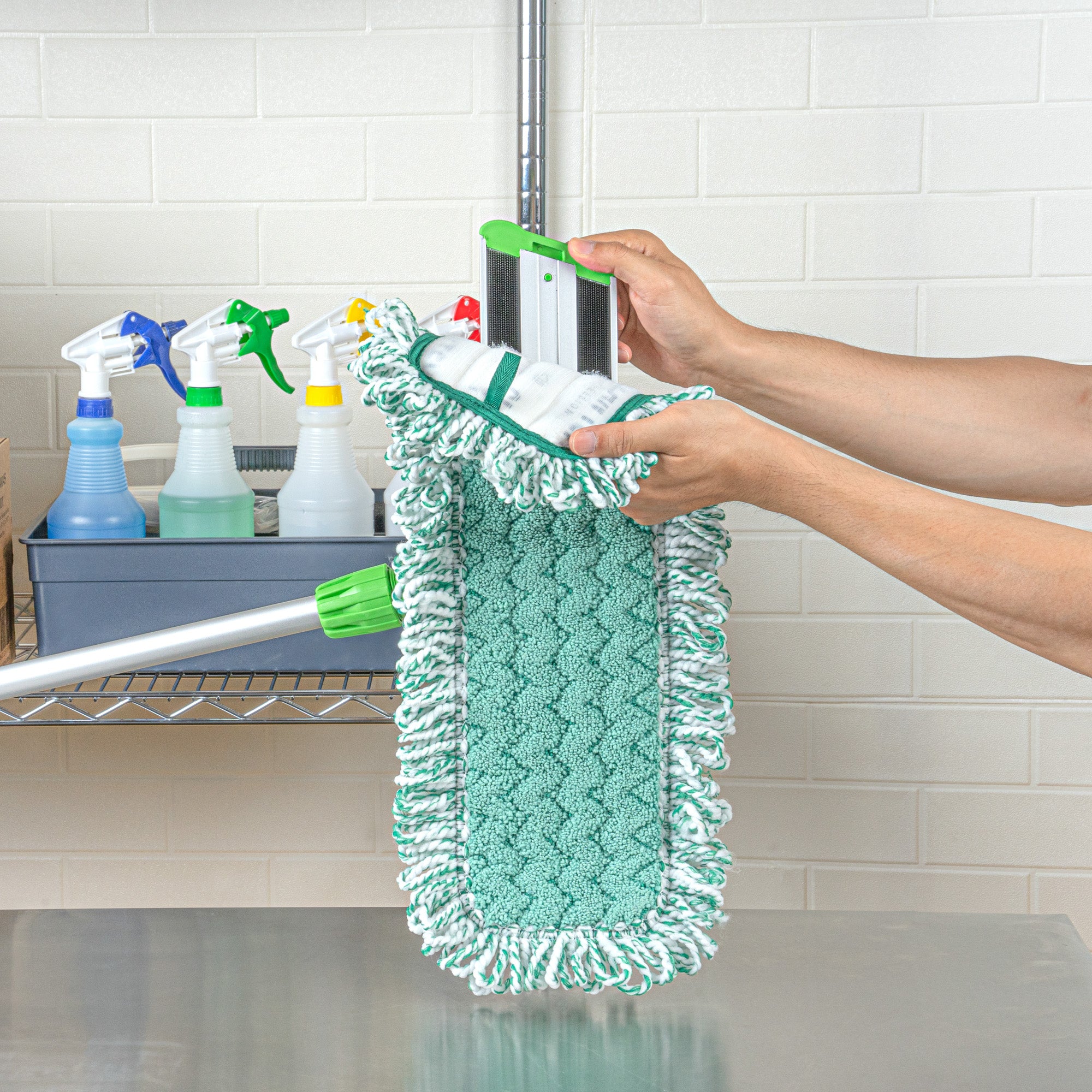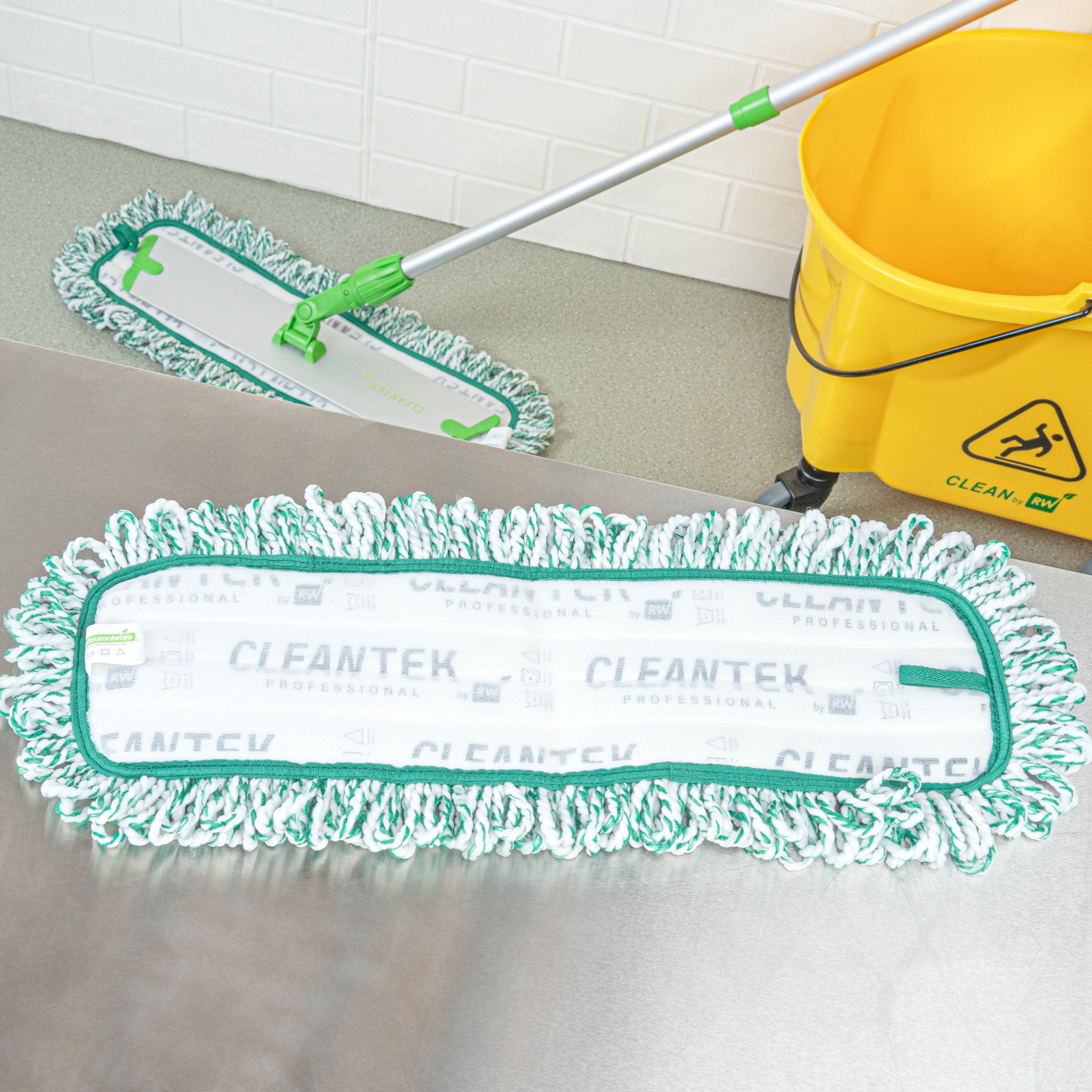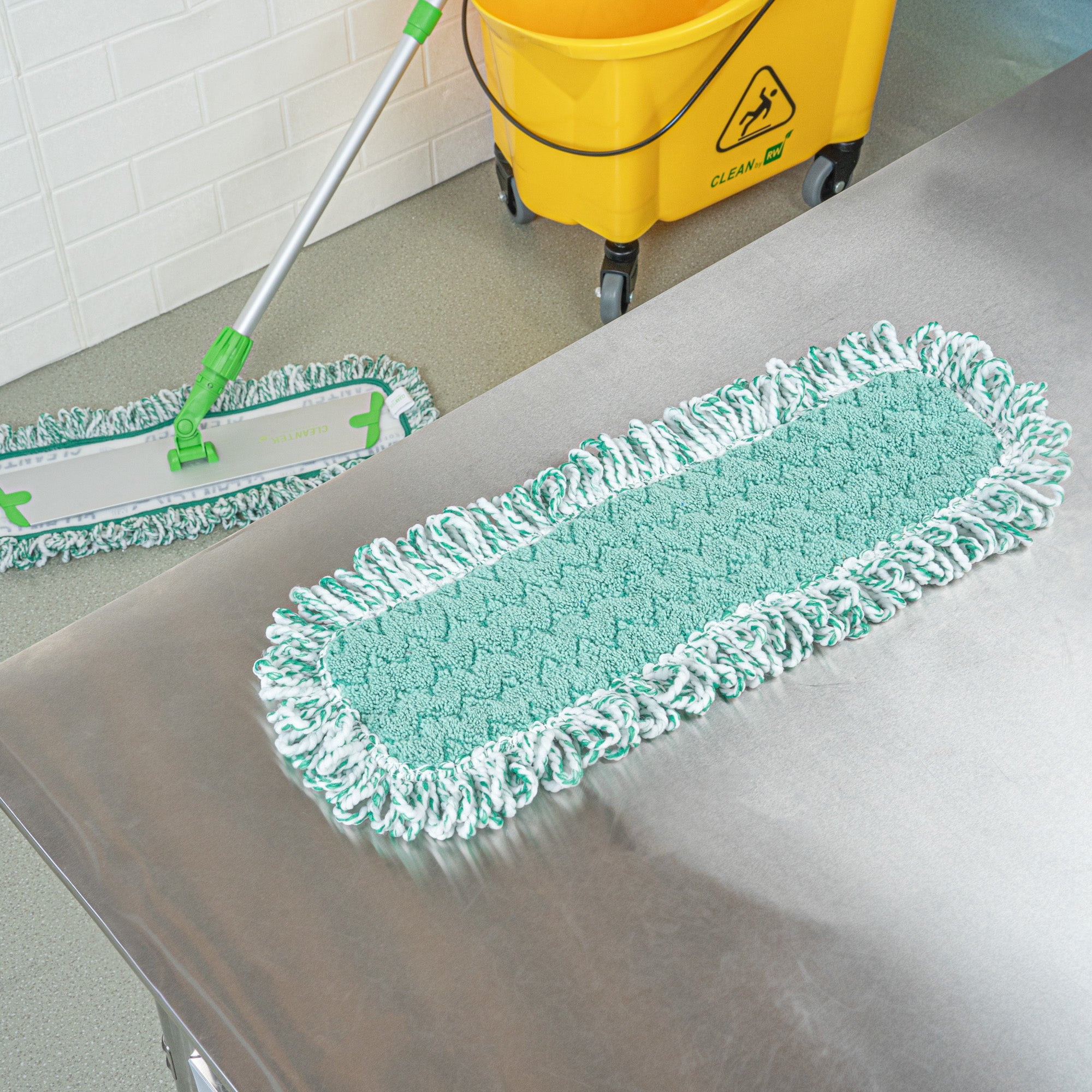 Elevate your cleaning game with our Clean Tek Professional Green Microfiber Fringed Dust Mop Pad. Featuring a zig zag pattern, this microfiber mop pad enhances cleaning performance by increasing contact area, allowing it to capture and hold more dirt, dust, and debris. Pair this reusable mop pad with their matching mop frame (SKU: RWT1751G) and handle (SKU: RWT1753G) for an all-in-one cleaning solution that delivers excellent results. The fringes on this mop pad extend their reach, making it easy to clean around obstacles and into hard-to-reach areas. With a hook-and-loop backing, this microfiber mop pad ensures secure placement and prevents slippage during use. Featuring a green color, this dry mop pad can be used for color-coordinating cleaning tasks to maintain hygiene standards. Measuring 22 inches in length by 9 inches in width, this dust mop pad is perfect for covering large surface areas efficiently. Sold in a 1 count box. Mop frame and handle are available and sold separately.