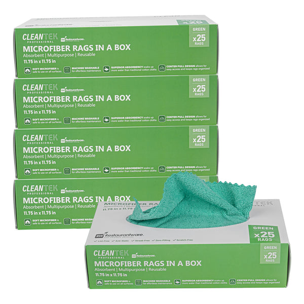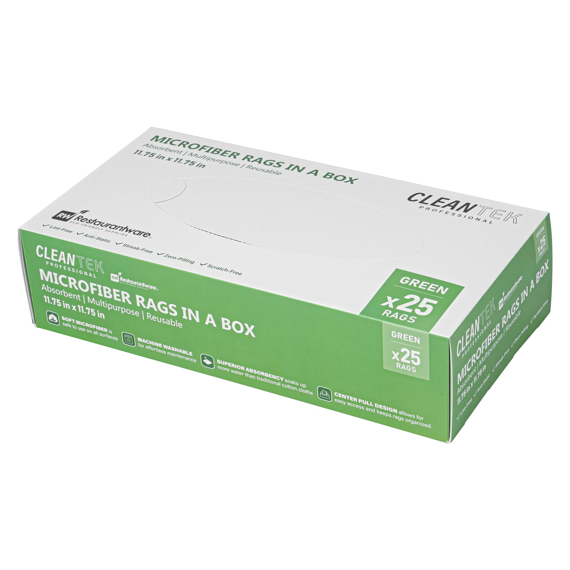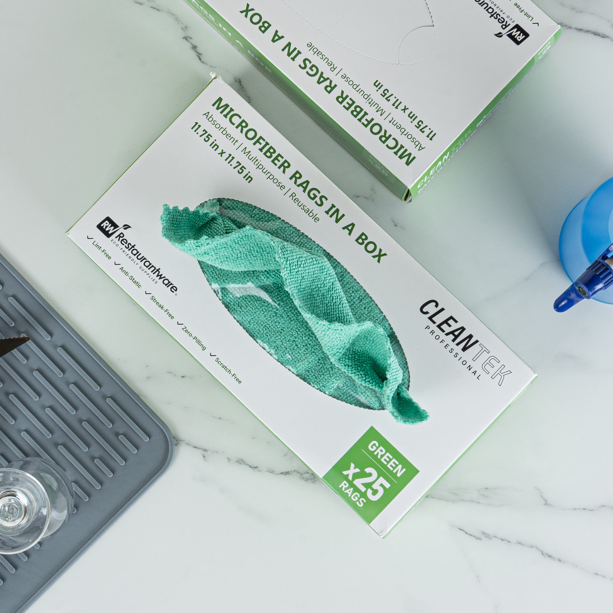 Revolutionize your cleaning routine with our Clean Tek Professional Green Microfiber Rags In A Box. These microfiber cloths come packaged in a dispenser box, allowing for easy dispensing and quick access, making them perfect for various cleaning tasks. Crafted from a blend of polyester and polyamide microfibers, these cleaning rags are durable and ensure you can thoroughly clean windows without leaving streaks. These microfiber towels are highly absorbent and effortlessly tackle spills and dry surfaces without any streaks. Designed for versatility, these microfiber rags are ideal for dusting, wiping surfaces, polishing, and absorbing spills. Featuring seamless wavy edges, these polishing cloths provide scratch-free cleaning, making them perfect for delicate surfaces and achieving a flawless finish. The green finish of these microfiber cleaning cloths facilitates easy identification, minimizing the risk of mix-ups and ensuring efficient use for specific tasks. Measuring 11.81 inches in length by 11.81 inches in width, these cleaning cloths offer ample coverage for various tasks. Each order includes 25 rags.