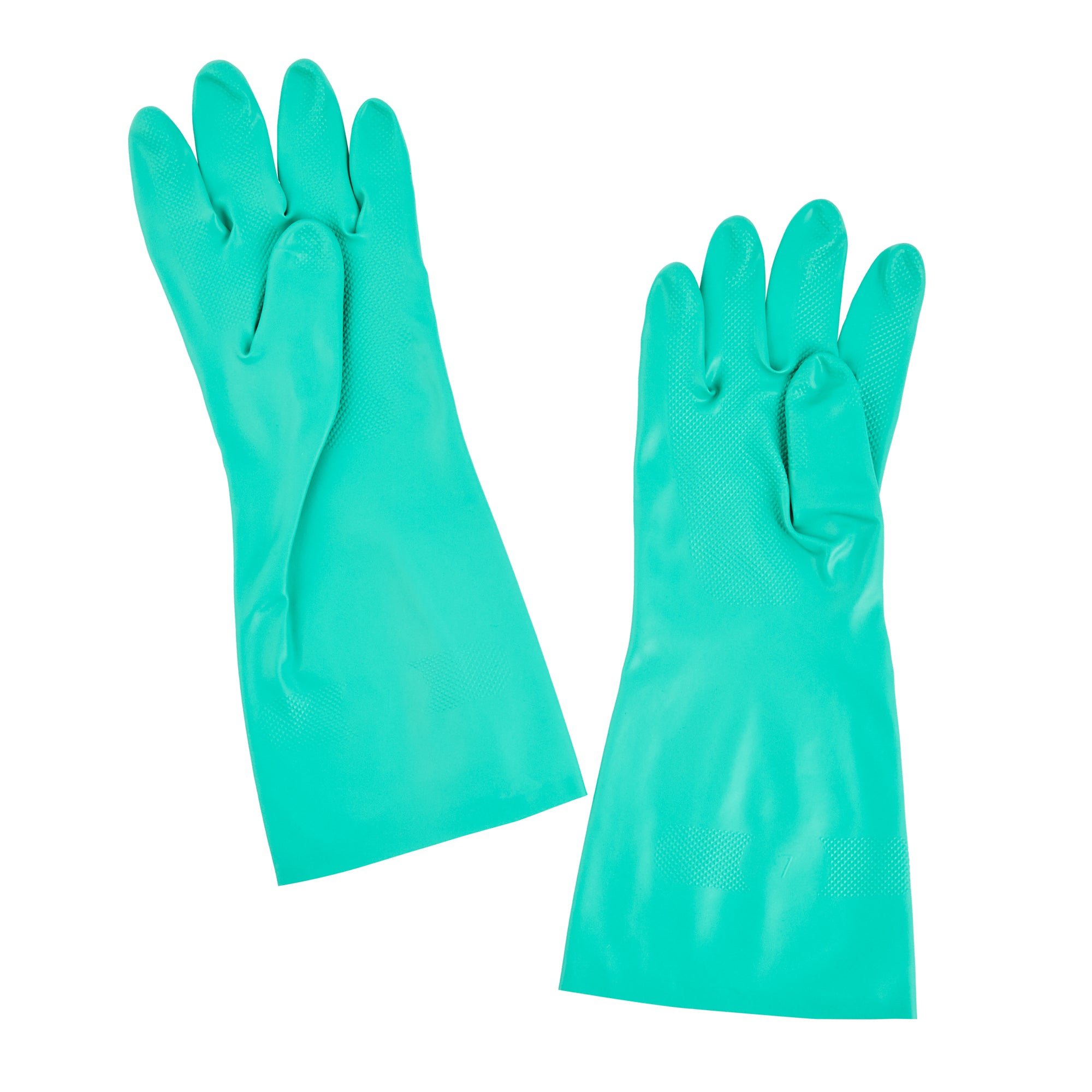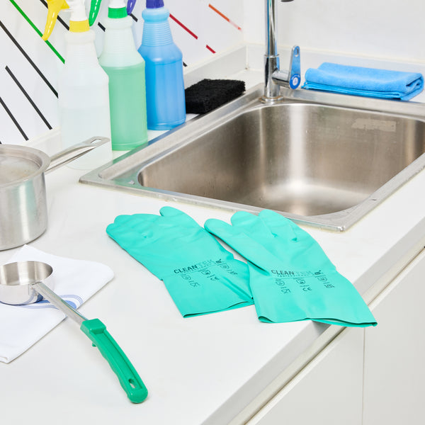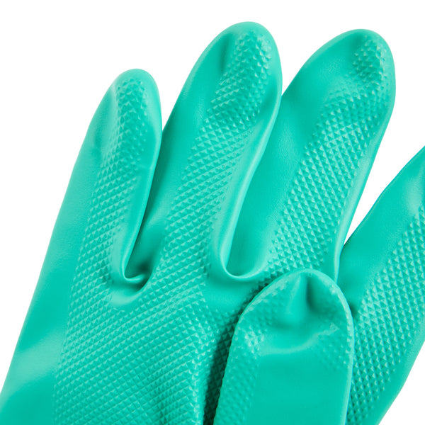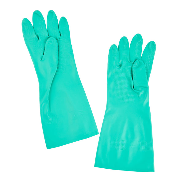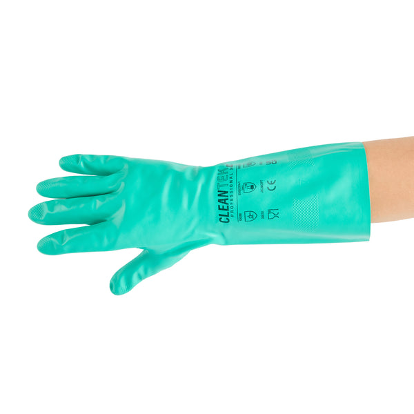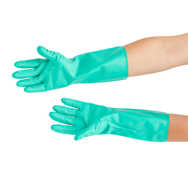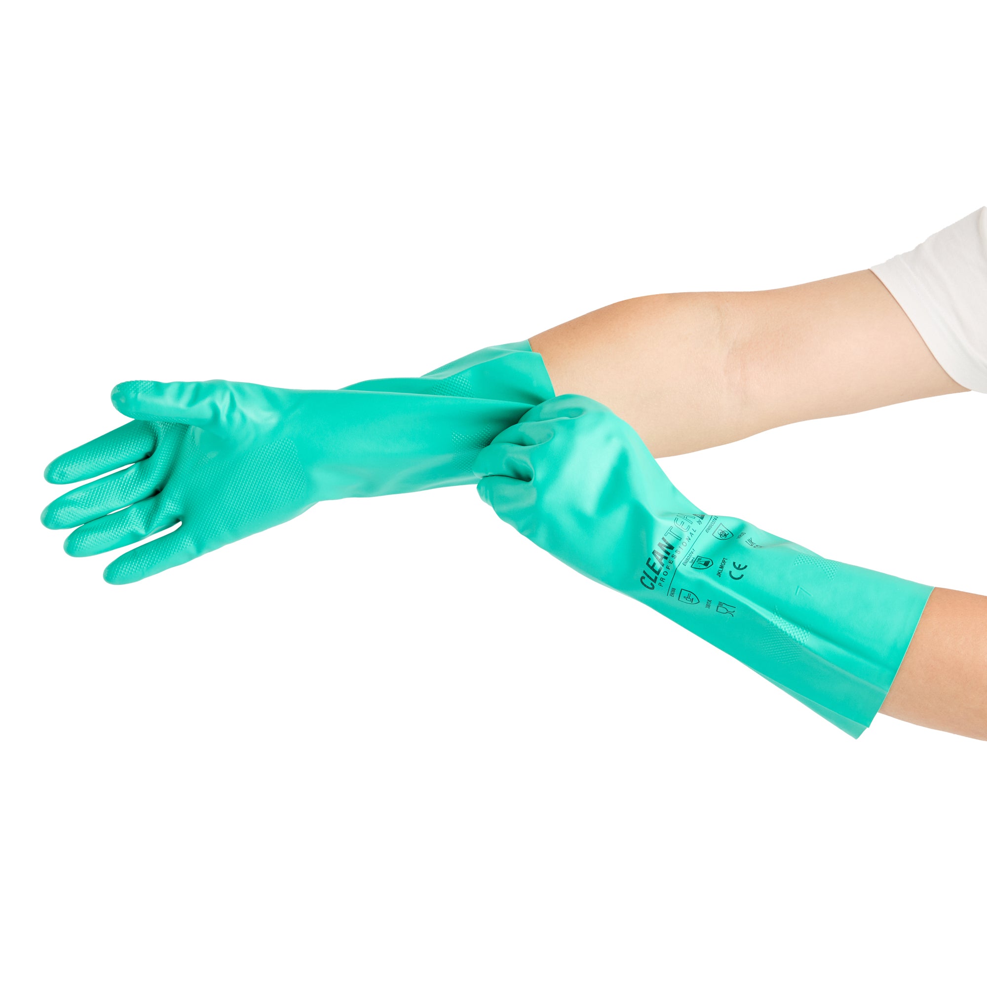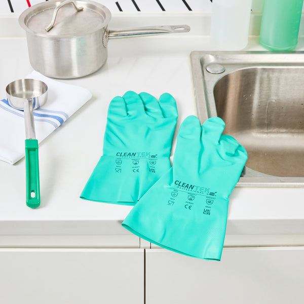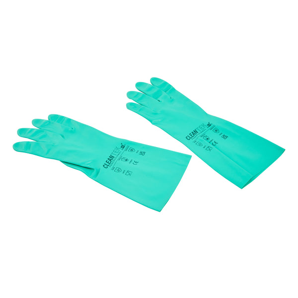 Protect your team with robust and reliable hand protection. Clean Tek Professional Chemical-Resistant Nitrile Gloves offer a durable 15-mil thickness that ensures superior protection in the most rigorous cleaning tasks, making these nitrile gloves an essential tool in any foodservice establishment. The flock lining provides added comfort and keeps hands dry, reducing fatigue for kitchen staff who rely on dishwashing gloves for long shifts. With a long cuff design, these chemical resistant gloves shield wrists and forearms from liquids and debris, critical for maintaining safety standards in commercial kitchens and janitorial duties. Designed with a 13-inch length and XXL size, these gloves accommodate larger hands comfortably, ensuring a secure fit. Made from resilient nitrile material, they offer robust protection against a variety of chemicals, ensuring safety and compliance with food safety regulations. Each order includes 1 Pair of Clean Tek Professional Chemical-Resistant Gloves.