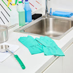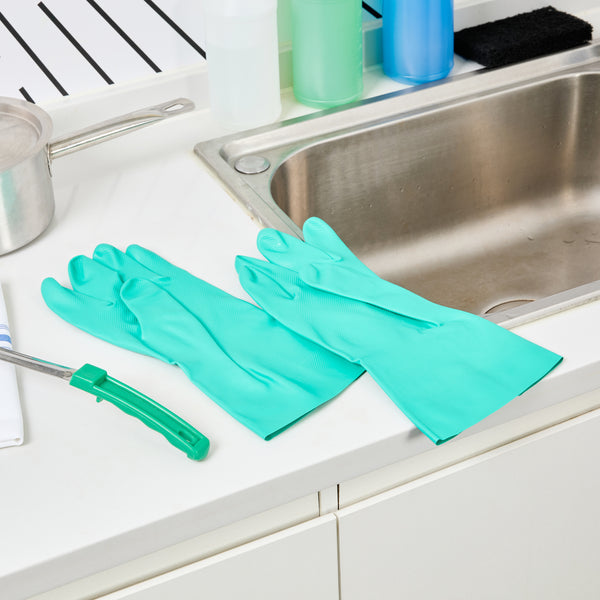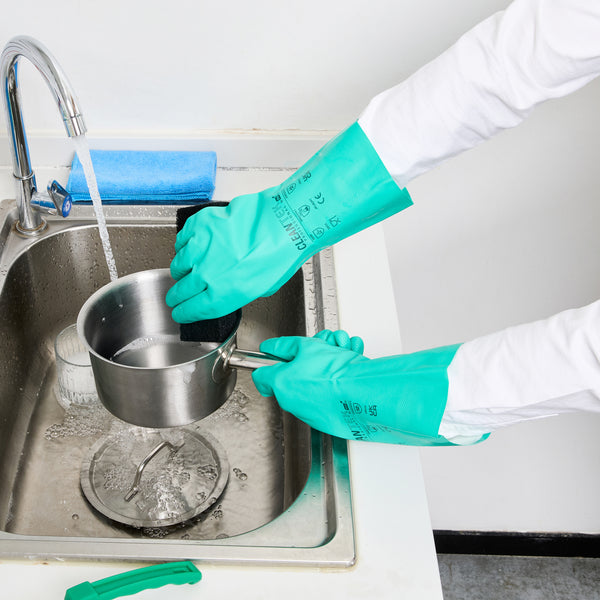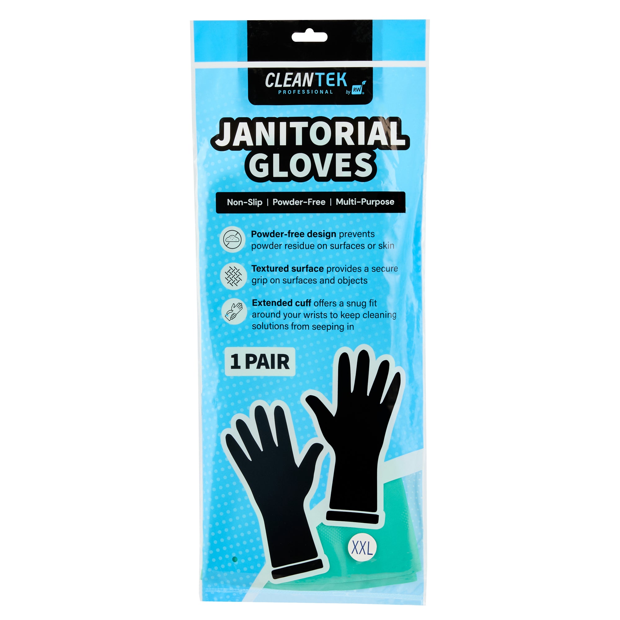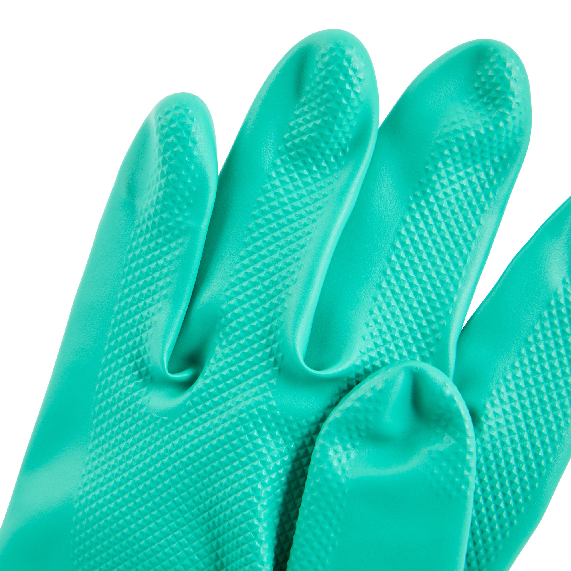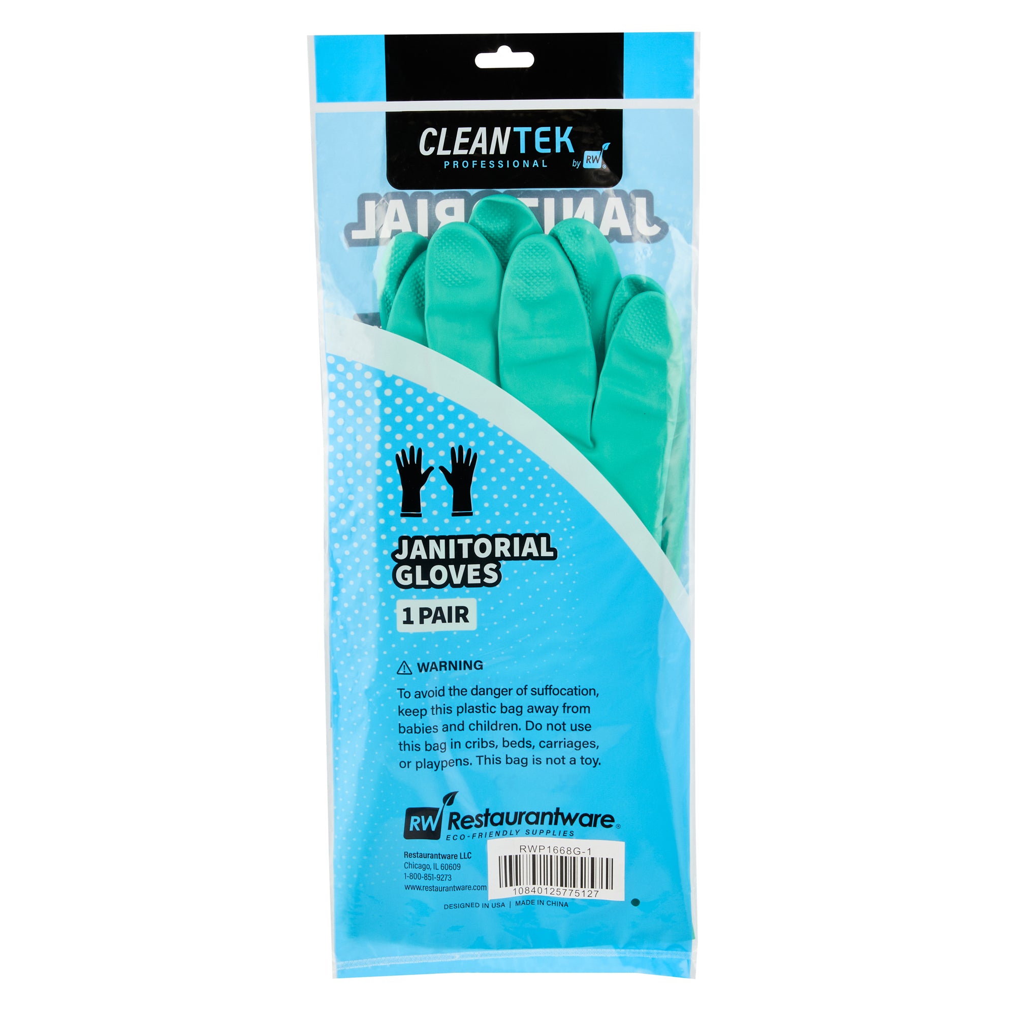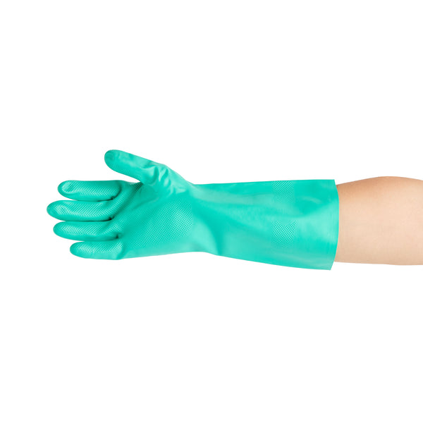Protect your team with robust and reliable hand protection. Clean Tek Professional Chemical-Resistant Nitrile Gloves offer a durable 15-mil thickness that ensures superior protection in the most rigorous cleaning tasks, making these nitrile gloves an essential tool in any foodservice establishment. The flock lining provides added comfort and keeps hands dry, reducing fatigue for kitchen staff who rely on dishwashing gloves for long shifts. With a long cuff design, these chemical resistant gloves shield wrists and forearms from liquids and debris, critical for maintaining safety standards in commercial kitchens and janitorial duties. Designed with a 13-inch length and XXL size, these gloves accommodate larger hands comfortably, ensuring a secure fit. Made from resilient nitrile material, they offer robust protection against a variety of chemicals, ensuring safety and compliance with food safety regulations. Each order includes 1 Pair of Clean Tek Professional Chemical-Resistant Gloves.