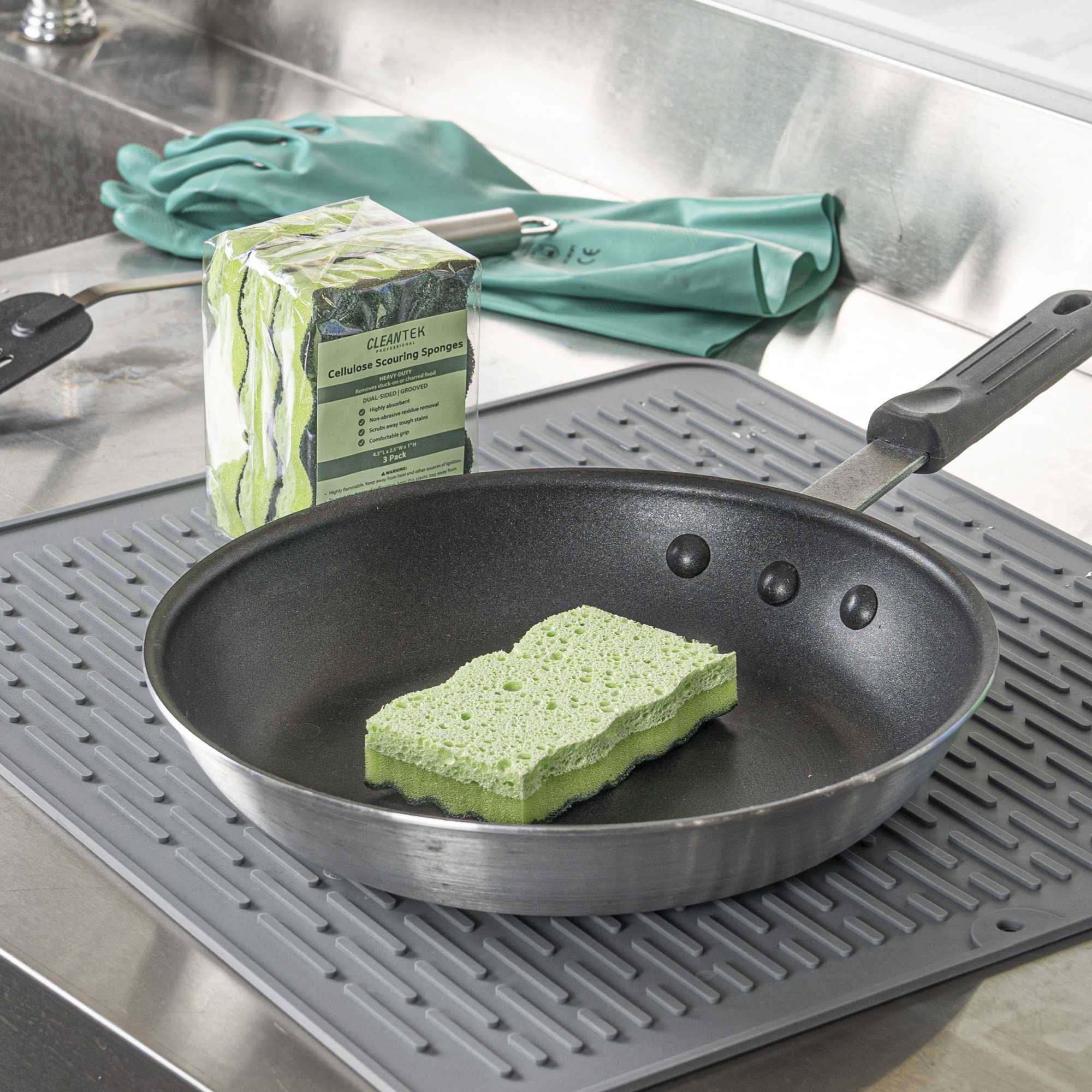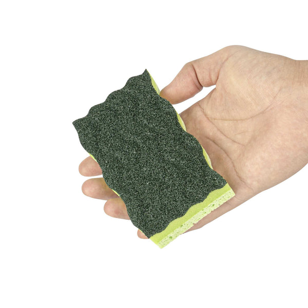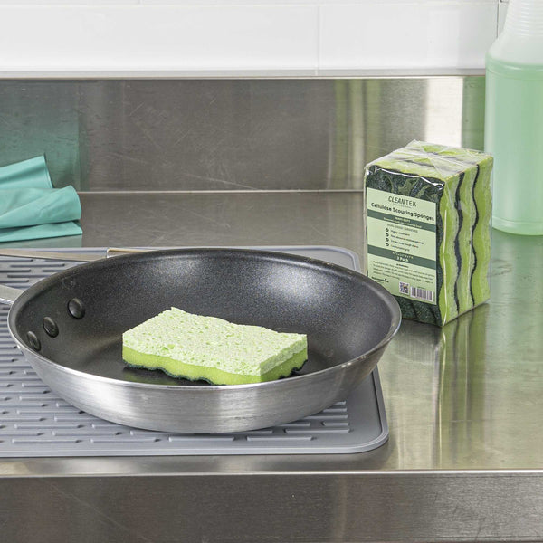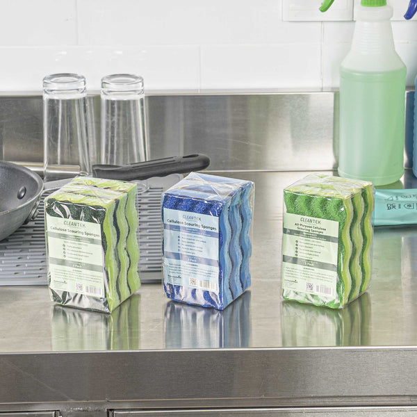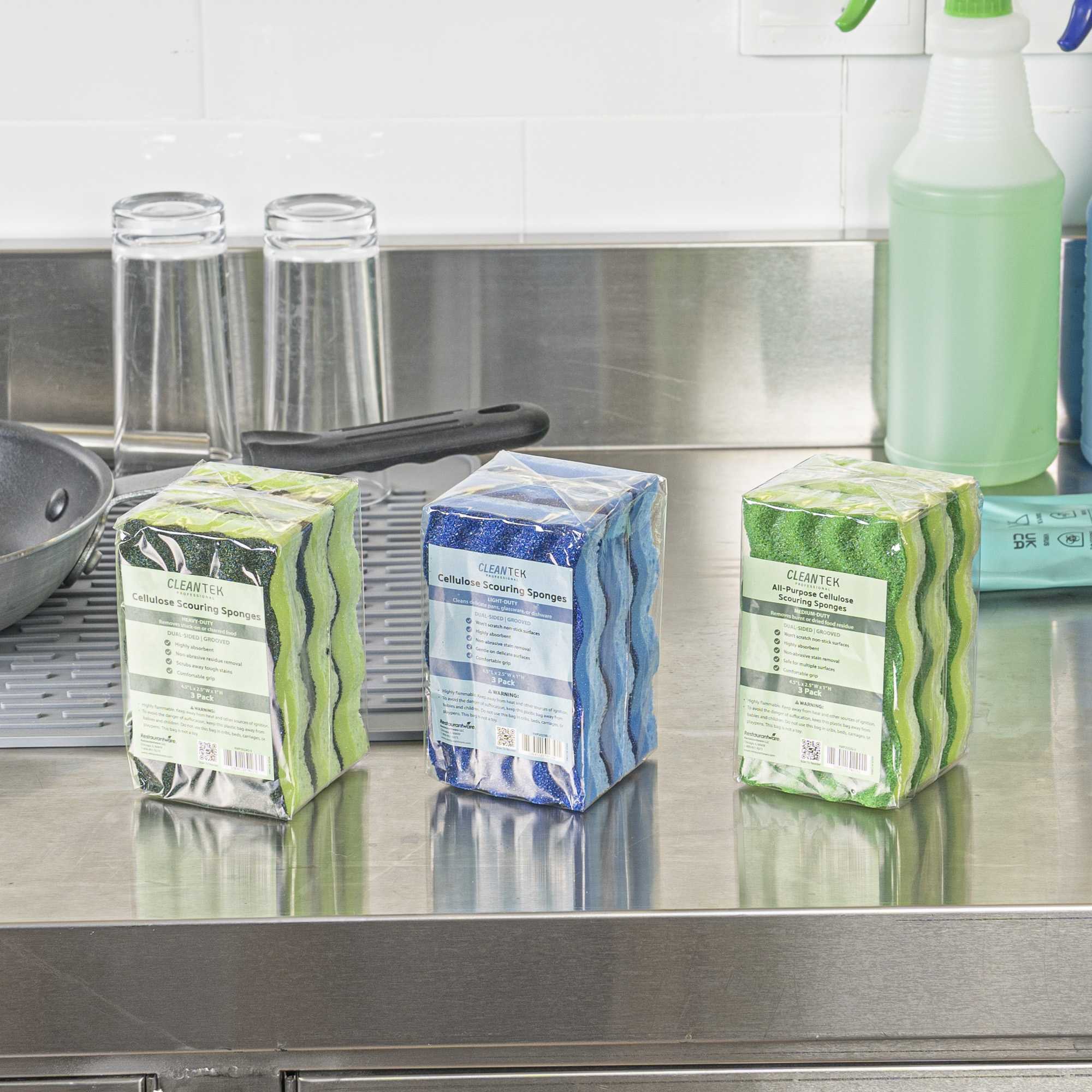 Scrub away stubborn kitchen grime effortlessly. The Clean Tek Professional Scrubbing Efficiency Cellulose Scouring Sponge features a tough scrubbing surface that quickly removes stubborn grime, making it a reliable cellulose scouring sponge for foodservice professionals. Designed with deep grooves, this heavy-duty scrubber efficiently cleans baked-on food residue, ensuring your cookware shines like new. Ideal for heavy-duty use in busy kitchens, this pot and pan scrubber withstands consistent use, making it an essential tool for any bustling commercial kitchen. Crafted from cellulose, these green sponges measure 4.53 inches in length, 2.56 inches in width, and 0.91 inches in height, providing a sustainable choice without compromising on performance. Trust in its durability and transform your cleaning routine. Each order includes 3 Clean Tek Professional Scrubbing Efficiency Cellulose Scouring Sponges.