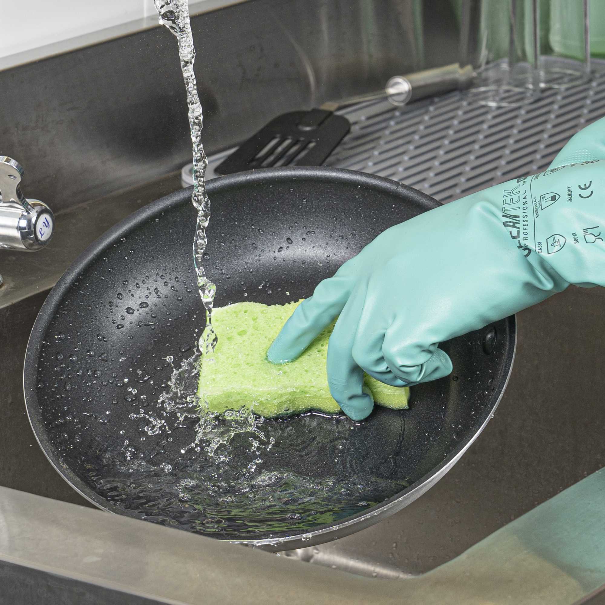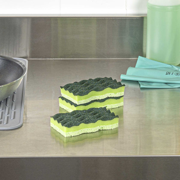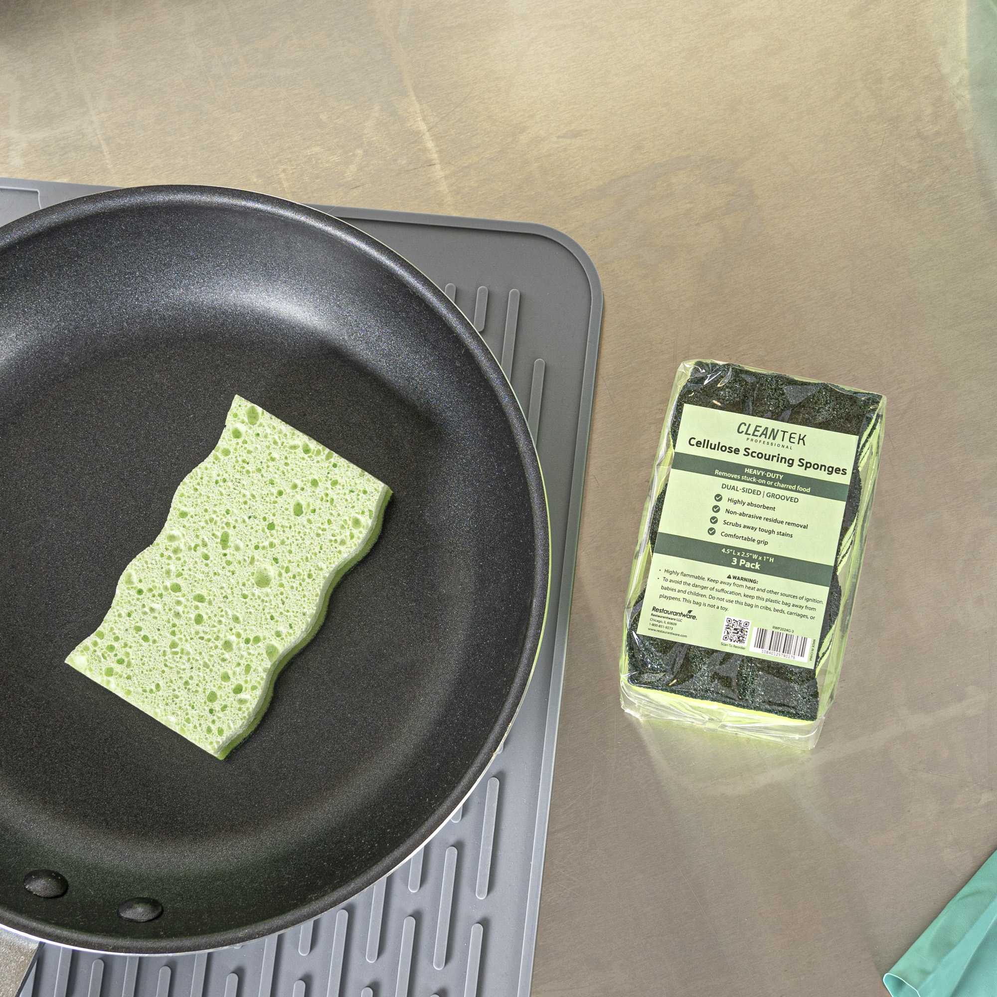 Scrub away stubborn kitchen grime effortlessly. The Clean Tek Professional Scrubbing Efficiency Cellulose Scouring Sponge features a tough scrubbing surface that quickly removes stubborn grime, making it a reliable cellulose scouring sponge for foodservice professionals. Designed with deep grooves, this heavy-duty scrubber efficiently cleans baked-on food residue, ensuring your cookware shines like new. Ideal for heavy-duty use in busy kitchens, this pot and pan scrubber withstands consistent use, making it an essential tool for any bustling commercial kitchen. Crafted from cellulose, these green sponges measure 4.53 inches in length, 2.56 inches in width, and 0.91 inches in height, providing a sustainable choice without compromising on performance. Trust in its durability and transform your cleaning routine. Each order includes 3 Clean Tek Professional Scrubbing Efficiency Cellulose Scouring Sponges.