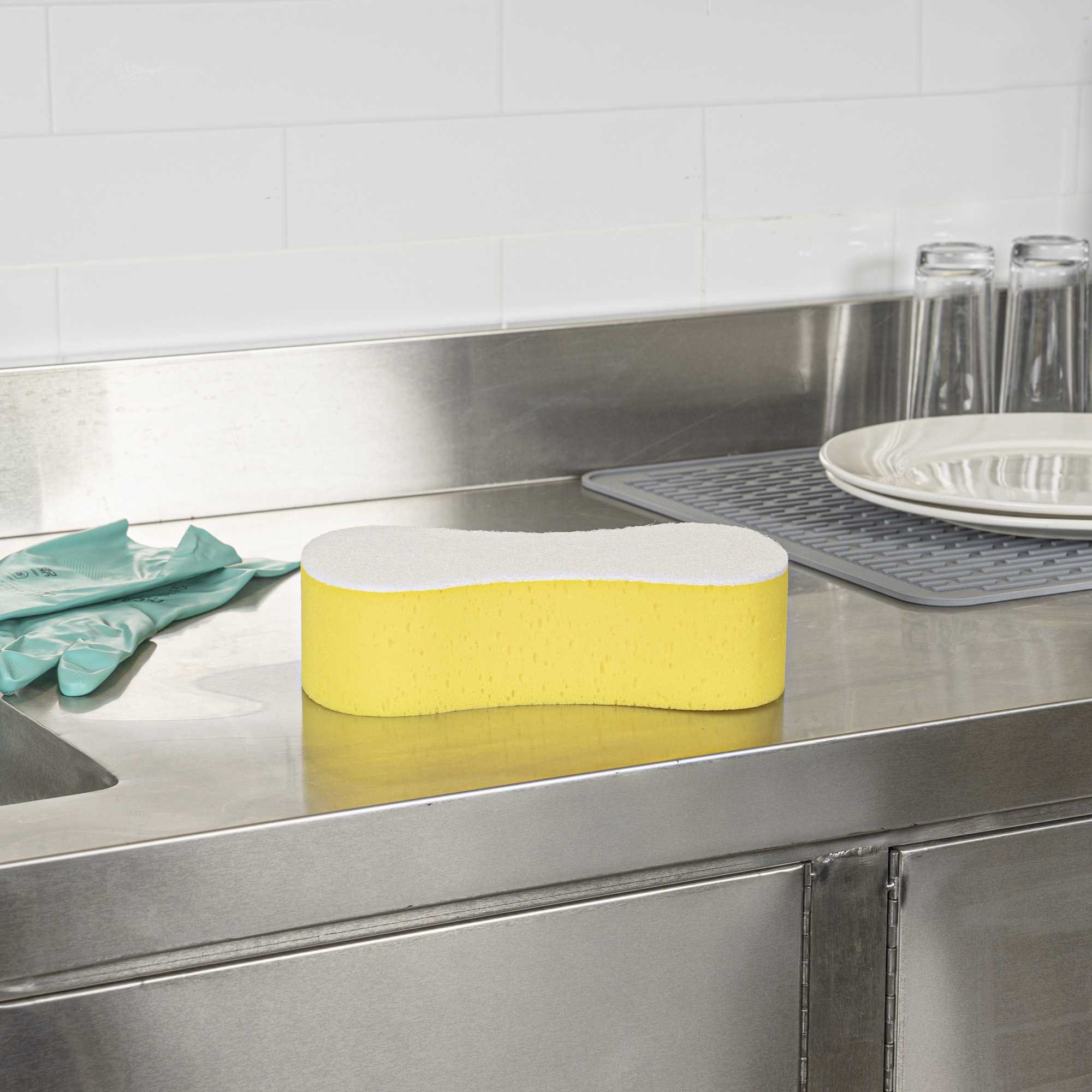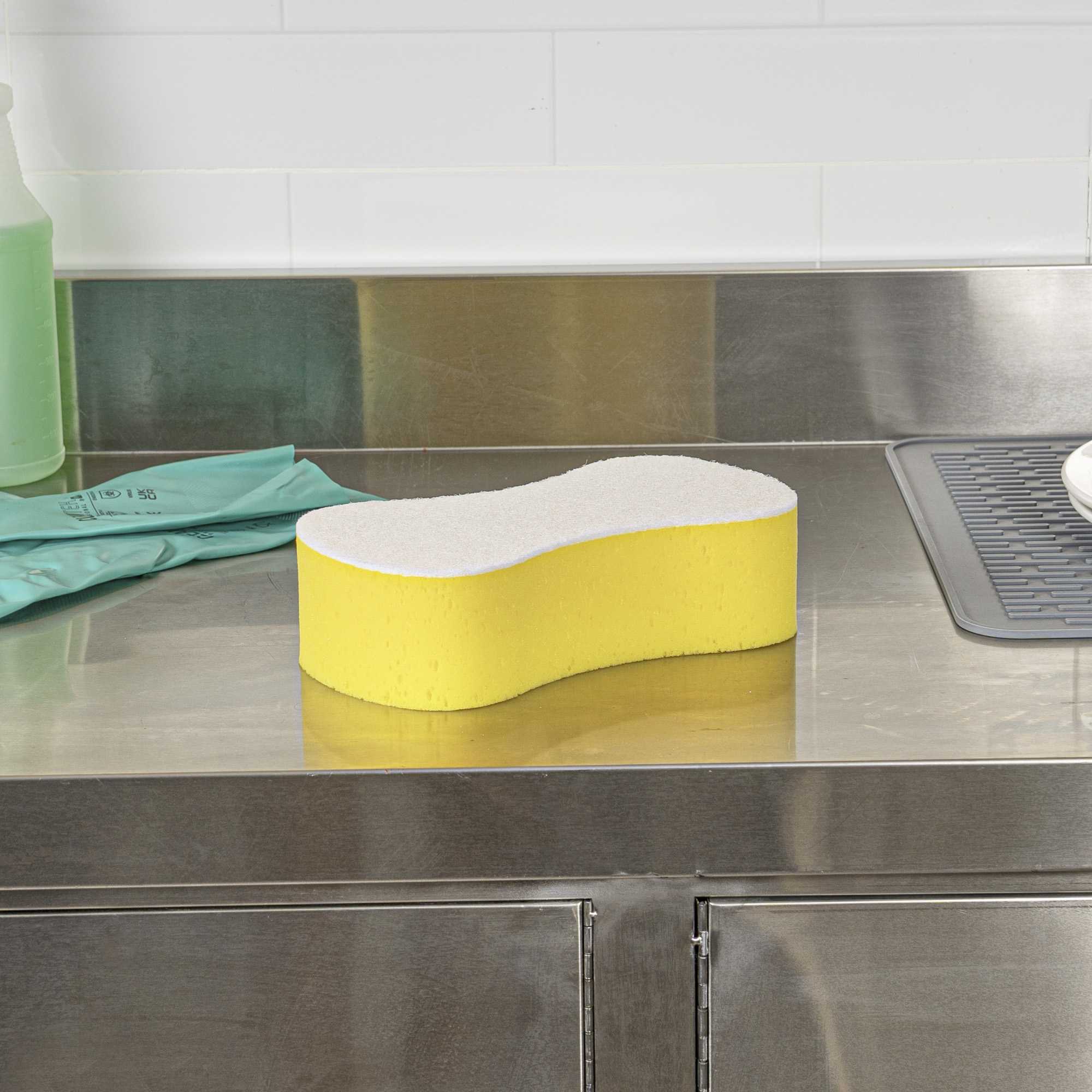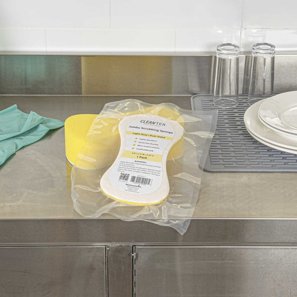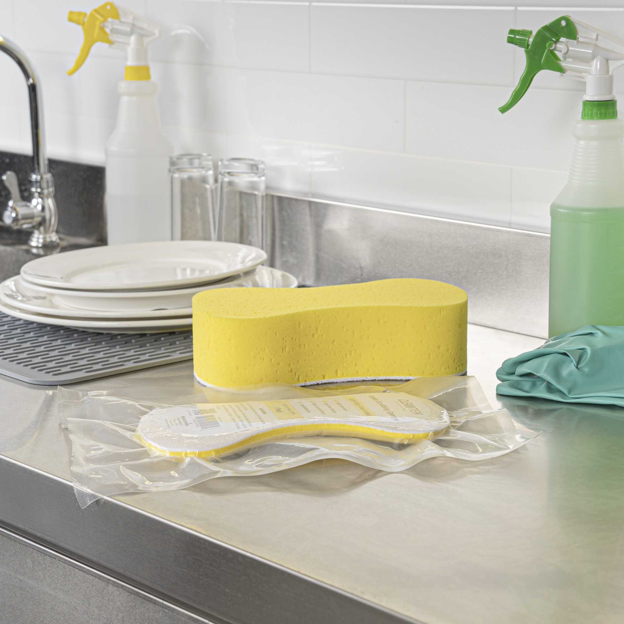 Ensure spotless results with versatile cleaning solutions. Clean Tek Professional Dual-Functionality Plastic Sponge and Scouring Pad Combo seamlessly combines a sponge and scouring pad, enabling you to efficiently clean both surfaces and corners in your commercial kitchen. Crafted from durable plastic, this commercial kitchen sponge is flexible, making it ideal for reaching hard-to-access areas like corners and crevices. Measuring 9.4 inches in length, this multi-surface scrubber covers extensive areas in fewer strokes, boosting productivity and reducing cleaning time. The dual design is perfect for scrubbing walls, railings, floors, desks, coffee makers, stairways, and countertops, making it an indispensable tool in any foodservice establishment. Elevate your cleaning routine with this essential kitchen accessory and maintain the highest standards of hygiene. Each order includes 1 Clean Tek Professional Dual-Functionality Plastic Sponge and Scouring Pad Combo.