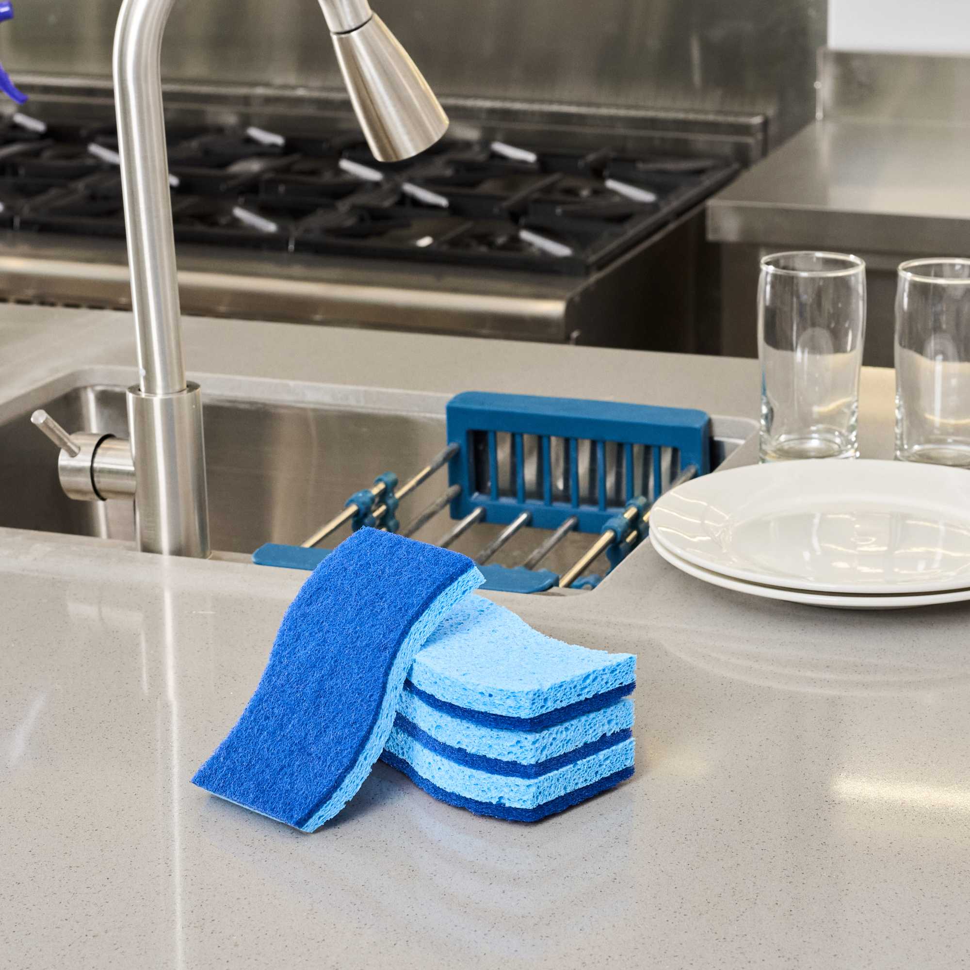 Tackle everyday cleaning with ease using our Clean Tek Professional Light Blue Cellulose Sponge / Dark Blue Medium-Duty Scouring Pad Combos. Featuring a dual-sided design, these versatile sponges combine an absorbent light blue cellulose side for quick liquid pickup with a dark blue medium-duty pad that scrubs away everyday grease and grime without damaging surfaces. Ideal for use on countertops, cookware, and appliances, its ergonomic wavy shape ensures a comfortable grip during extended cleaning tasks. Measuring 5.98 inches in length by 3.5 inches in width, these sponges offer a generous surface area for efficient cleaning, perfect for high-volume kitchens and foodservice operations. Sold in a 3 count box.
