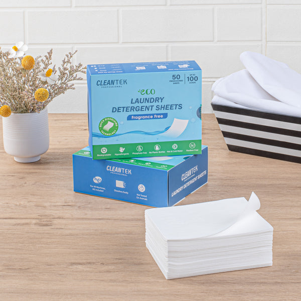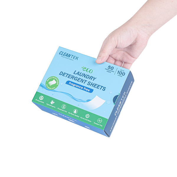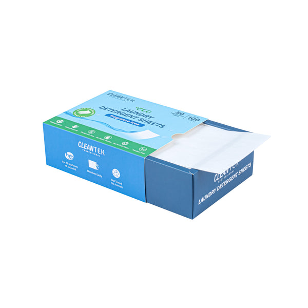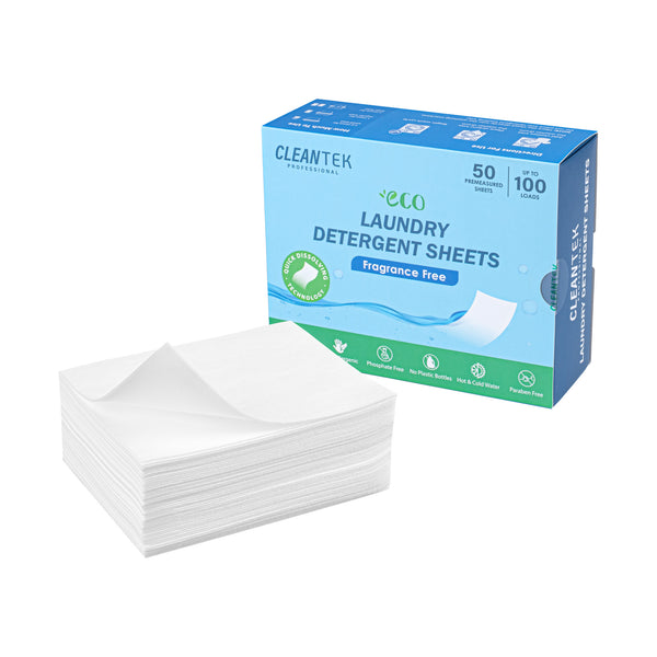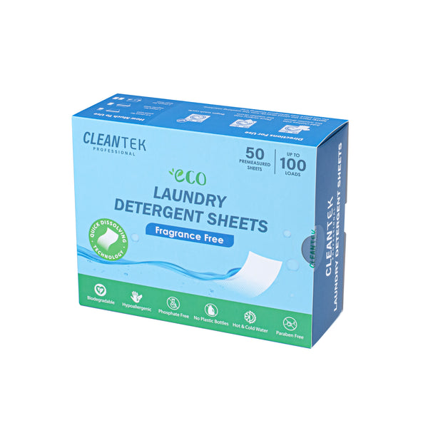 Elevate your laundry routine with our Clean Tek Professional Liquidless Laundry Detergent Sheets. These detergent laundry sheets are fragrance-free, perfect for sensitive skin and hypoallergenic needs. Biodegradable laundry sheets are designed to be eco-friendly, ensuring you contribute positively to the environment. Your clothes will love these detergent sheets as they soften fabric, reduce wrinkles, and eliminate stubborn stains, dirt, and odors. Ideal for everyday laundry, these laundry soap sheets are effective on cottons, linens, blends, and durable synthetics, while being safe for whites and all colors. Best laundry sheets for versatile use, they perform well in hot, cold, hard, or soft water. Easy to use, these detergent sheets provide the perfect amount with a simple one sheet for two loads application. Gentle on skin, these hypoallergenic laundry sheets offer a safe and effective clean for your clothes. These laundry sheets dissolve completely in both hot and cold water, delivering powerful cleaning results every time. Measuring 5.71 inches in length by 4.33 inches in width these compact detergent sheets are convenient to store. Each box contains 50 detergent sheets.