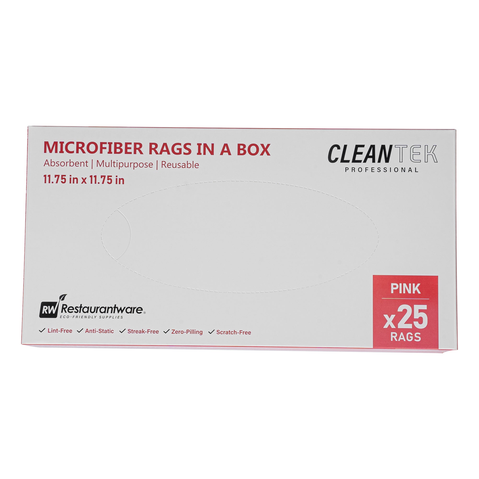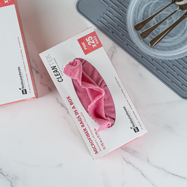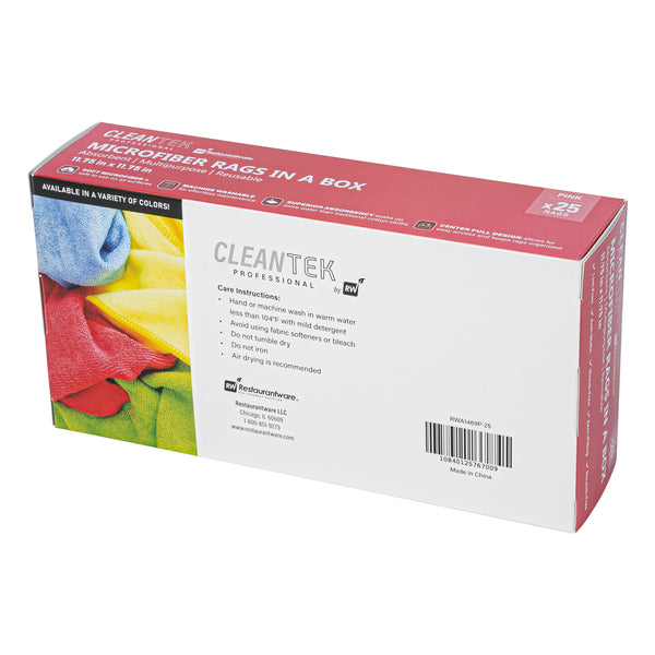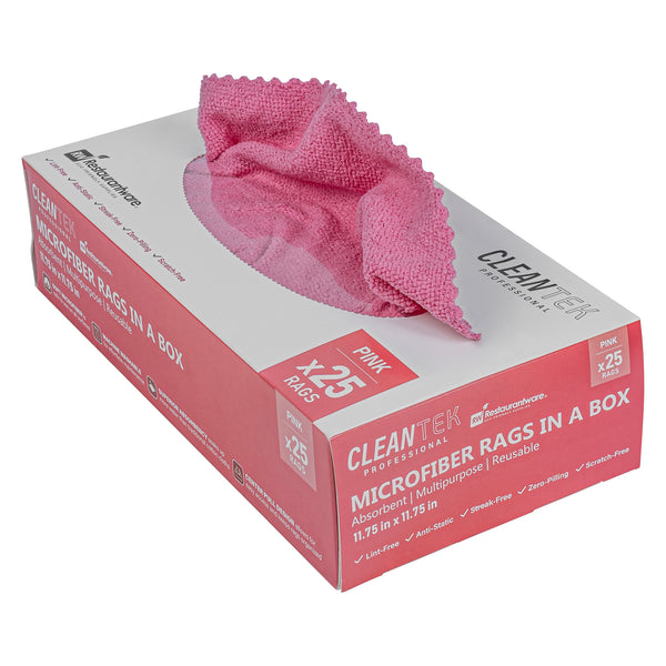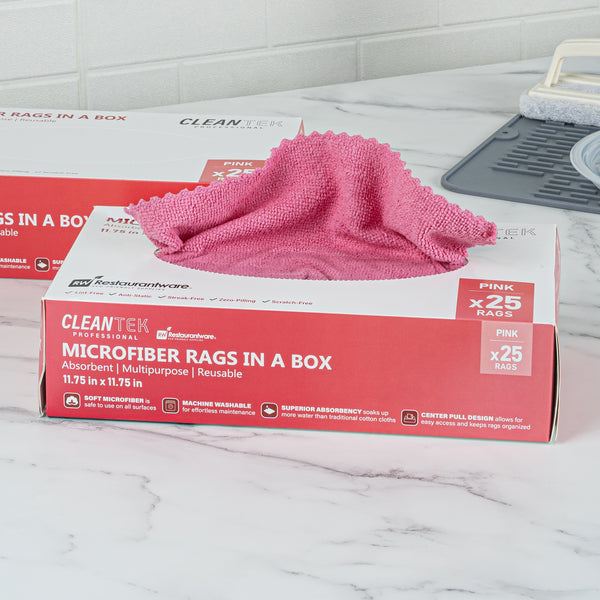 Elevate your cleaning routine with our Clean Tek Professional Pink Microfiber Rags In A Box. These microfiber rags come packaged in a dispenser box, allowing for easy dispensing and quick access, making them perfect for various cleaning tasks. Crafted from a blend of polyester and polyamide microfibers, these cleaning cloths are durable and thoroughly clean windows without leaving streaks. To effortlessly tackle spills and dry surfaces without any streaks, these car drying towels are highly absorbent. Ideal for a wide range of tasks, these multipurpose cleaning rags are perfect for dusting, wiping surfaces, polishing, and absorbing spills. With seamless wavy edges, these microfiber cleaning cloths ensure scratch-free cleaning and polishing, making them ideal for delicate surfaces and achieving a flawless finish. Easily identifiable with a pink finish, these drying cloths minimize the risk of mix-ups and ensure efficient use for specific tasks. Measuring 11.81 inches in length by 11.81 inches in width, these microfiber cloths provide ample surface area for comprehensive cleaning. Each order includes 250 rags.