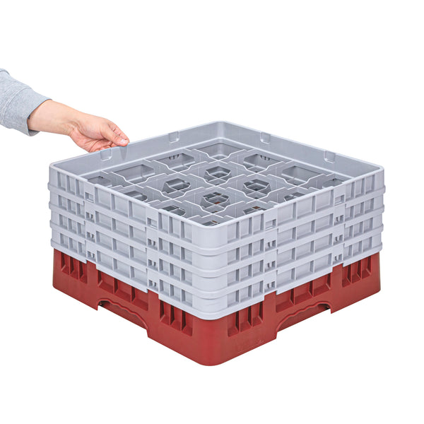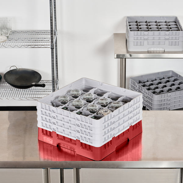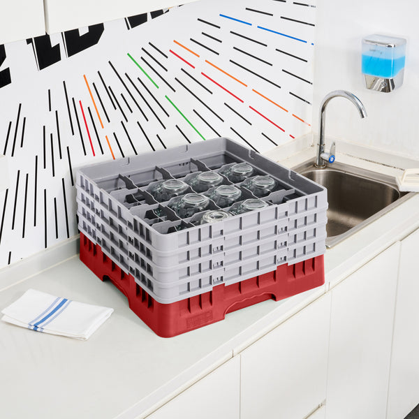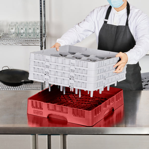 Enhance your kitchen's efficiency with our Clean Tek Professional Red Glass Rack, designed for optimal glassware storage and organization. Featuring 16 compartments, this commercial glass rack provides ample space for securely holding a variety of glassware. With a durable PP construction, this dishwasher rack withstands the rigors of frequent use in bustling foodservice settings. The easy-to-handle design of this compartment rack ensures seamless integration into your daily operations, while the open interior compartments allow for quick and easy placement and removal of barware. Solid external walls offer added protection, ensuring that your glassware remains safe and intact during transport and cleaning. Equipped with one full drop extender and three half drop extenders, this barware organizer can be customized to accommodate various glass heights and shapes. Measuring 19.69 inches in length by 19.69 inches in width by 10.51 inches in height, this glass rack is perfectly sized to fit standard dishwasher models, maximizing your kitchen's productivity. Sold in a 1 count box.