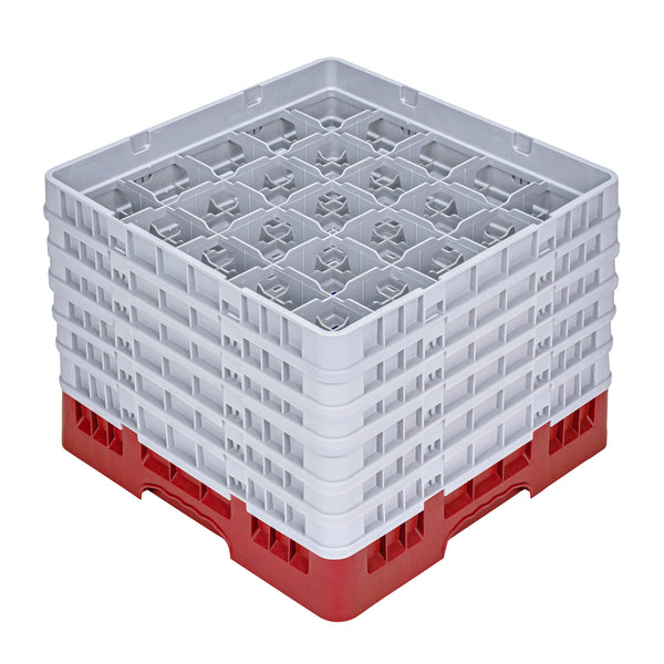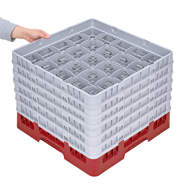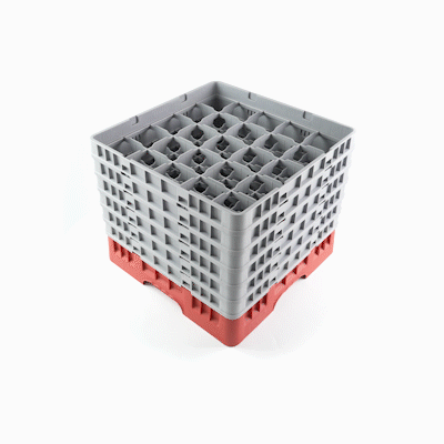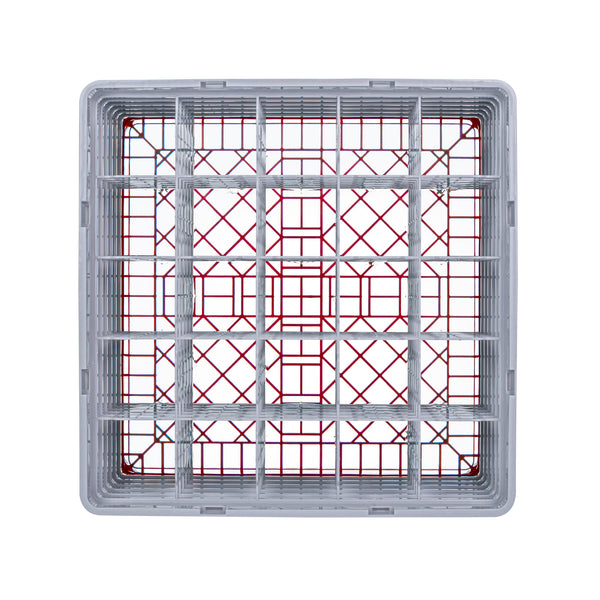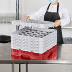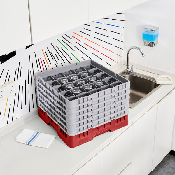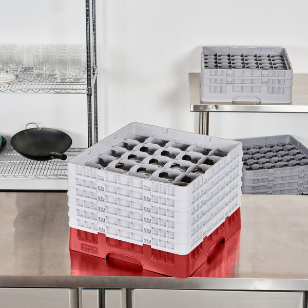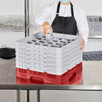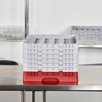 Efficiently organize your glassware with our Clean Tek Professional Red Glass Rack. Designed with 25 compartments, this glassware storage rack ensure each glass is securely held in place. Featuring one full drop extender and five half drop extenders, this dishwasher rack offers customizable height to accommodate various glass sizes. Made from durable PP, this compartment rack is built to withstand the demands of busy commercial kitchens. The easy-to-handle design of this barware organizer makes loading and unloading simple and quick. With open interior compartments, this commercial glass rack promotes thorough cleaning and drying of glassware. Solid external walls provide additional stability and protection during transport and storage. Measuring 19.69 inches in length by 19.69 inches in width by 13.74 inches in height, this rack is perfect for maximizing space in dishwashing areas. Sold in a 1 count box.