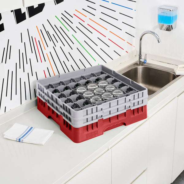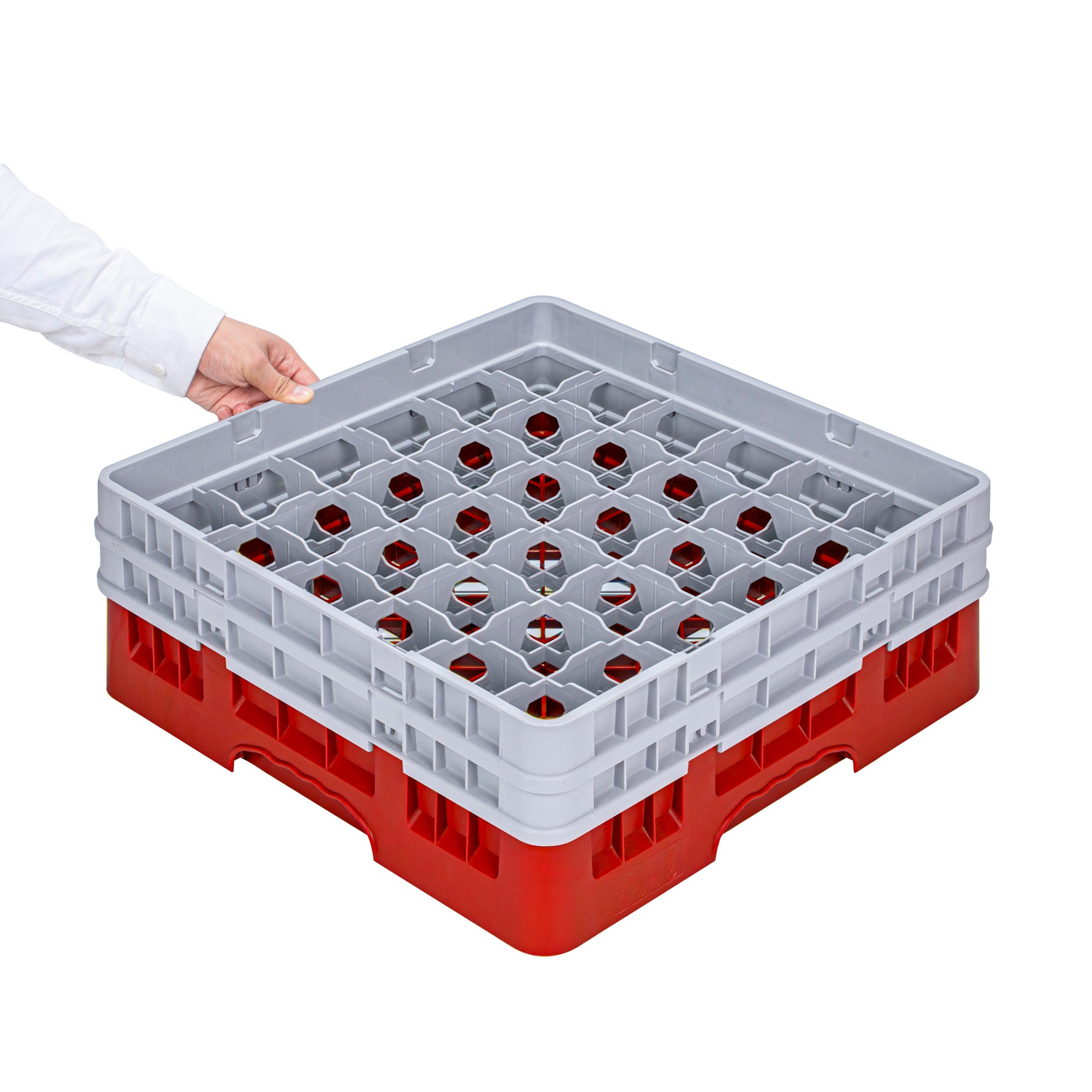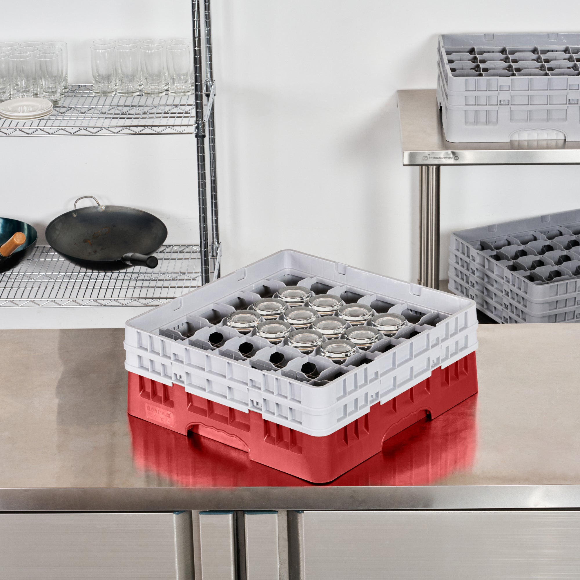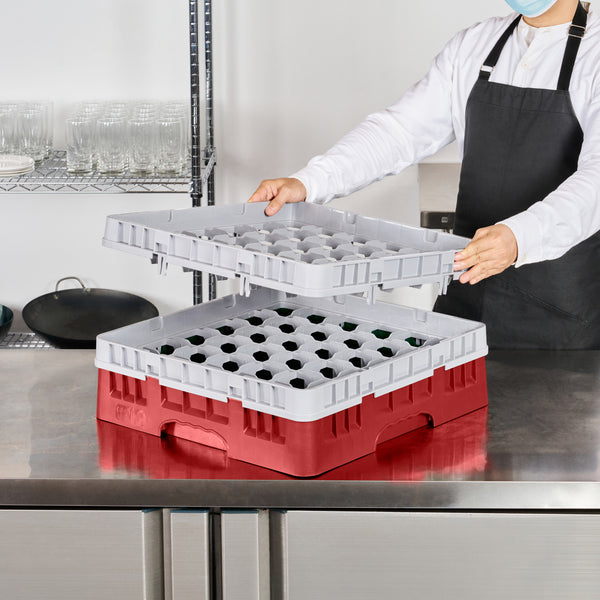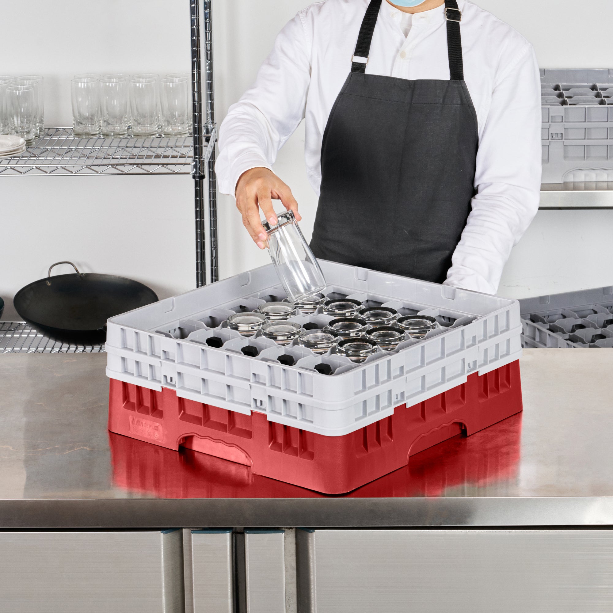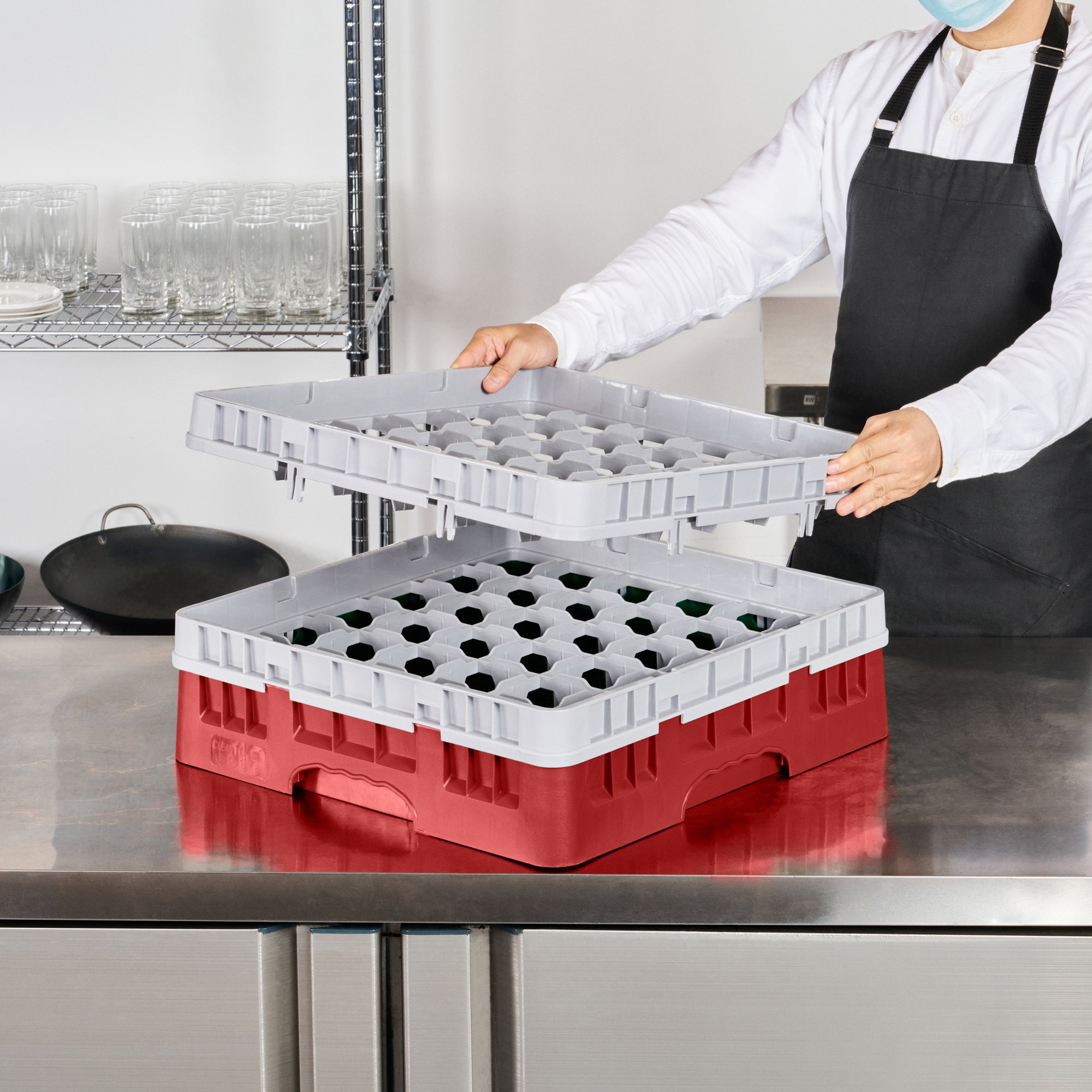 Optimize your glassware storage with our Clean Tek Professional Red Glass Rack. This commercial glass rack boasts 36 compartments to keep your barware organized and secure. Featuring a full drop extender, this dishwasher rack easily accommodates taller glassware. With a half drop extender, this compartment rack offers versatile storage solutions for various glass sizes. Constructed from durable PP, this barware organizer ensures long-lasting use in busy kitchens. The easy-to-handle design of this glass rack makes loading and unloading a breeze. Open interior compartments allow for efficient water flow during washing, ensuring spotless results. Solid external walls provide additional stability and protection for your glassware collection. Measuring 19.69 inches in length by 19.69 inches in width by 7.24 inches in height, this commercial glass rack fits seamlessly into standard dishwashers. Sold in a 1 count box.