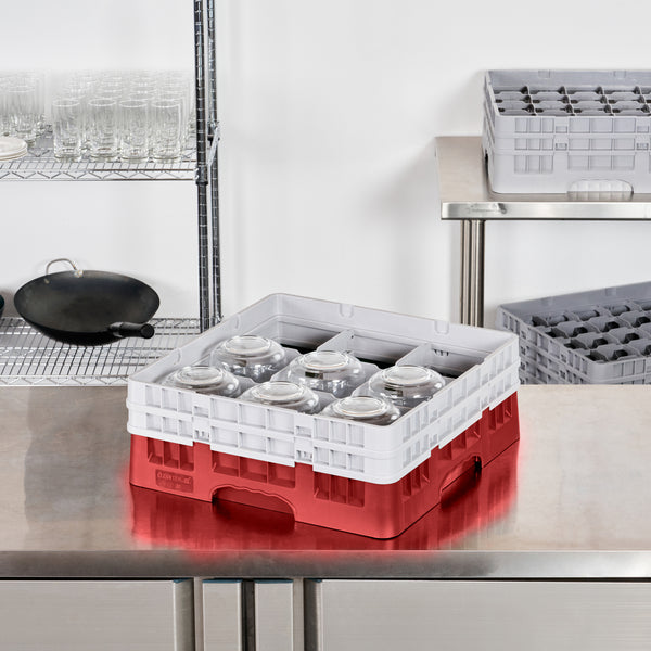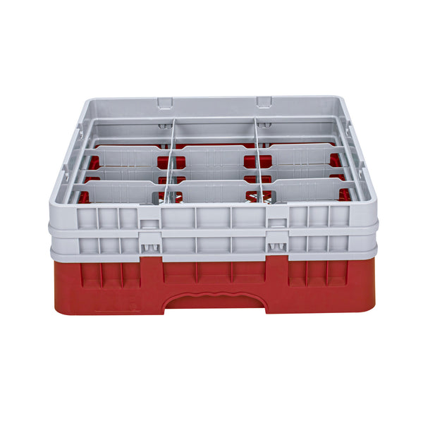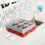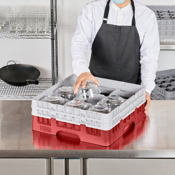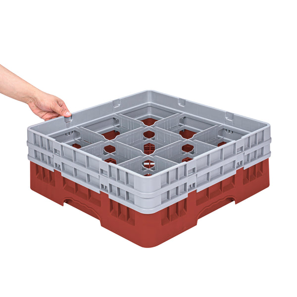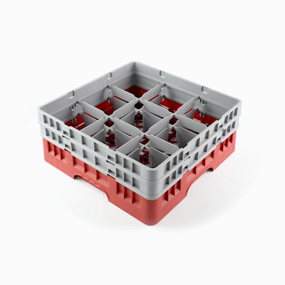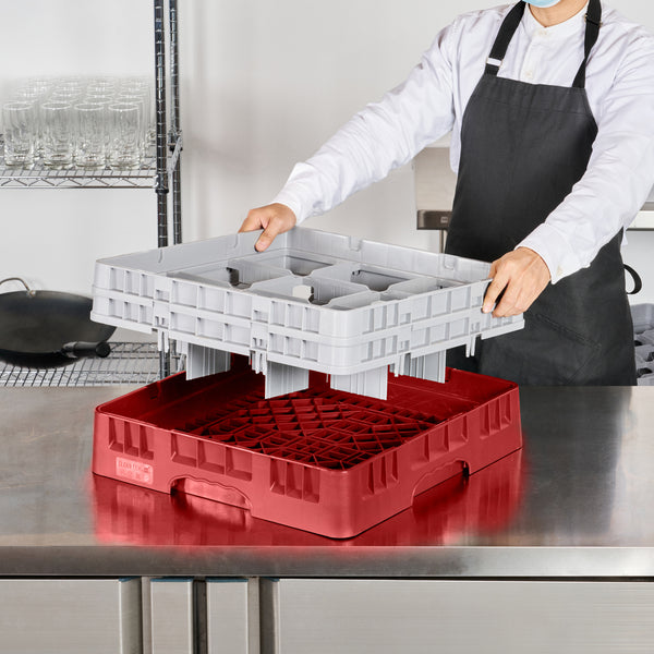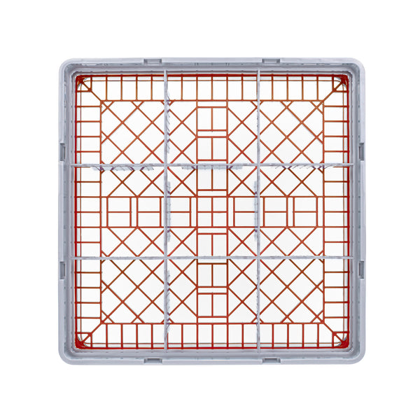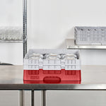 Our Clean Tek Professional Red Glass Rack is the ultimate solution for efficient glassware storage in busy foodservice settings. Designed with 9 compartments, this dishwasher rack offers ample space to securely store and transport various sizes of glasses. This glass rack features a full drop extender and a half drop extender, allowing for versatile adjustments to accommodate different glass heights. Made from durable PP, this compartment rack ensures long-lasting use and reliability in commercial kitchens and bars. The easy-to-handle design of this barware organizer simplifies loading and unloading, streamlining operations during peak service times. Featuring open interior compartments, this commercial glass rack promotes thorough cleaning and quick drying of glassware. The solid external walls of this rack provide additional protection and stability during transportation, making them a dependable choice for any establishment. Measuring 19.69 inches in length by 19.69 inches in width by 7.24 inches in height, this rack is designed to fit seamlessly into standard dishwashing setups. Sold in a 1 count box.