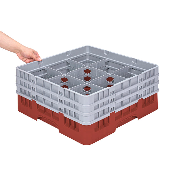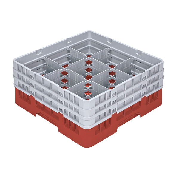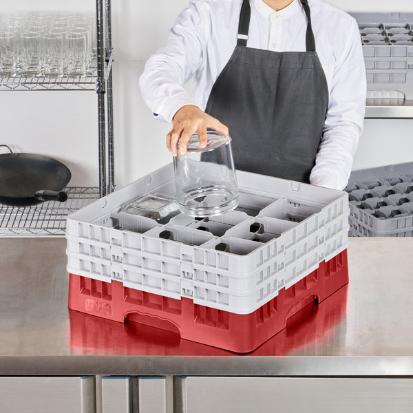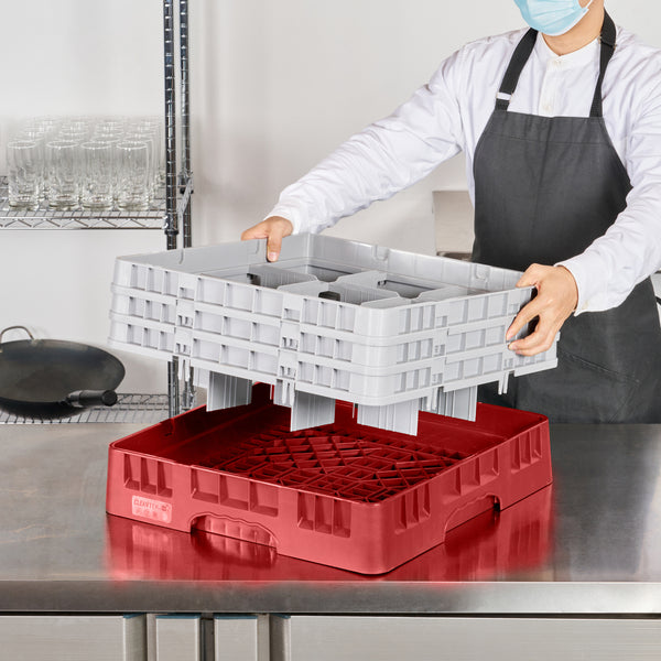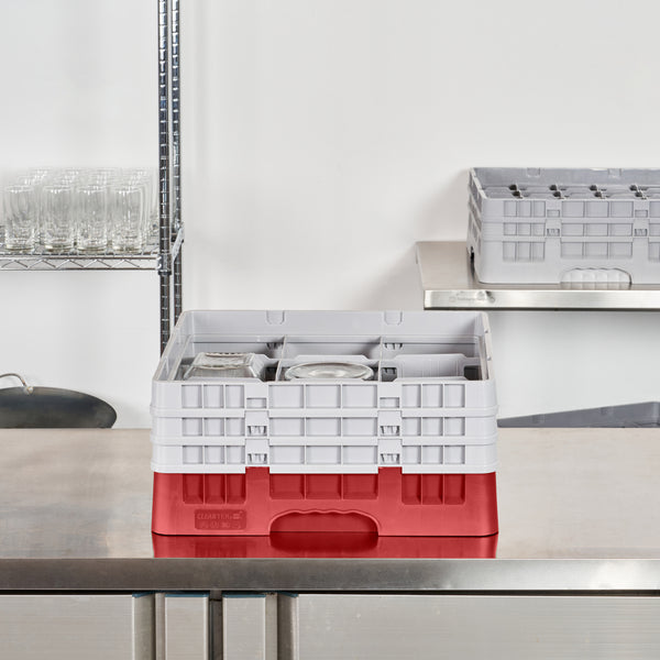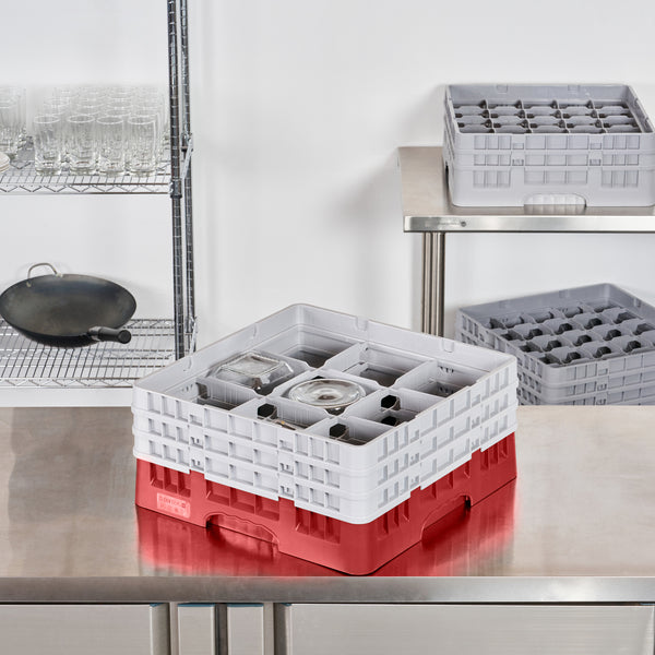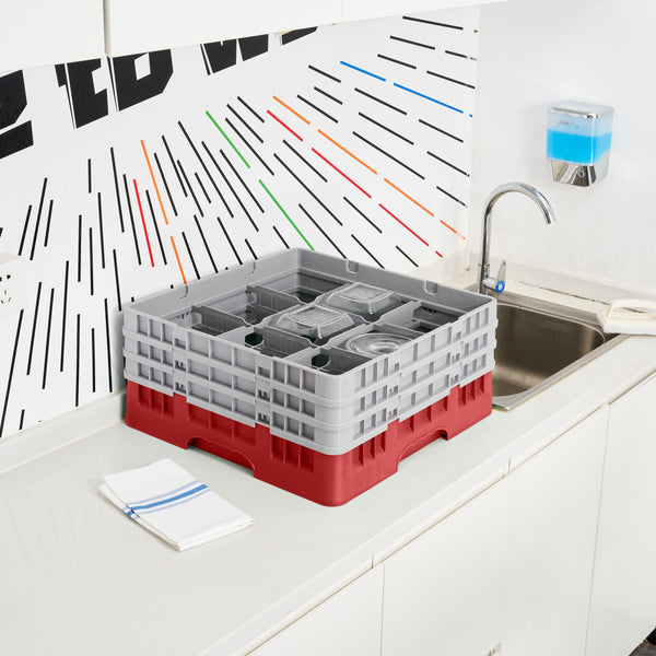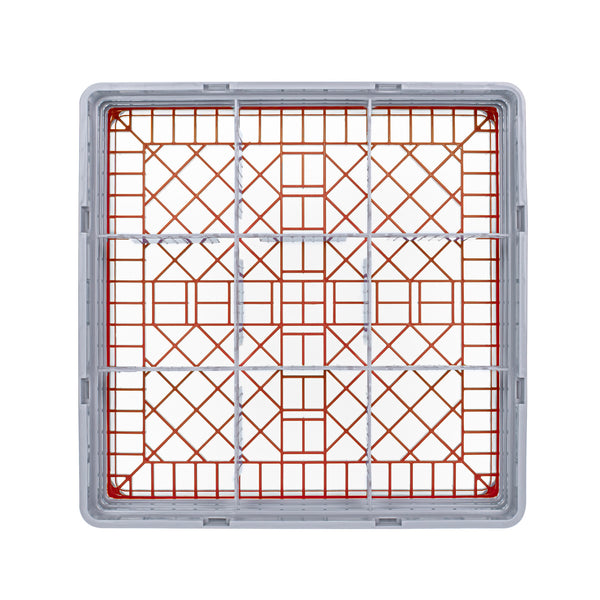 Optimize your glassware storage with our Clean Tek Professional Red Glass Rack. This dishwasher rack is designed with 9 compartments, ensuring your glassware is securely separated and organized. Featuring 1 full drop extender, this compartment rack adapts to various glass sizes, making it perfect for any barware organizer. Including 2 half drop extenders, this commercial glass rack offers additional customization for your storage needs. Constructed from durable PP, this rack ensures long-lasting use in any foodservice environment. With an easy-to-handle design, this glass rack simplifies the loading and unloading process. The open interior compartments provide excellent water circulation during washing, ensuring thorough cleaning. Meanwhile, the solid external walls of this rack offer superior protection for your valuable glassware. Measuring 19.69 inches in length by 19.69 inches in width by 8.86 inches in height, this rack is spacious yet compact enough to fit standard dishwasher sizes. Sold in a 1 count box.
