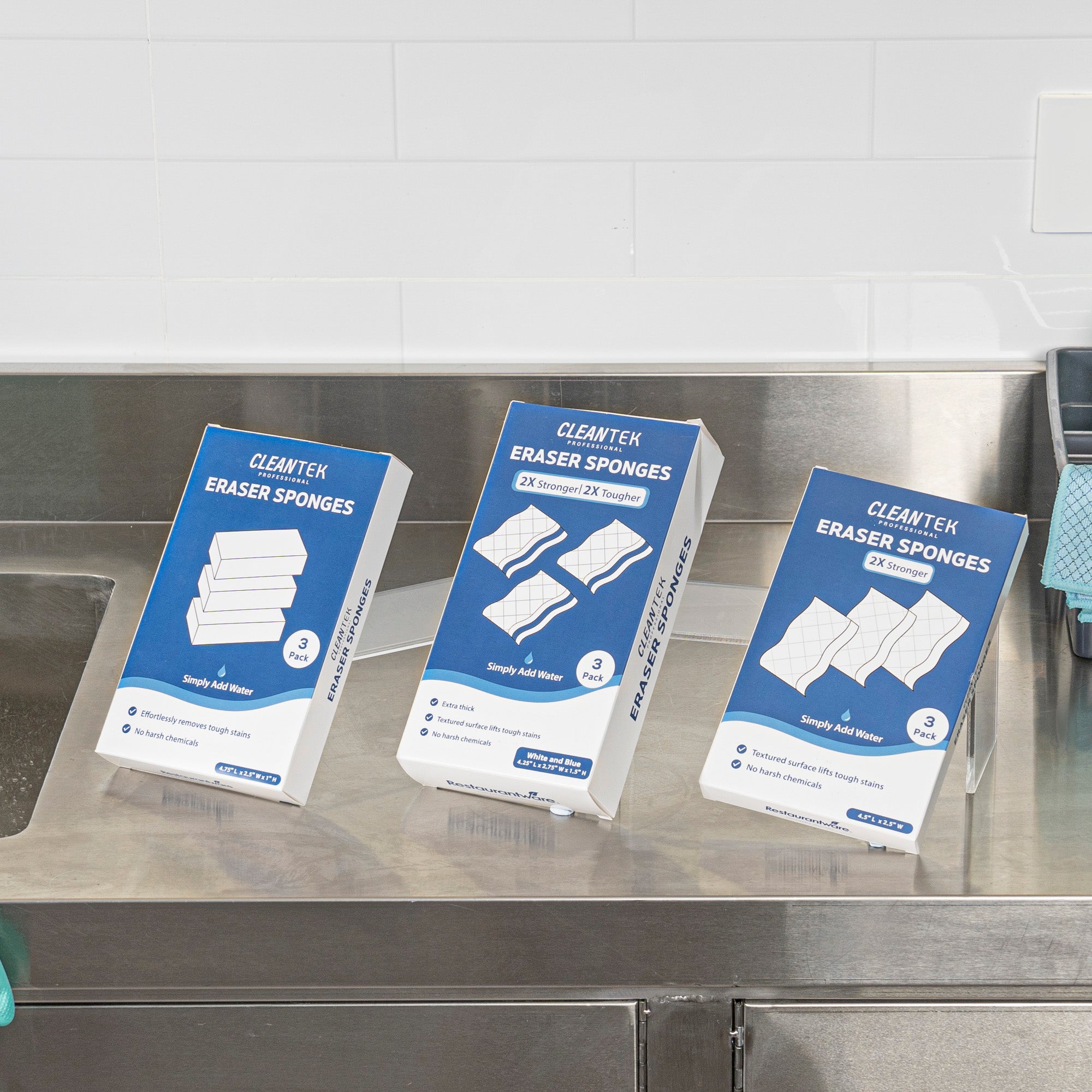 Effortlessly tackle stubborn stains with the Clean Tek Professional Stain-Remover Sponge Eraser. This sponge eraser is designed to eliminate tough stains with ease, ensuring your cleaning process is swift and effective. Made from durable plastic, this versatile melamine cleaning sponge is perfect for use on walls, floors, doors, baseboards, and appliances, offering unmatched flexibility in your cleaning routine. Its compact size, measuring 4.33 inches in length, fits into tight spaces, making it an ideal stain remover sponge for efficient use in any commercial kitchen or dining setting. Enhance the cleanliness and appearance of your establishment with this indispensable cleaning tool. Each order includes 60 Clean Tek Professional Stain-Remover Sponge Erasers.