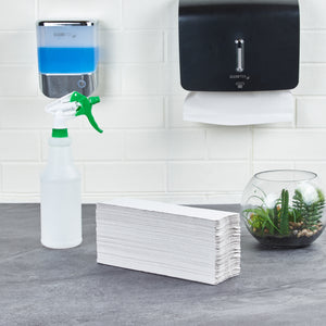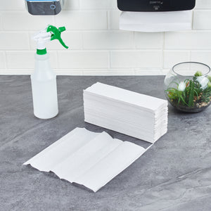 Wipe away huge liquid messes in a jiffy with our Clean Tek Professional White C-Fold Paper Towels. Made using virgin paper pulp, these paper towels are durable and will not tear easily when wiping spills. These 1-ply paper towels with an embossed texture ensure that no drop of water is left behind. The C-fold design of these bathroom paper towels reduces excess consumption since it only allows one napkin to be dispensed at a time. These C-fold paper towels, with their sleek fold, perfectly fit inside our C-fold / M-fold paper towel dispensers (SKU: RWT1189B & SKU: RWT1189W). To make post-event cleanups easier, these embossed paper towels are disposable. These paper napkins are not interlocked and can be used as individual tissues, allowing you to keep them on tables for outdoor events. Measuring 11.5 inches long by 9.5 inches wide when unfolded, and 3.25 inches wide when folded, these white paper towels allow easy placement into dispensers and save space while storing. Shipped in a 200 count box. Dispensers are available and sold separately.