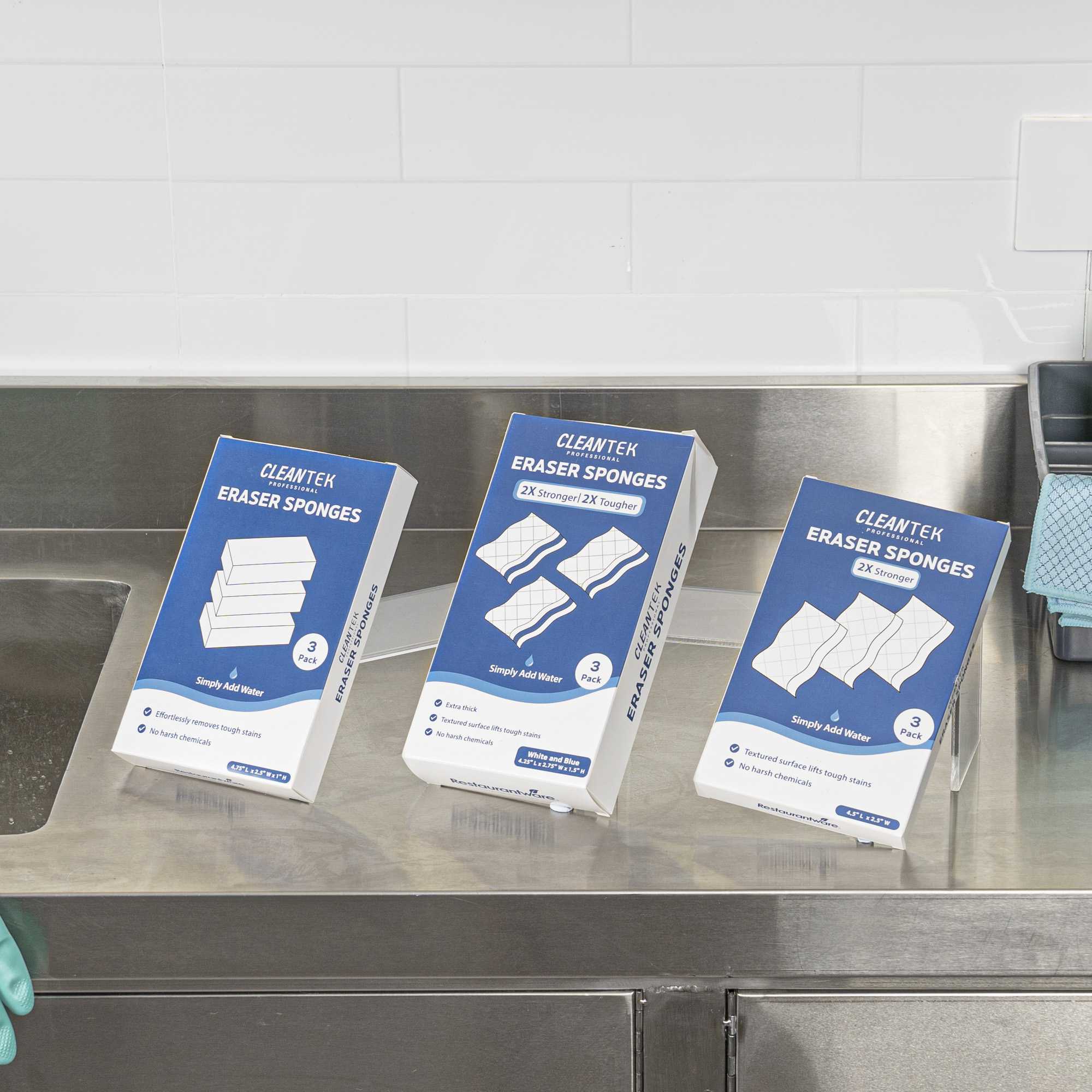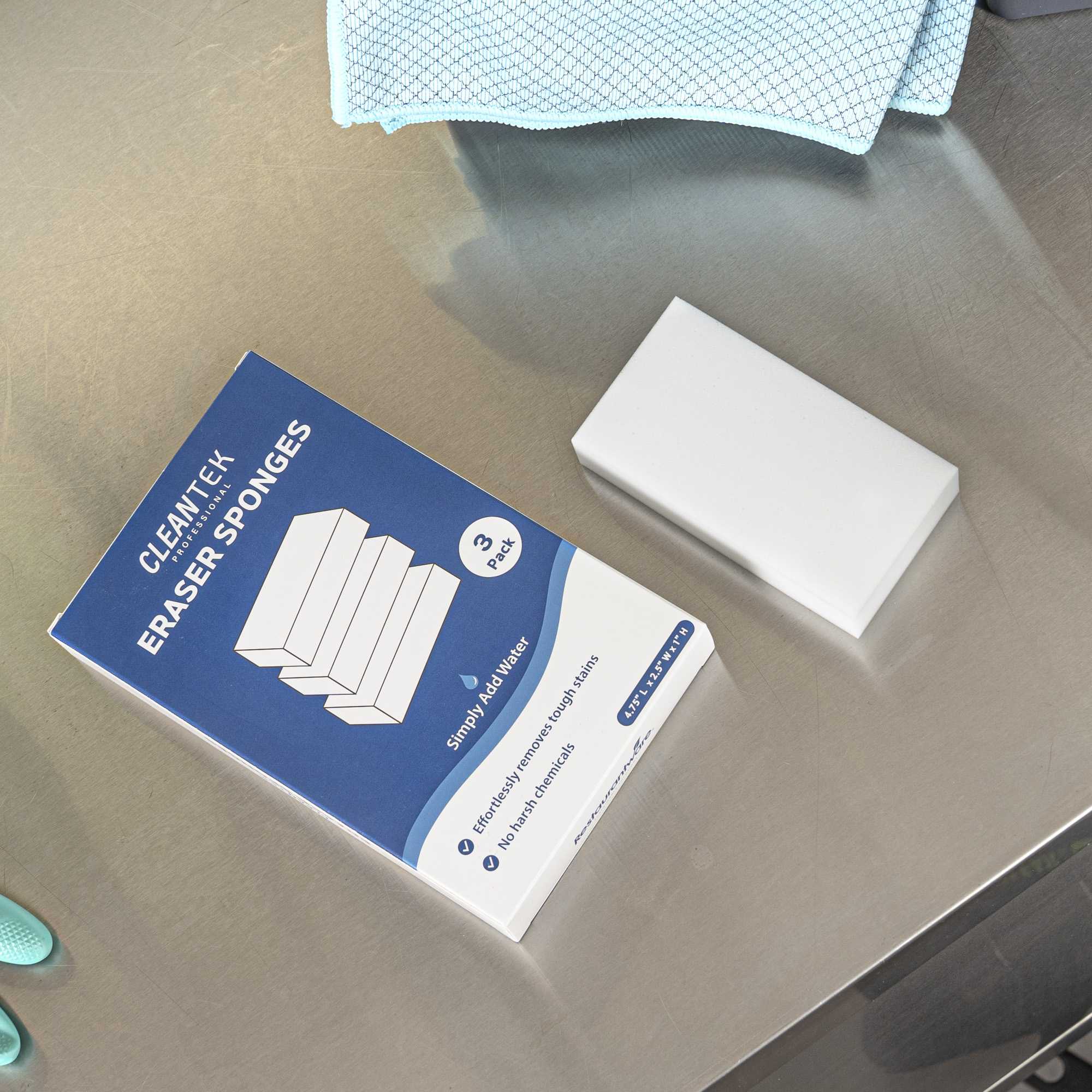 Effortlessly tackle tough stains with our versatile cleaning solution. The Clean Tek Professional Melamine Foam Sponge is expertly designed to eliminate tough stains with ease, providing a quick cleanup for busy establishments. This melamine sponge, made from durable plastic, is water-activated, making it an effective eraser for various surfaces like walls, floors, doors, baseboards, and appliances. Its compact size of 4.72 inches in length ensures it fits seamlessly into tight spaces, enhancing its ability as a stain remover sponge in any commercial kitchen or dining area. The white color of the sponge indicates cleanliness and ensures dirt visibility for thorough cleaning. Elevate your maintenance routine with this essential cleaning tool, optimizing your cleaning efficiency. Each order includes 3 Clean Tek Professional Melamine Foam Sponges.