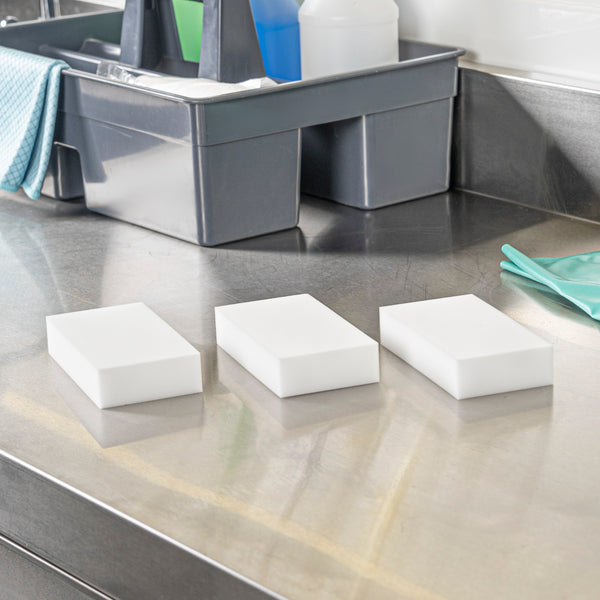 Effortlessly tackle tough stains with our versatile cleaning solution. The Clean Tek Professional Melamine Foam Sponge is expertly designed to eliminate tough stains with ease, providing a quick cleanup for busy establishments. This melamine sponge, made from durable plastic, is water-activated, making it an effective eraser for various surfaces like walls, floors, doors, baseboards, and appliances. Its compact size of 4.72 inches in length ensures it fits seamlessly into tight spaces, enhancing its ability as a stain remover sponge in any commercial kitchen or dining area. The white color of the sponge indicates cleanliness and ensures dirt visibility for thorough cleaning. Elevate your maintenance routine with this essential cleaning tool, optimizing your cleaning efficiency. Each order includes 60 Clean Tek Professional Melamine Foam Sponges.