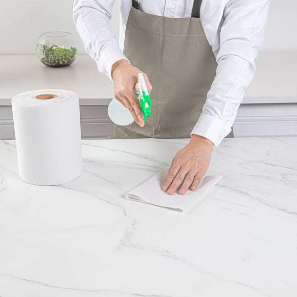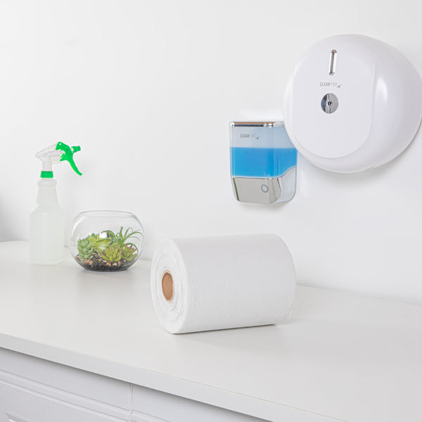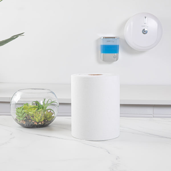 Efficiently wipe hands with our Clean Tek Professional White Paper Towel Roll. Manufactured from hardwound paper, this 1-ply kitchen paper towel is soft yet durable enough not to tear easily when wiping wet hands. The non-perforated design of this kitchen tissue roll allows your guests to tear off only the required amount of tissue instead of a predetermined length to avoid wastage. This hardwound paper towel has an embossed structure for added absorbency to easily wipe off messes and liquid spills. The 600-foot length of this disposable white paper towel is ample for busy places and high-volume businesses. This bathroom paper towel has a 2-inch diameter core, making it compatible with our automatic paper towel dispensers (SKU: RWT1187B & SKU: RWT1188W). Measuring 6.25 inches in diameter by 8 inches in width, this embossed paper towel is perfect to be used in kitchens, restrooms, and hand washing stations. Shipped in a 1 count box. Dispensers are available and sold separately.