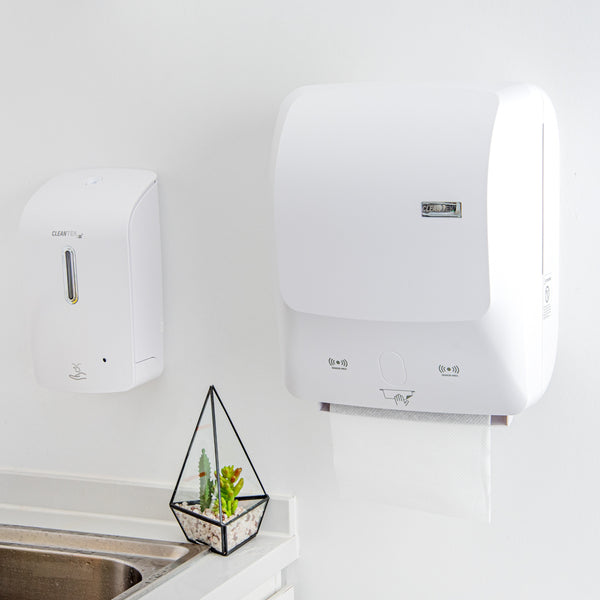 Provide a touch-free towel dispensing experience with our Clean Tek Professional White Plastic 8" Hands-Free Autocut Paper Towel Roll Dispenser. Crafted from top-notch ABS plastic, this bathroom roll dispenser is built to withstand heavy everyday usage. Boasting a motion sensor, this automatic hand towel dispenser offers a touchless experience, minimizing the spread of germs. The control panel of this touchless paper towel dispenser lets you adjust the towel length to three different sizes. This tissue paper dispenser precisely cuts sheets at a consistent length automatically, avoiding product wastage. The lock system ensures that the mountable paper towel roll dispenser remains tamperproof. With LED indicators, this tissue roll dispenser alerts you when the battery is low or when the napkins need to be refilled. This dispenser can be powered by either an AC or DC power supply using a power adaptor or four D-sized batteries. Measuring 12 inches long by 8.75 inches wide by 15.5 inches tall, this dispensing machine is compatible with our 8-inch paper towel rolls (SKU: RWA1192K & SKU: RWA1192W). Shipped in a 1 count box. Paper towel rolls are available and sold separately. Power adapter and batteries are not included.