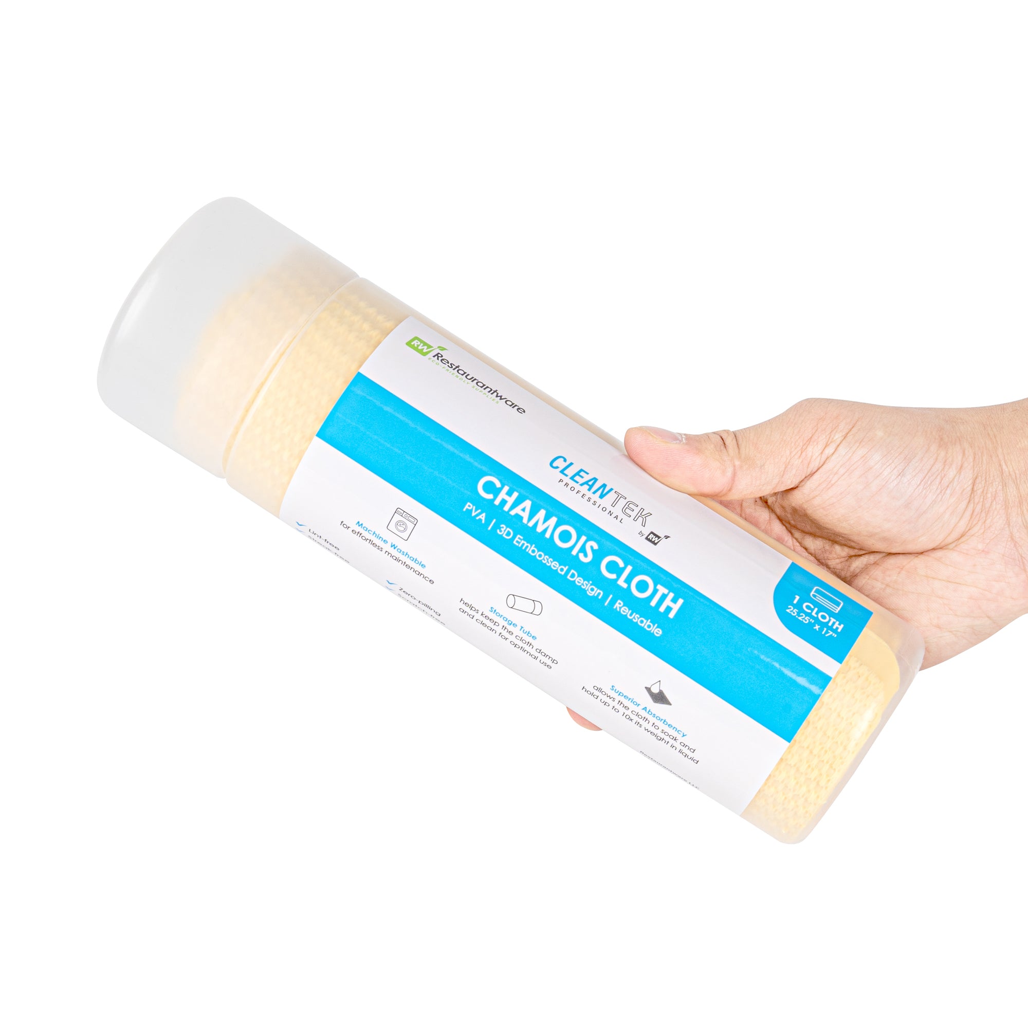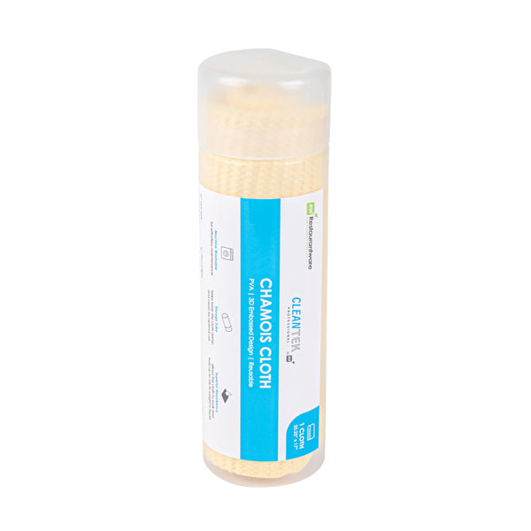 Elevate your cleaning routine with our Clean Tek Professional Yellow 3D Chamois Cloths. Crafted from PVA microfiber, these cleaning cloths harden when they dry and discourage bacterial growth, preserving the cleanliness of your space. The unique 3D texture of these cleaning rags adds depth to their surface for an improved grip, enhancing both control and efficiency during cleaning tasks. These chamois cloths have a plastic storage tube for storage, ensuring they stay damp and clean for future use. Each cleaning towel is highly-absorbent, making it adept at quickly soaking up liquids and tackling various cleaning applications. These wiping rags excel in a variety of cleaning tasks, proving to be a practical and efficient solution for diverse surfaces and applications. Featuring a lint-free material, these car wash towels leave a spotless and glossy finish, eliminating the concern of residual fibers. With a zero-pilling design, these yellow cleaning cloths reduce the chance of forming lint balls, ensuring a lasting use in foodservice establishments as well as at home. Ideal tending to polished surfaces, these wiping cloths are scratch-free, ensuring a gentle yet effective cleaning process. These chamois towels are machine washable, making them easy to maintain and reuse. The bright yellow hue of these multipurpose cleaning cloths facilitates easy identification to avoid mix-ups and confusion. Measuring 25.25 inches in length by 17 inches in width, these dusting cloths offer extensive coverage for all your cleaning needs. Sold in a 20 count box.
